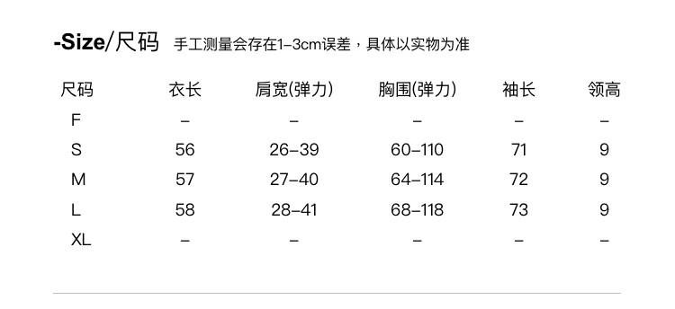 衣長/肩寬/袖長為平量,其他為一圈(單位:公分)
