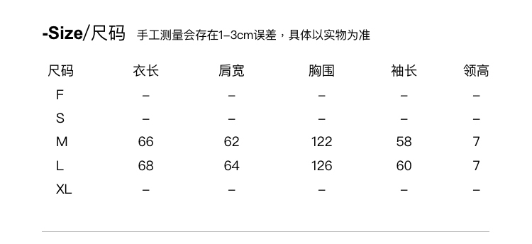 衣長/肩寬/袖長為平量,其他為一圈(單位:公分)