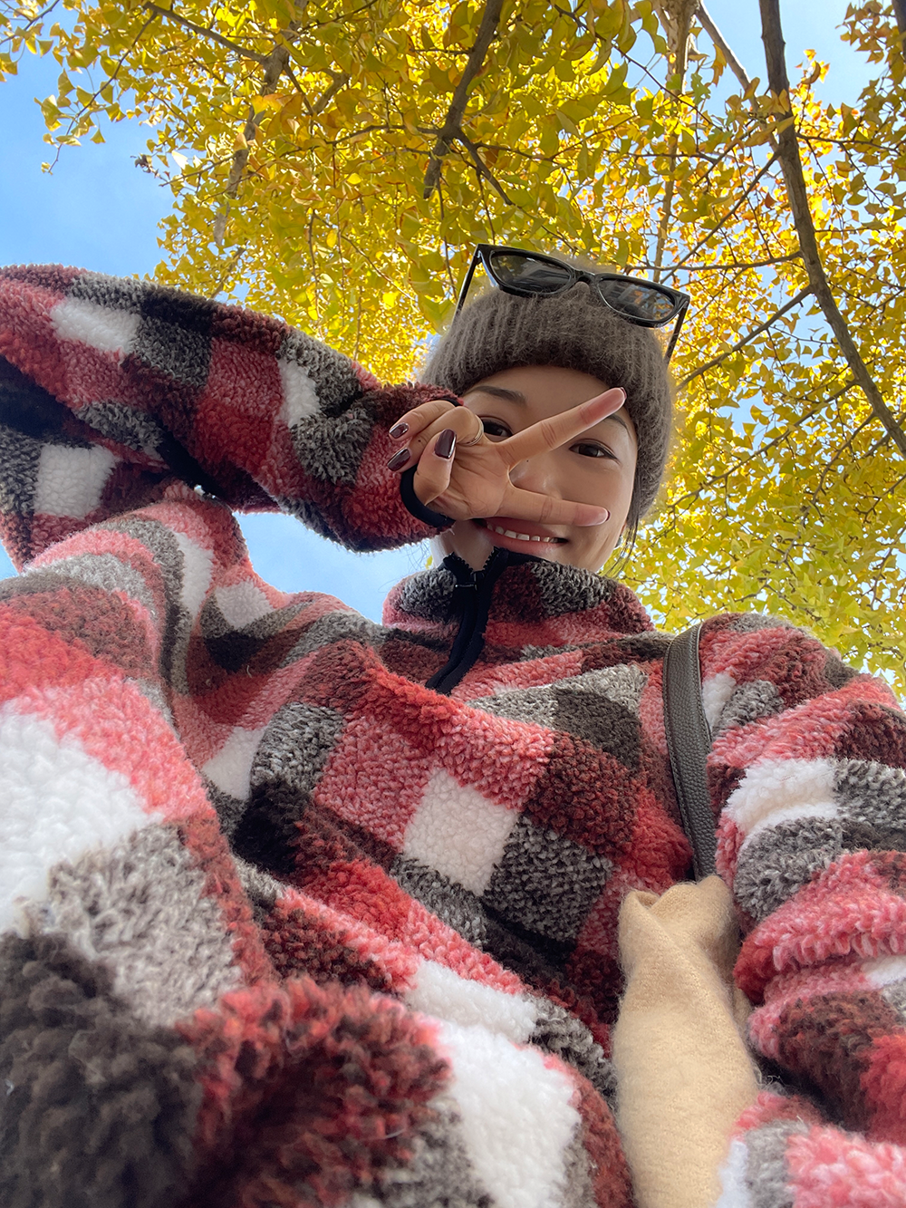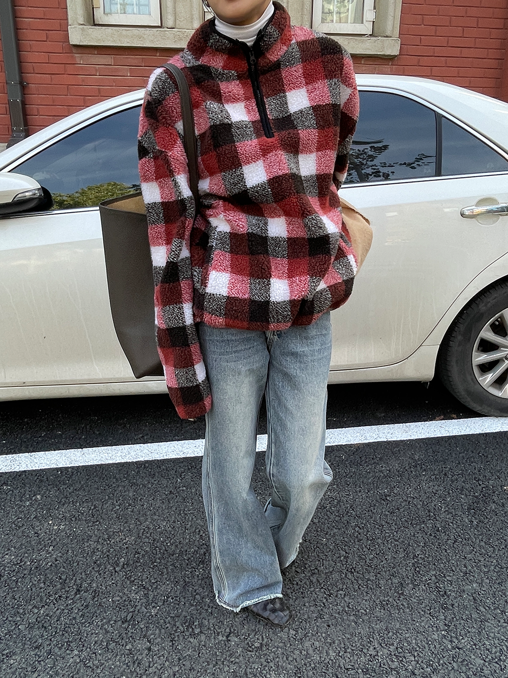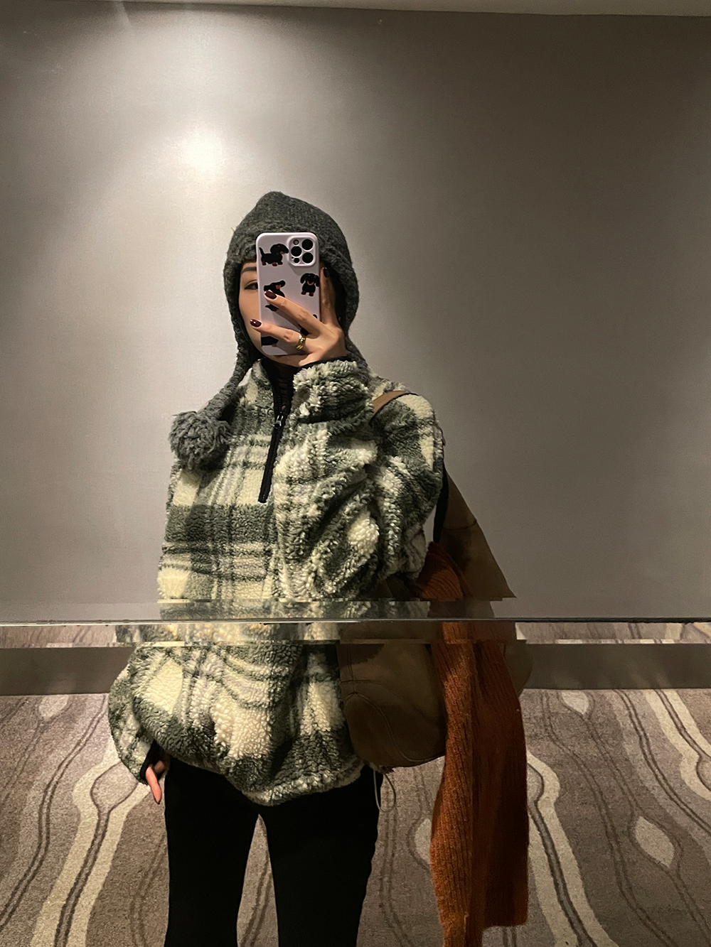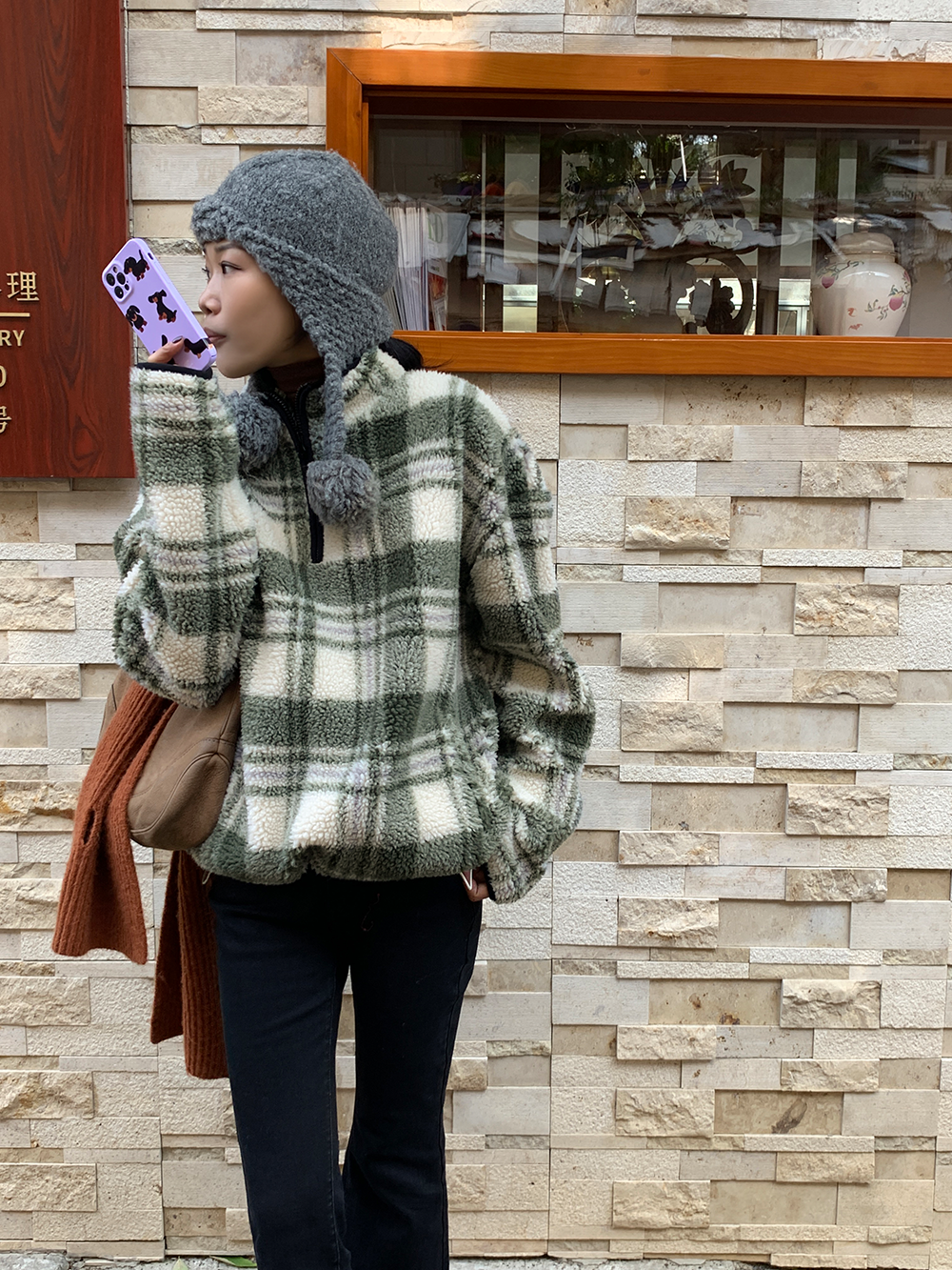 *o-ha-you*【FLCT1732】格紋搖粒絨衛衣秋冬季2023新款復古休閒寬鬆長袖加厚套頭上衣-2色-如有需要請先諮詢