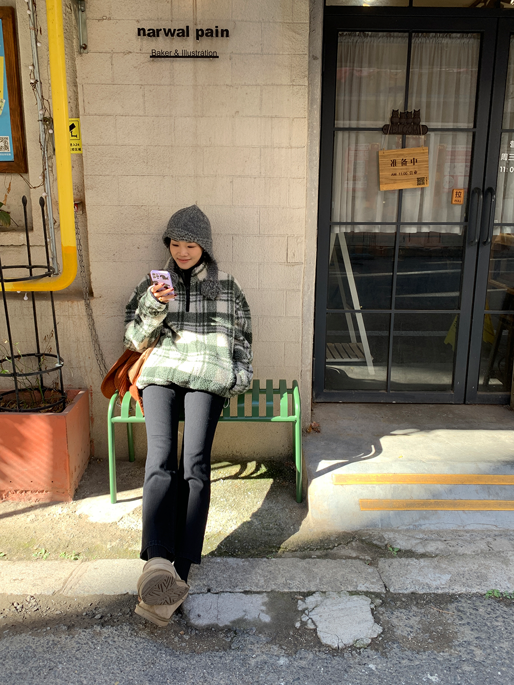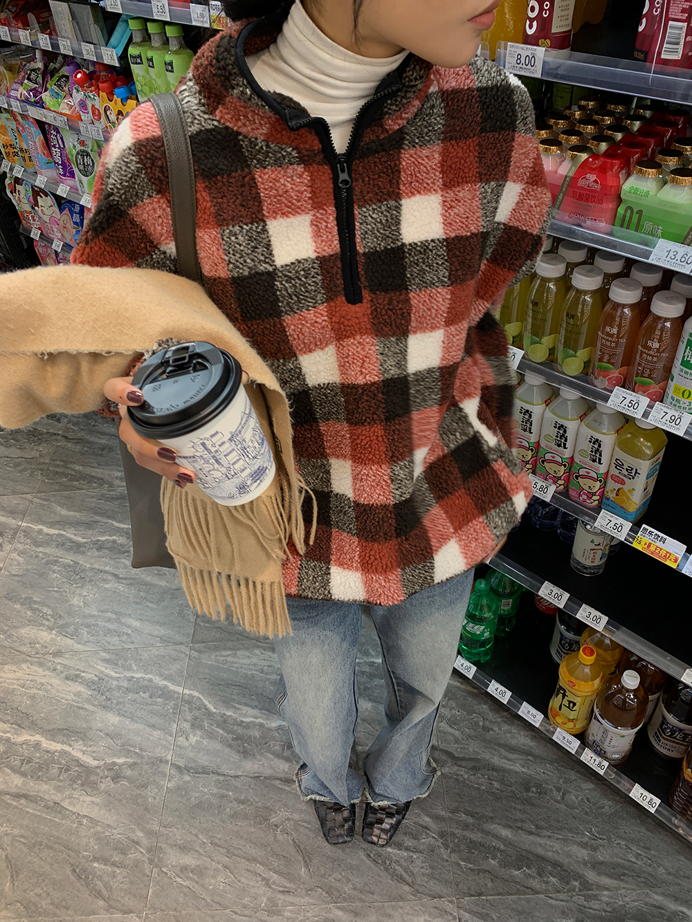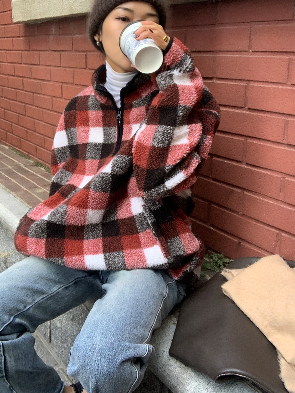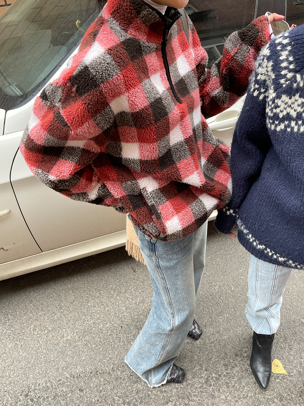 *o-ha-you*【FLCT1732】格紋搖粒絨衛衣秋冬季2023新款復古休閒寬鬆長袖加厚套頭上衣-2色-如有需要請先諮詢
