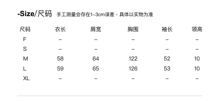 衣長/肩寬/袖長為平量,其他為一圈(單位:公分)