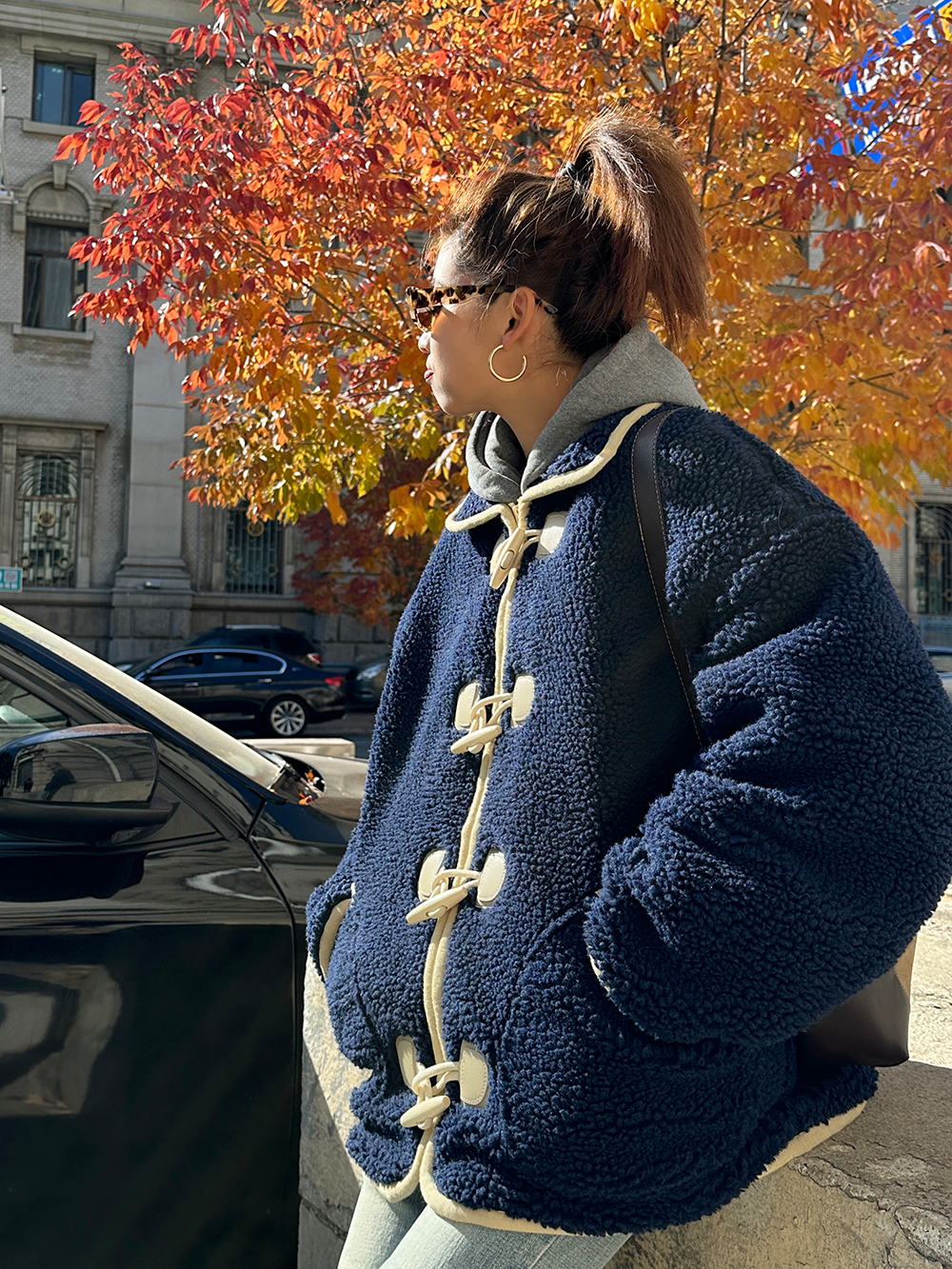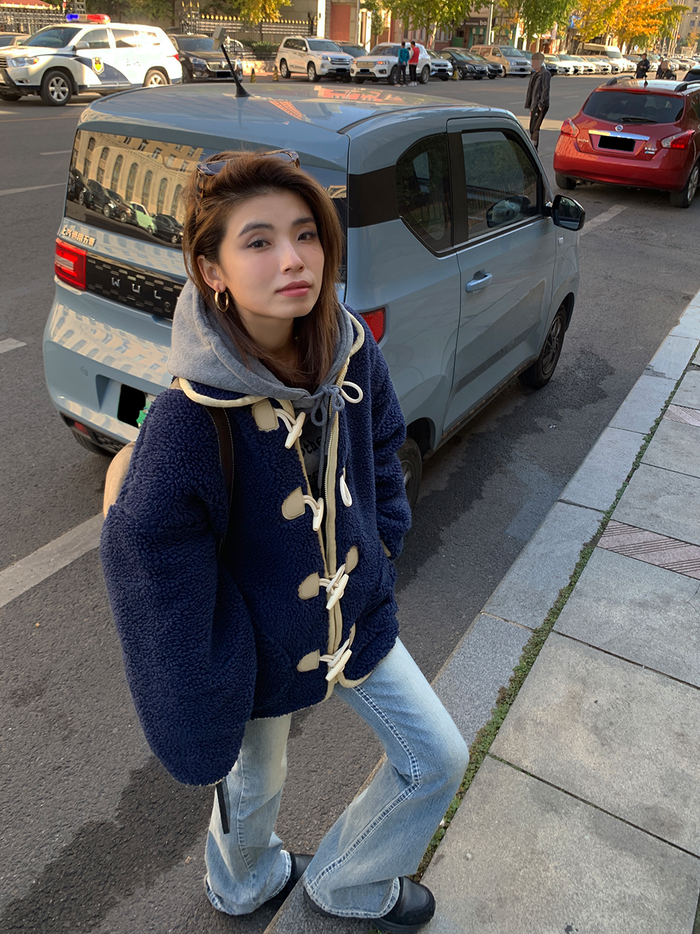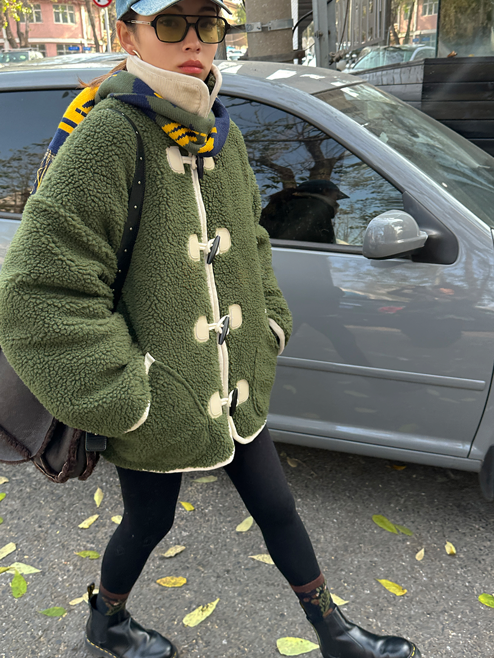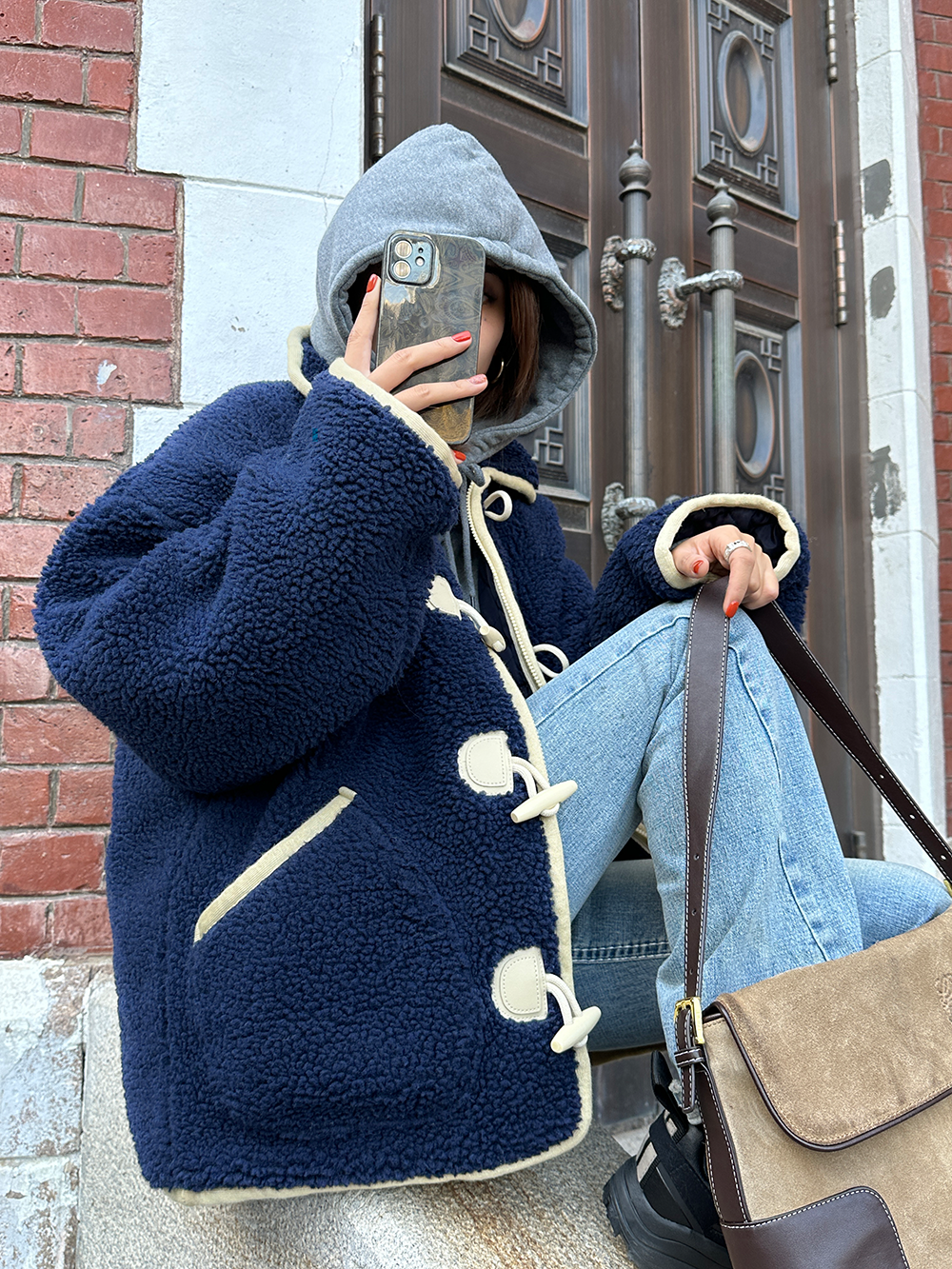 *o-ha-you*【FLCT1784】牛角扣羊羔毛夾棉外套2023新款冬季保暖加厚復古寬鬆棉衣棉服-2色-如有需要請先諮詢
