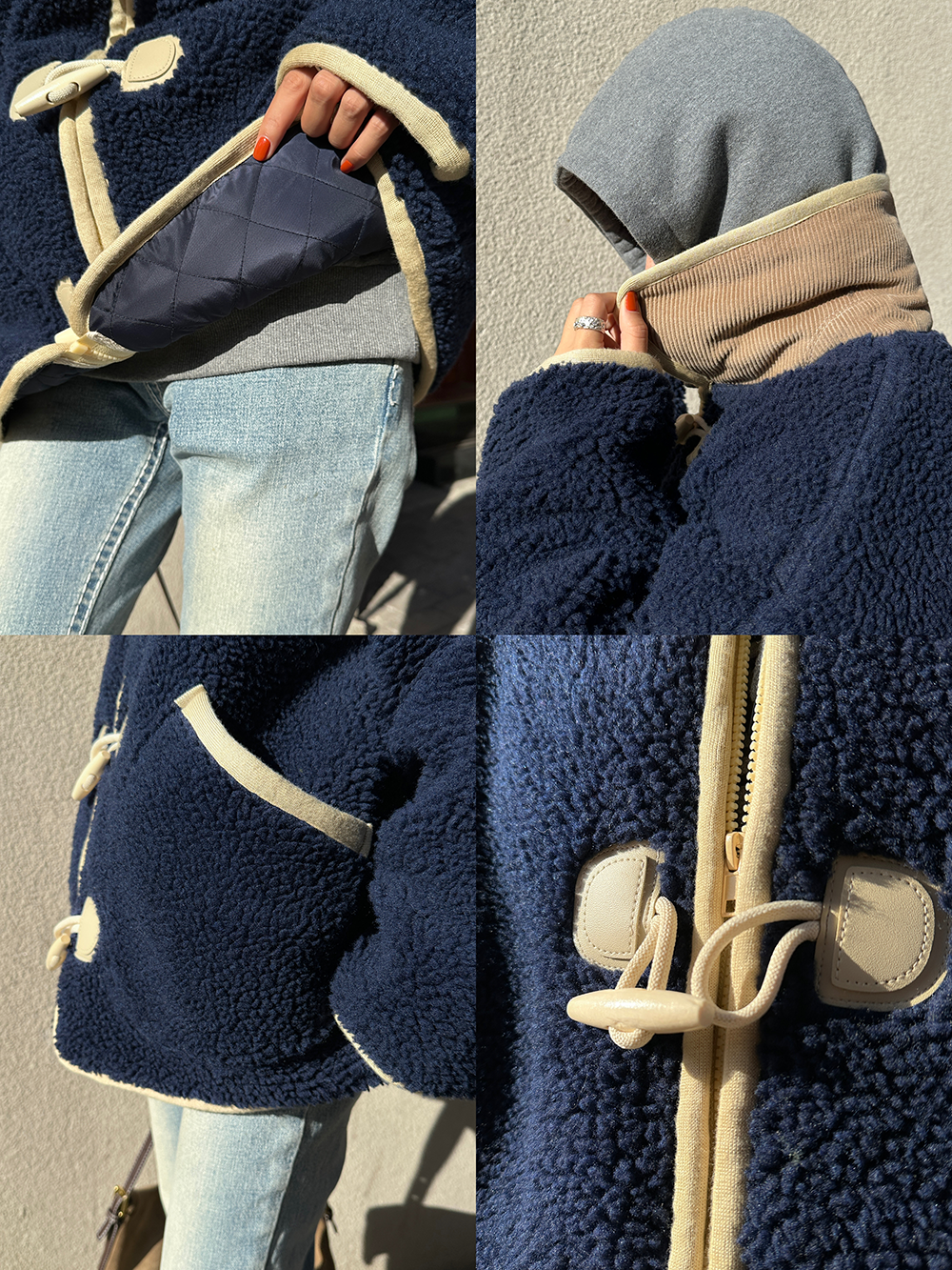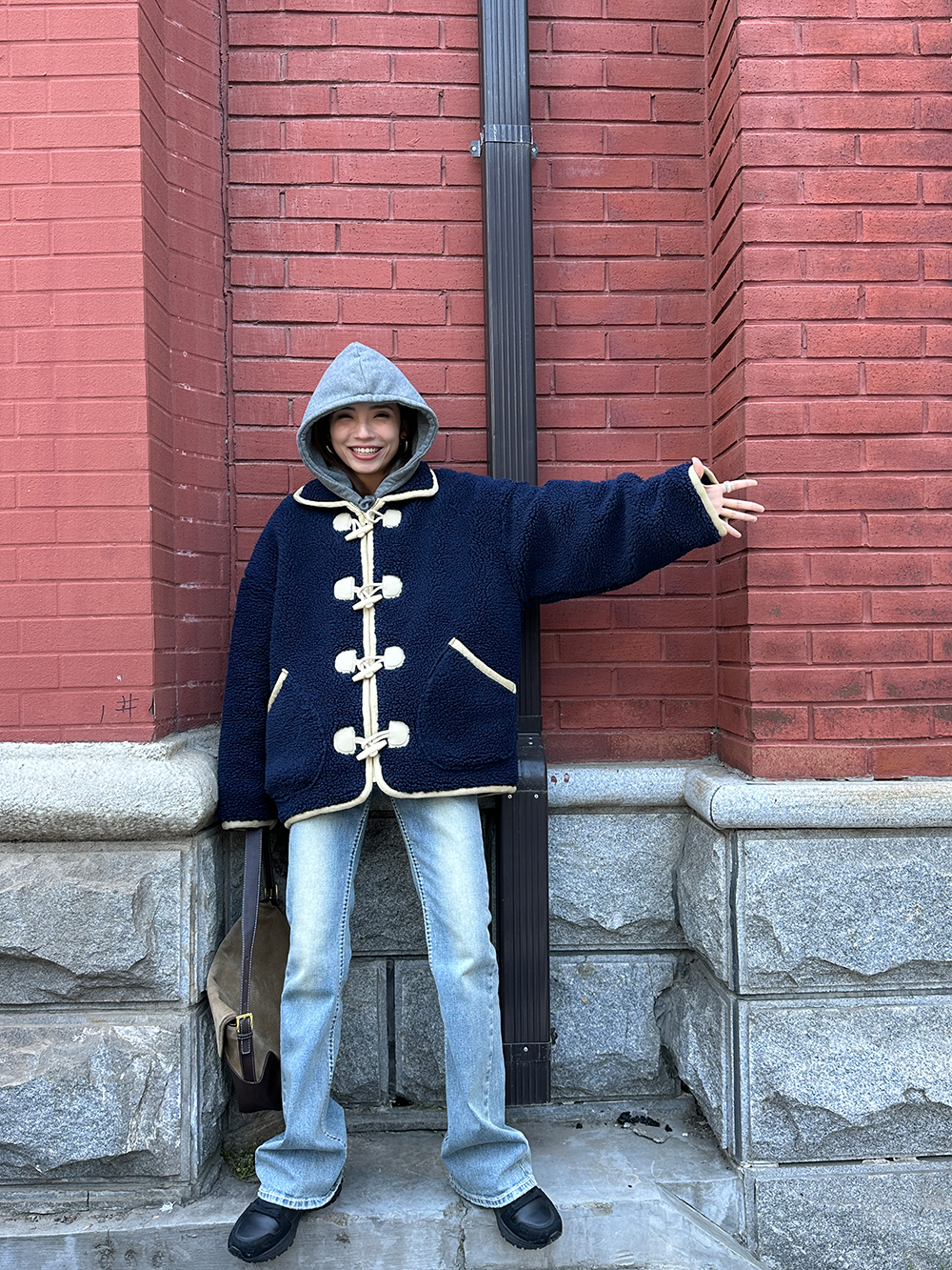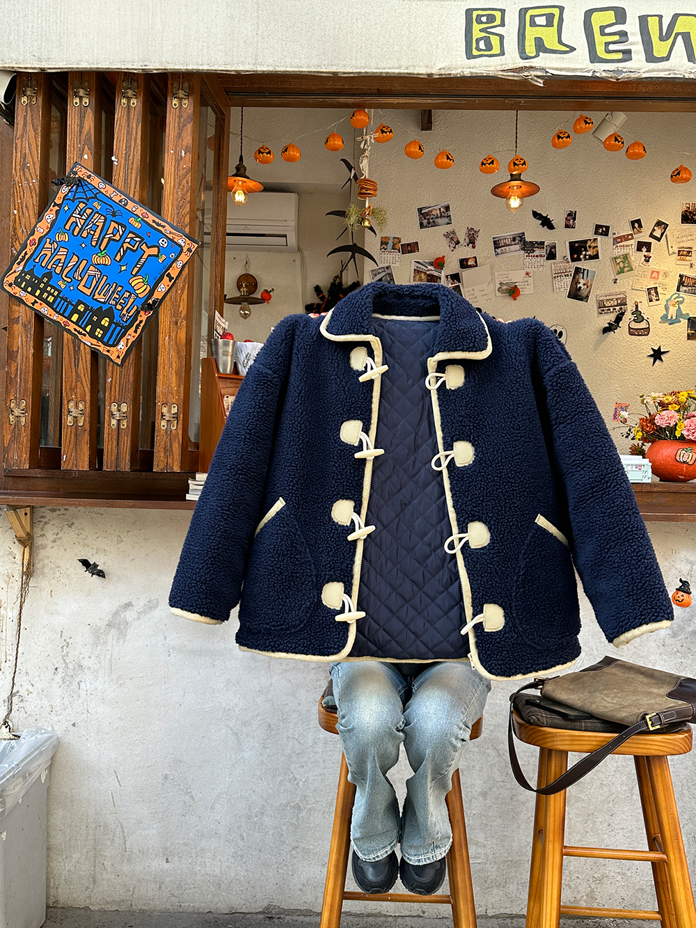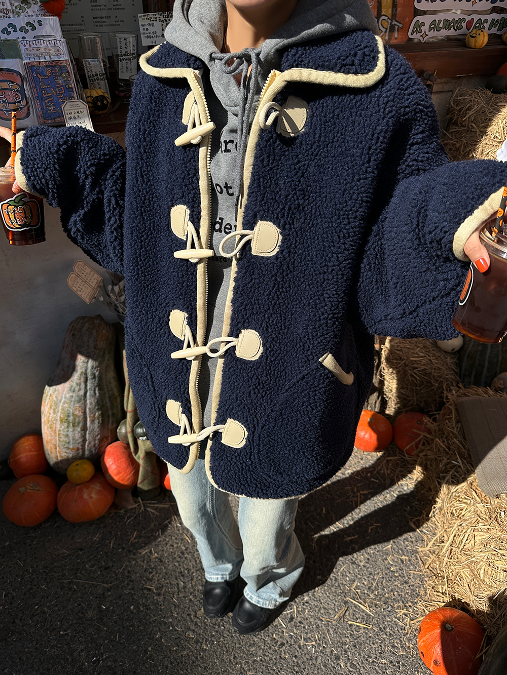 *o-ha-you*【FLCT1784】牛角扣羊羔毛夾棉外套2023新款冬季保暖加厚復古寬鬆棉衣棉服-2色-如有需要請先諮詢