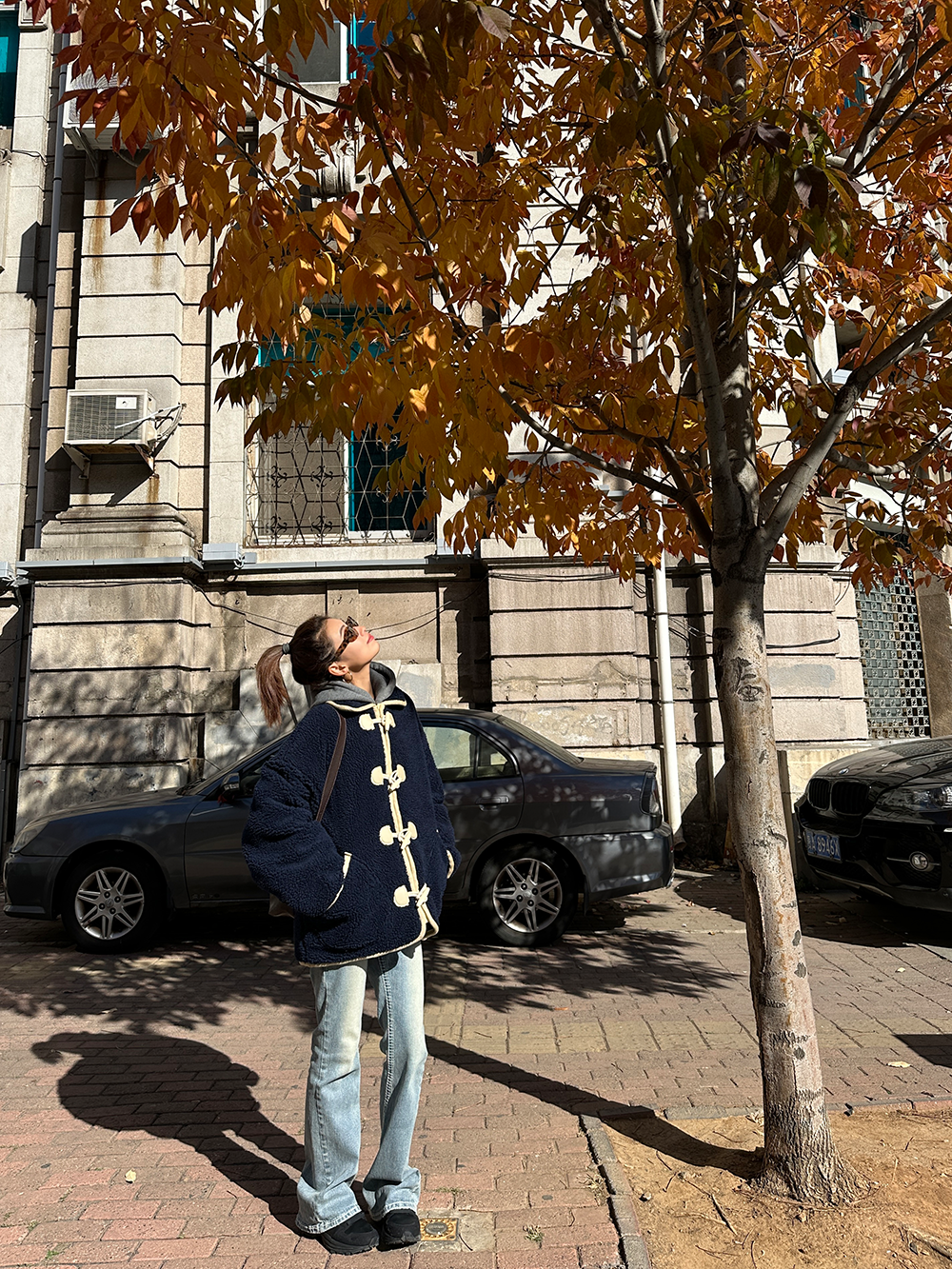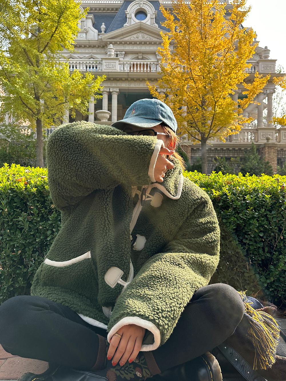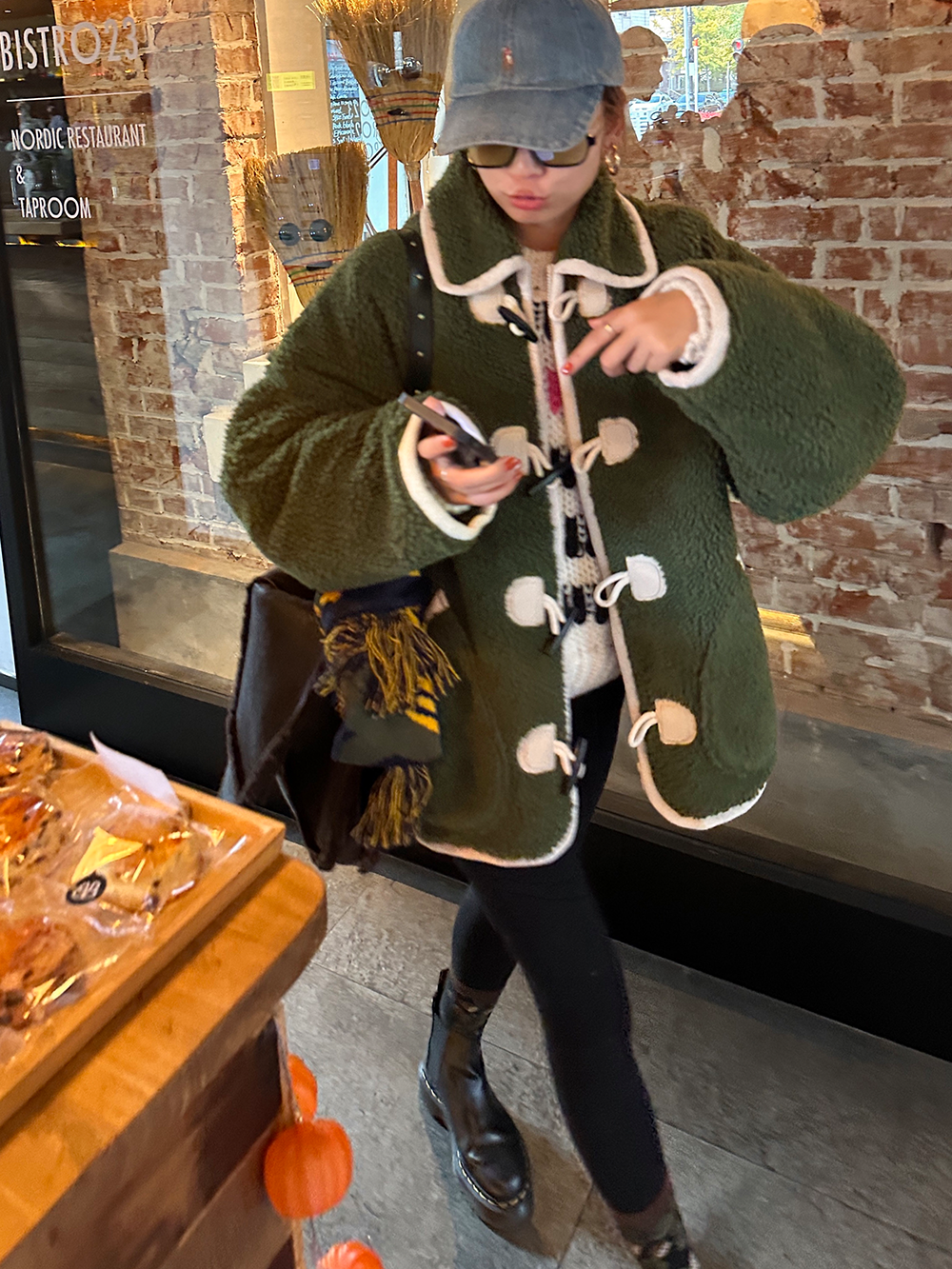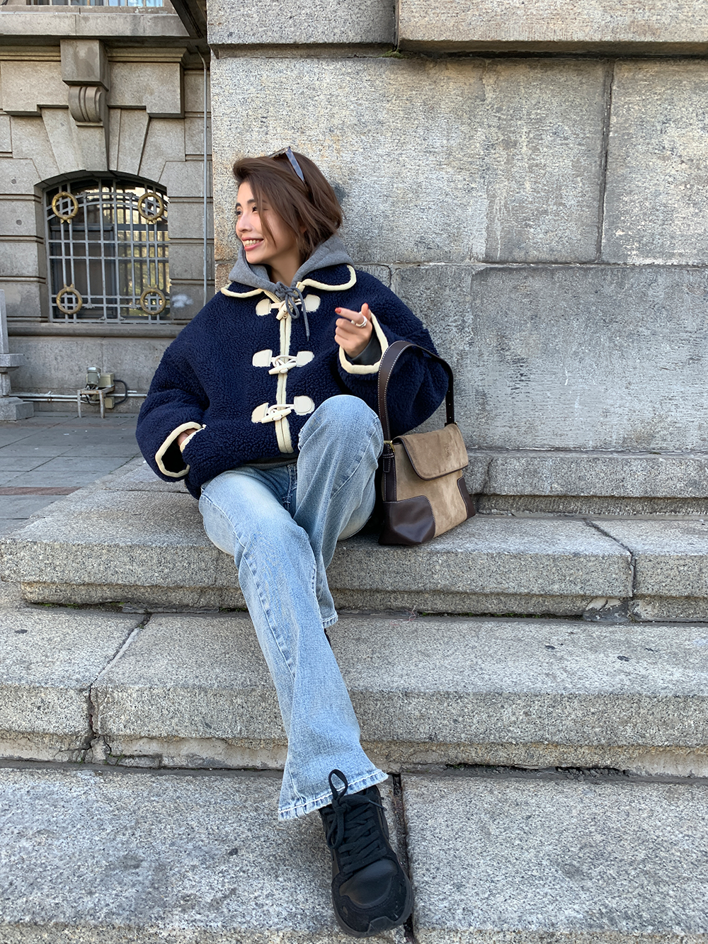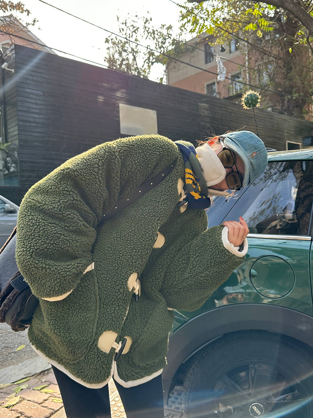 *o-ha-you*【FLCT1784】牛角扣羊羔毛夾棉外套2023新款冬季保暖加厚復古寬鬆棉衣棉服-2色-如有需要請先諮詢