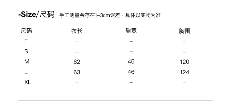 衣長/肩寬/袖長為平量,其他為一圈(單位:公分)
