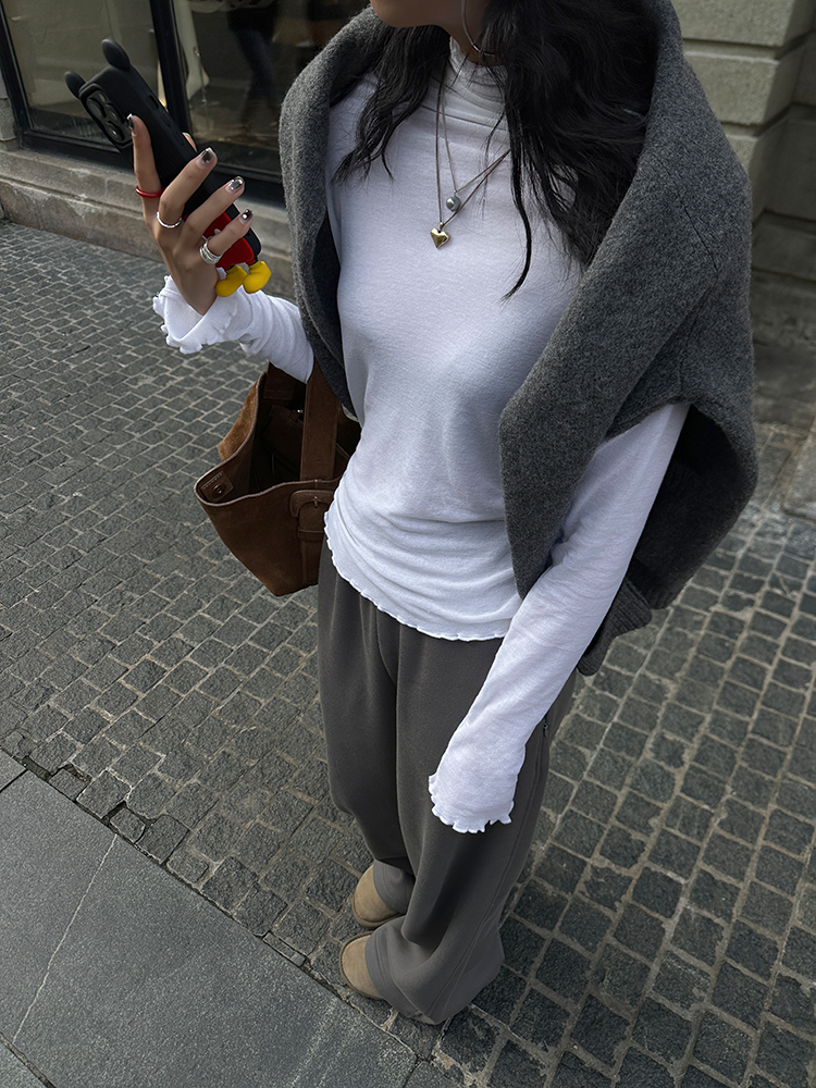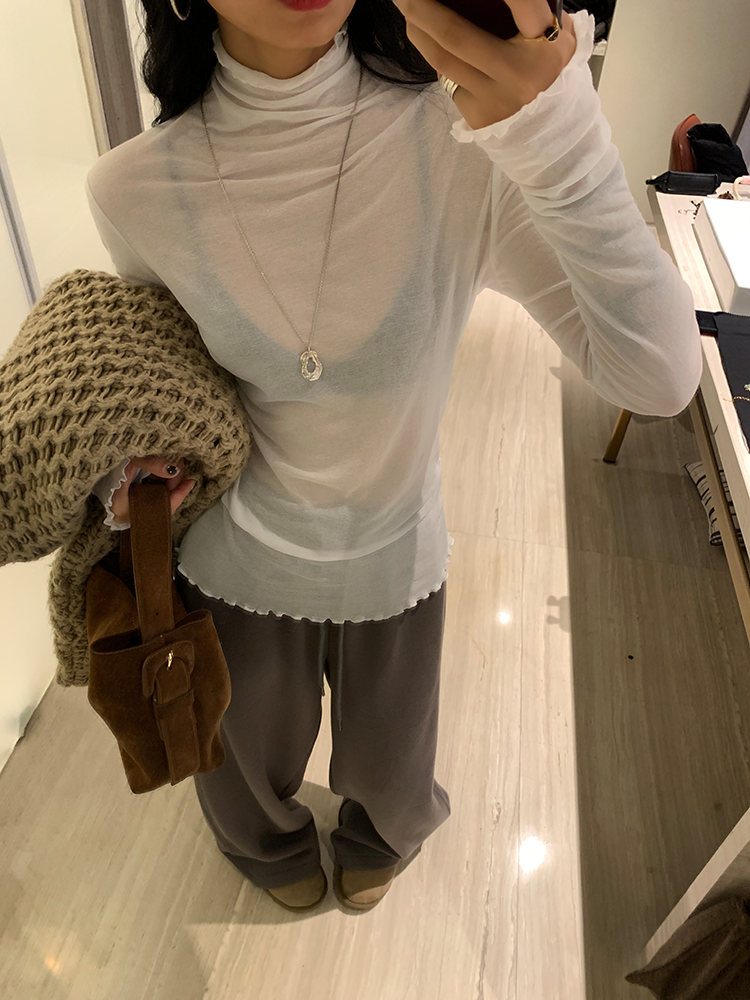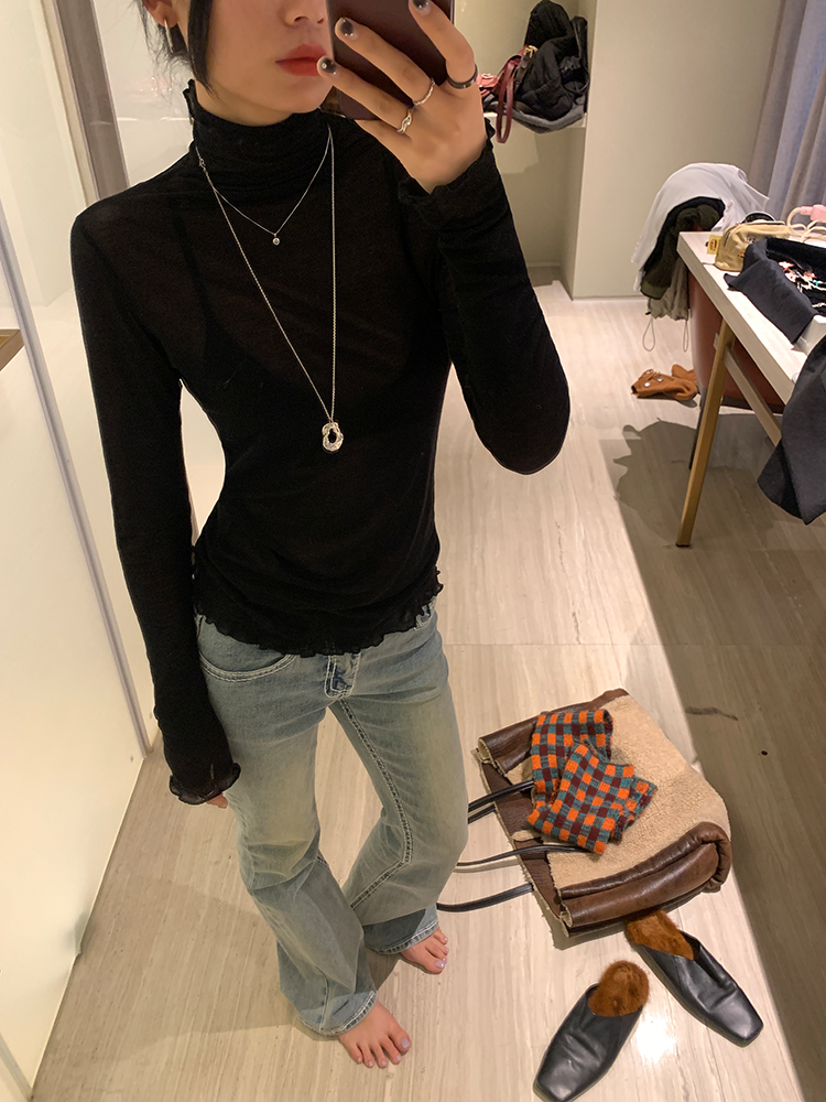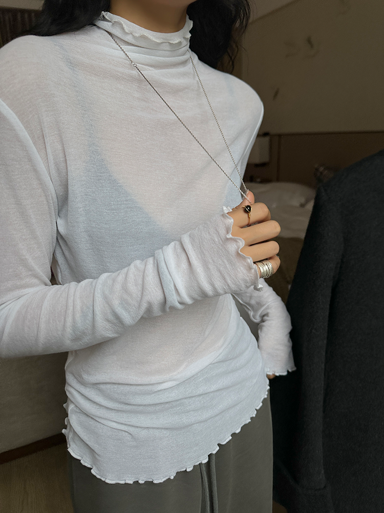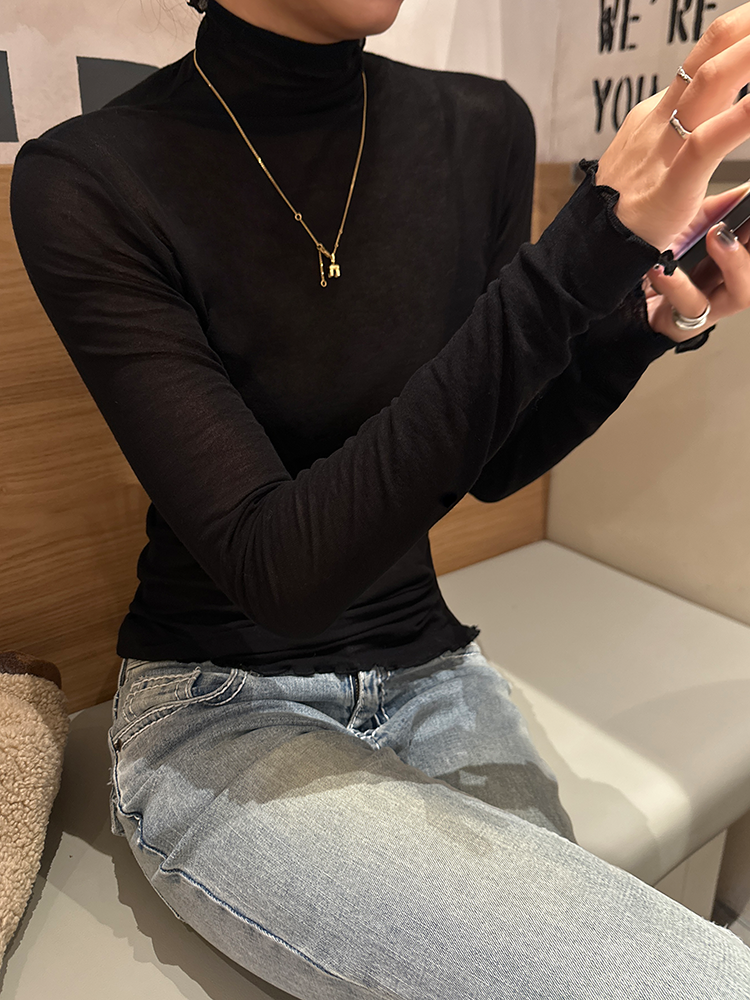 *o-ha-you*【FLCT2395】木耳邊高領打底衫2024新款秋冬高級感上衣修身洋氣內搭長袖T恤-2色-如有需要請先諮詢