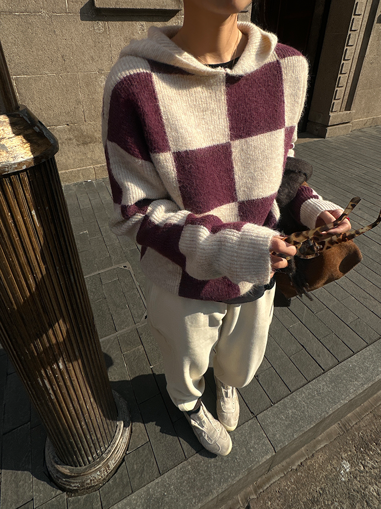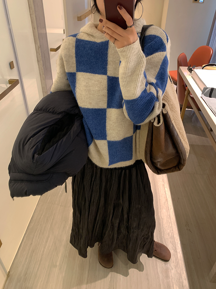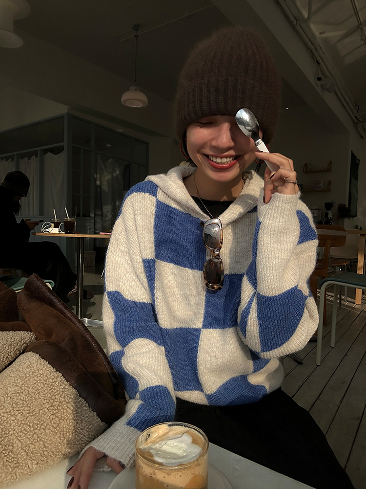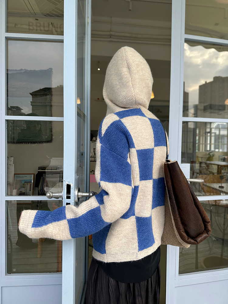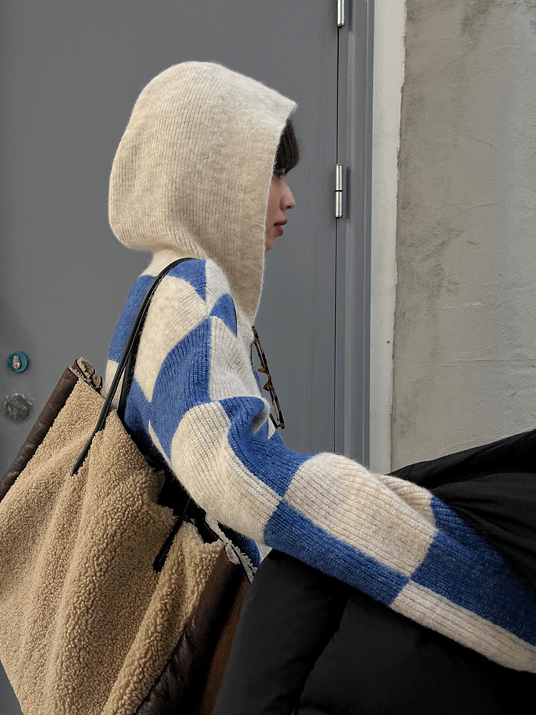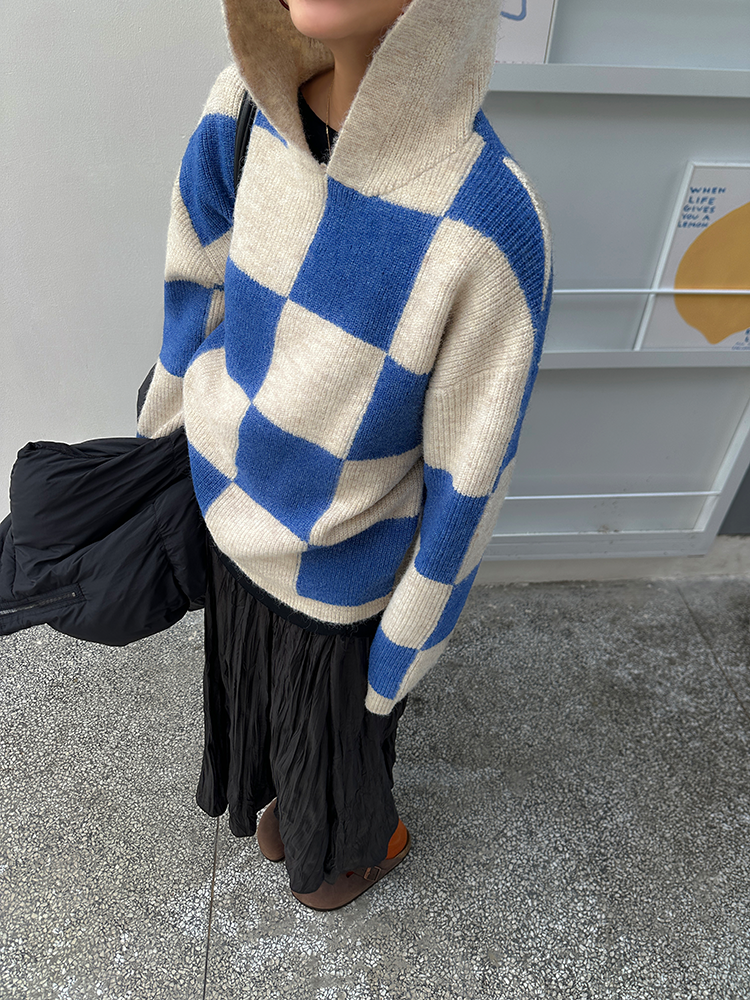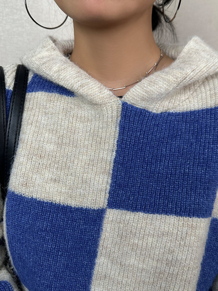 *o-ha-you*【FLCT2429】撞色格紋格子連帽毛衣冬季2024新款慵懶風寬鬆復古秋冬保暖針織上衣-2色