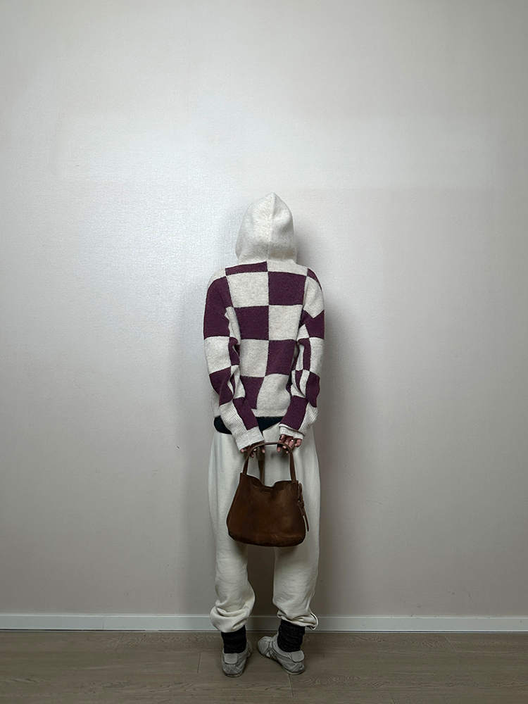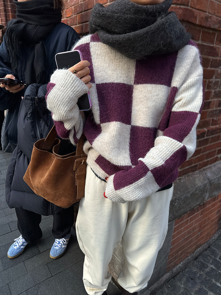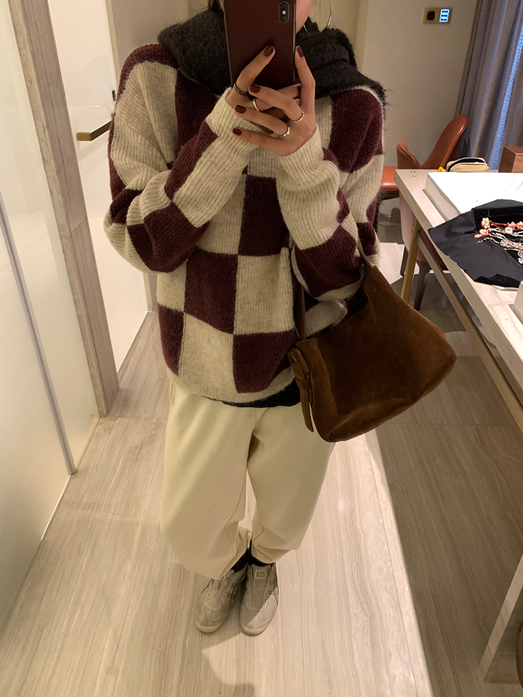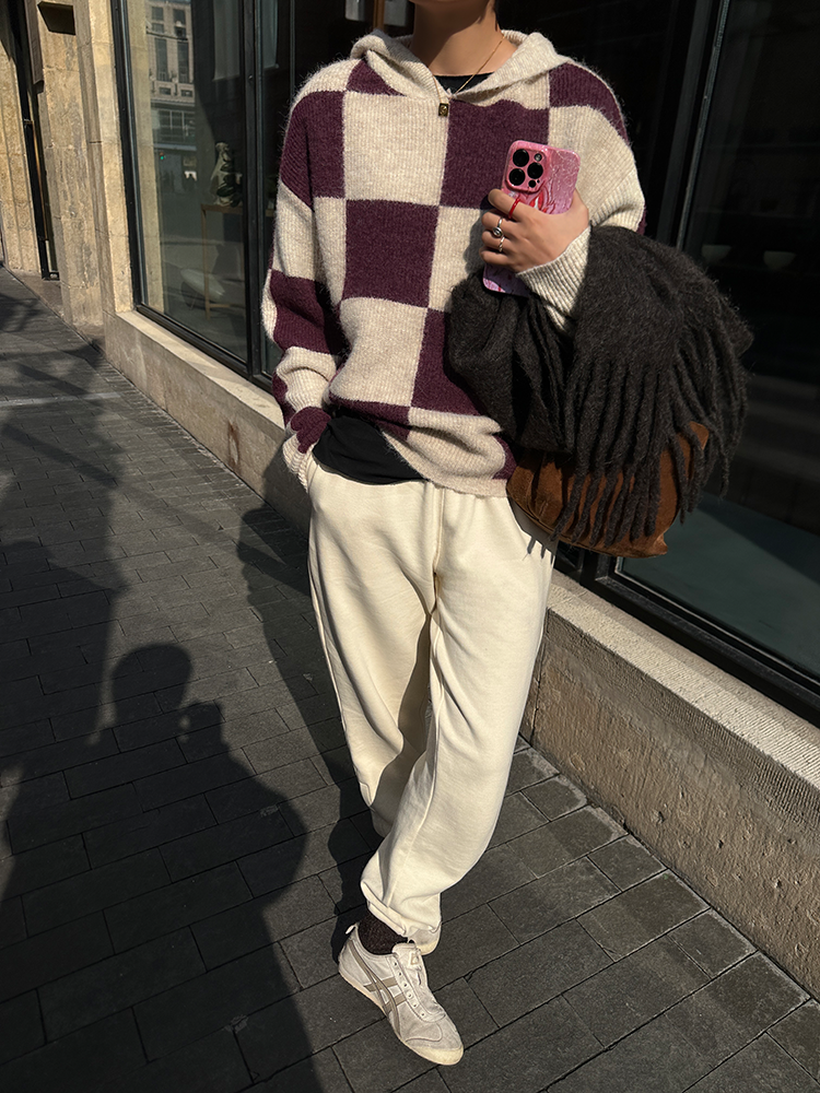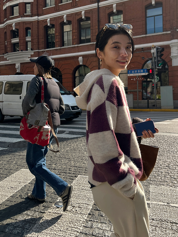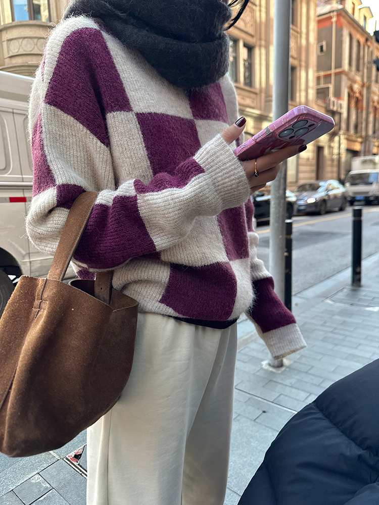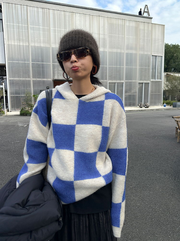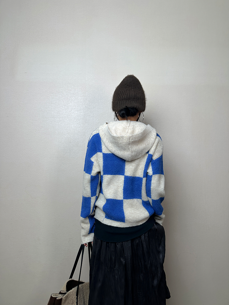 *o-ha-you*【FLCT2429】撞色格紋格子連帽毛衣冬季2024新款慵懶風寬鬆復古秋冬保暖針織上衣-2色