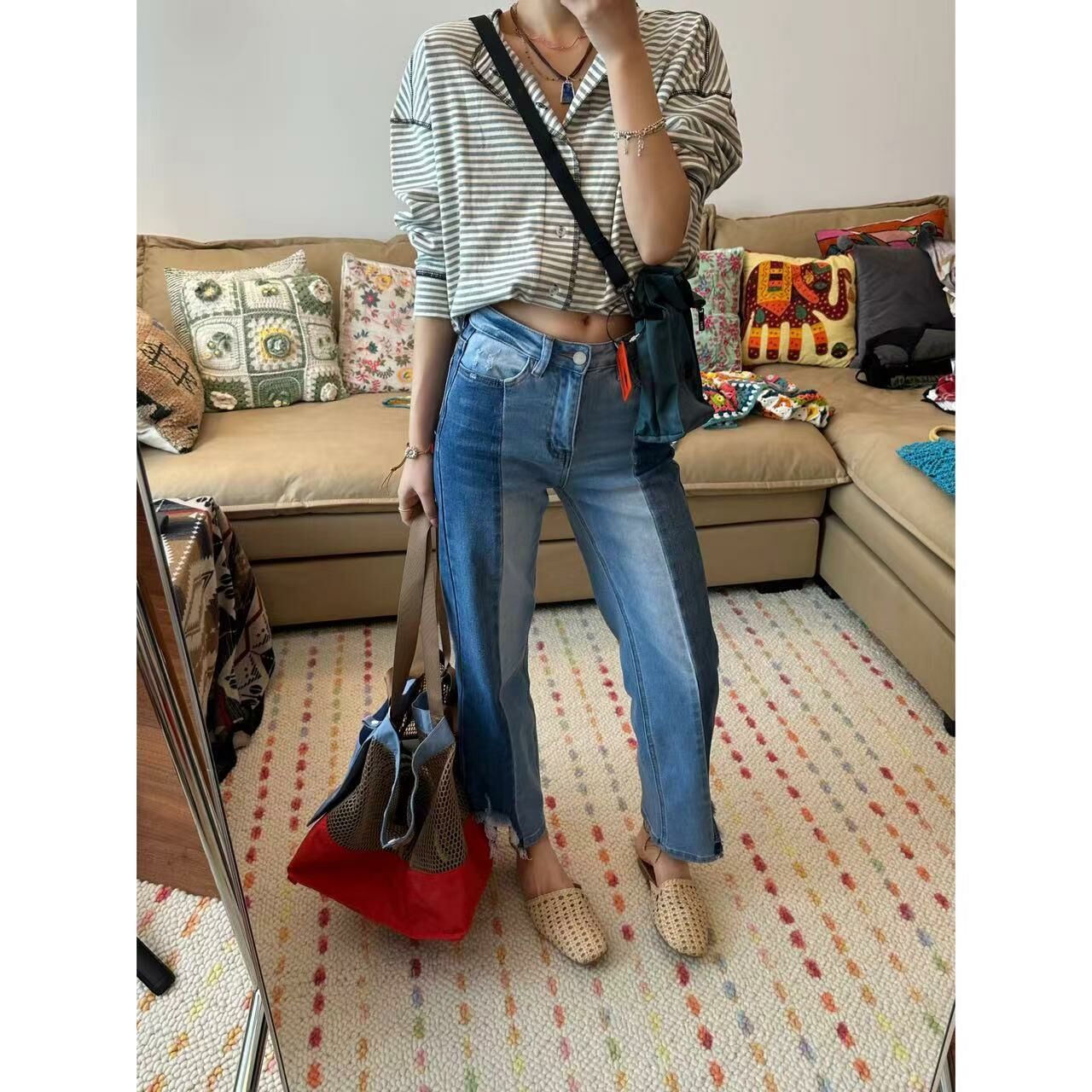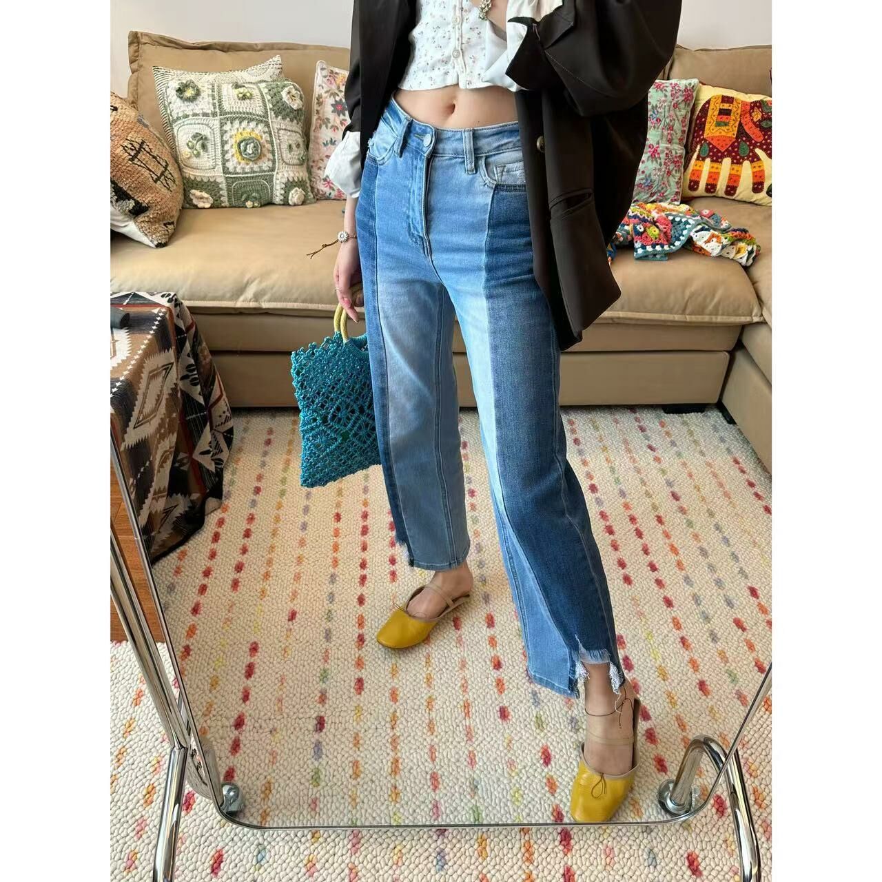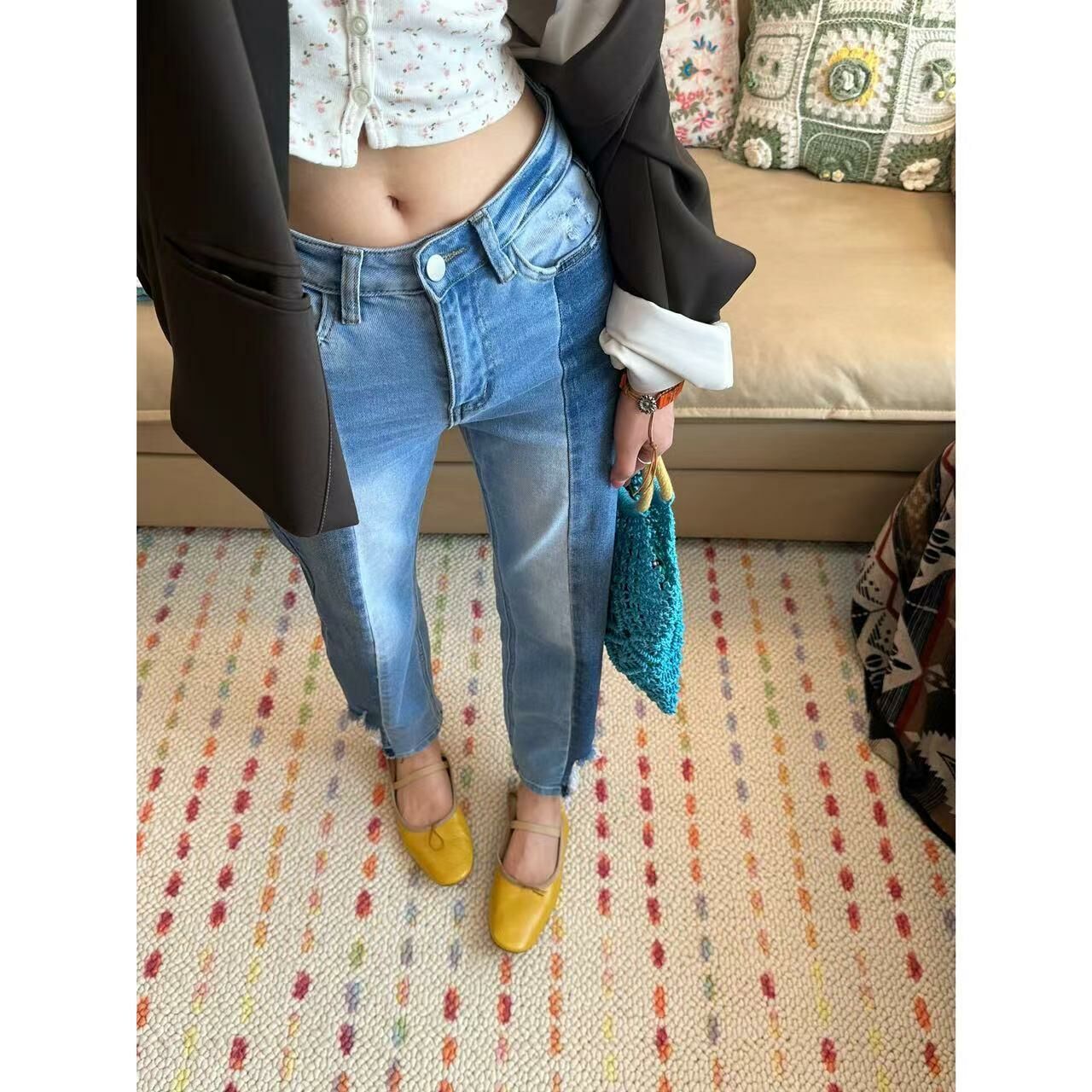 *o-ha-you*【FLCT2486】絕版-拉腿顯瘦濾鏡開到底的左右拼色彈力直筒9分牛仔褲 整條8片拼接-隱藏限量款~下單後盡力搶~搶不到別怪我-如有需要請先諮詢