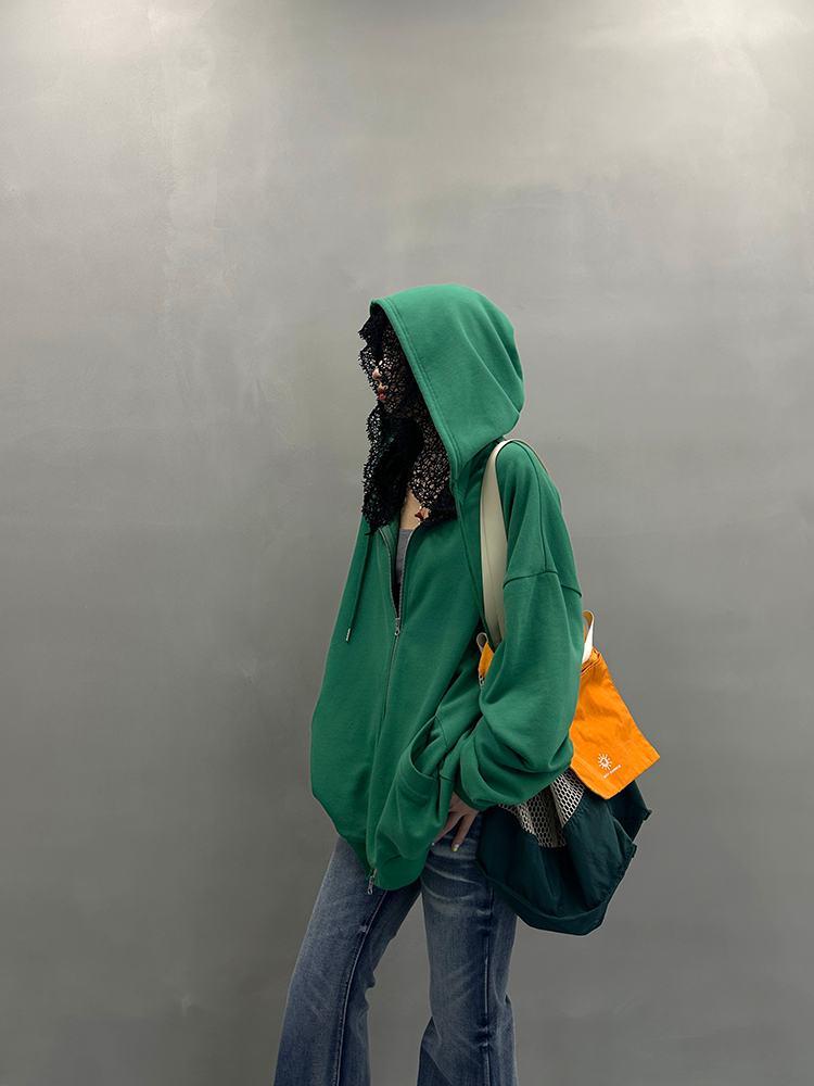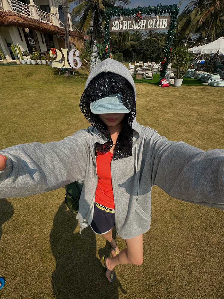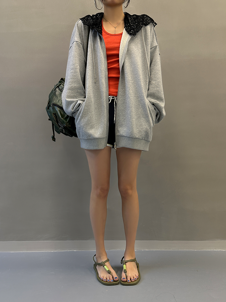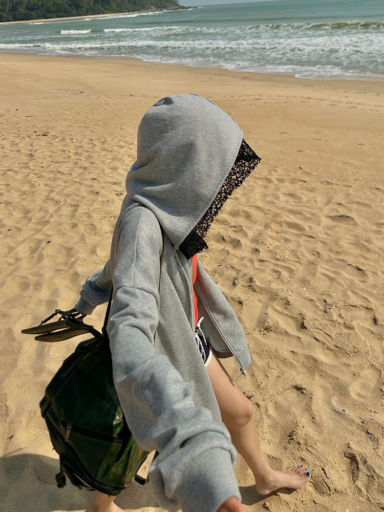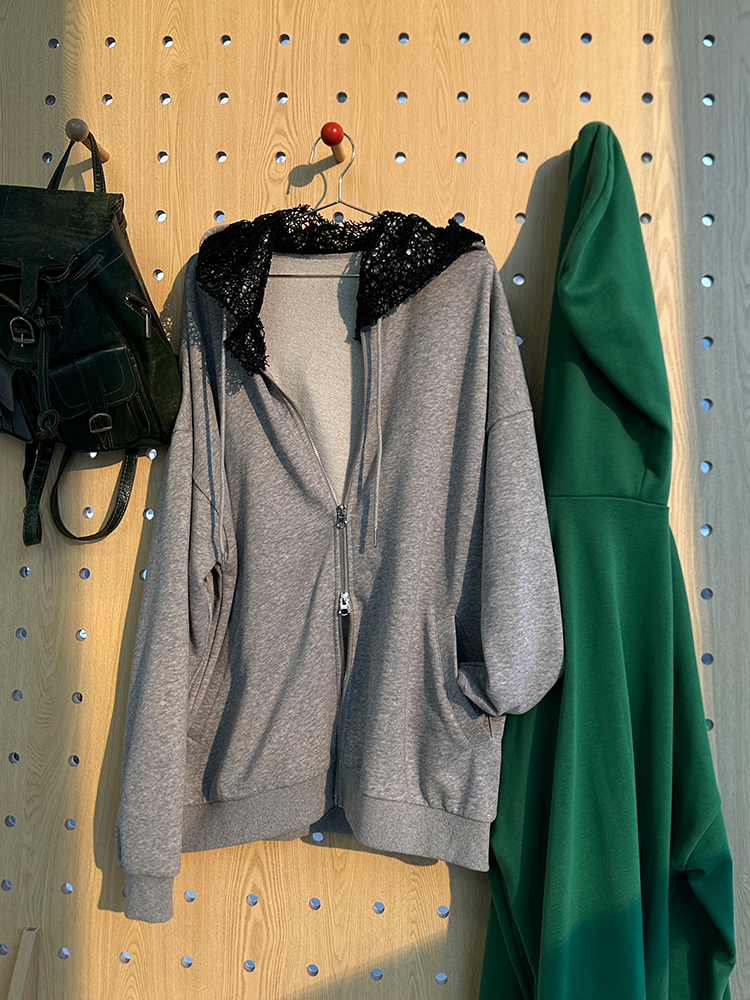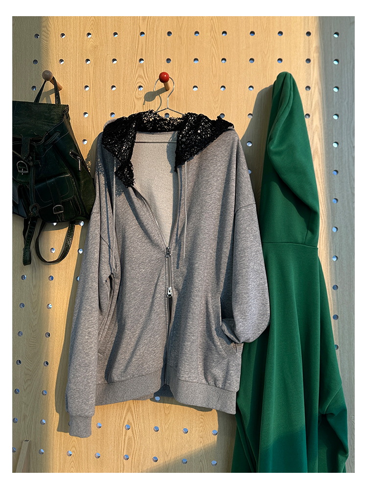 *o-ha-you*【FLCT2488】蕾絲拼接連帽衛衣外套2025新款春季洋氣寬鬆慵懶風休閒拉鍊開襟衫-2色-如有需要請先諮詢