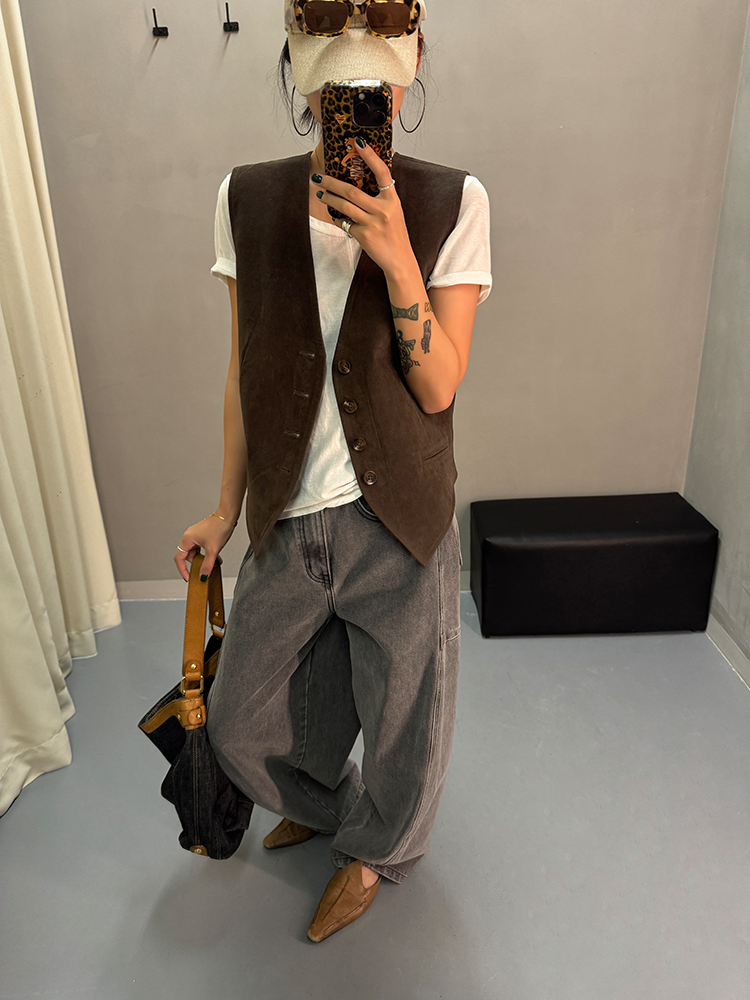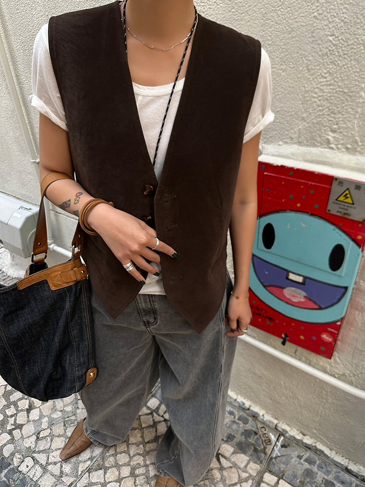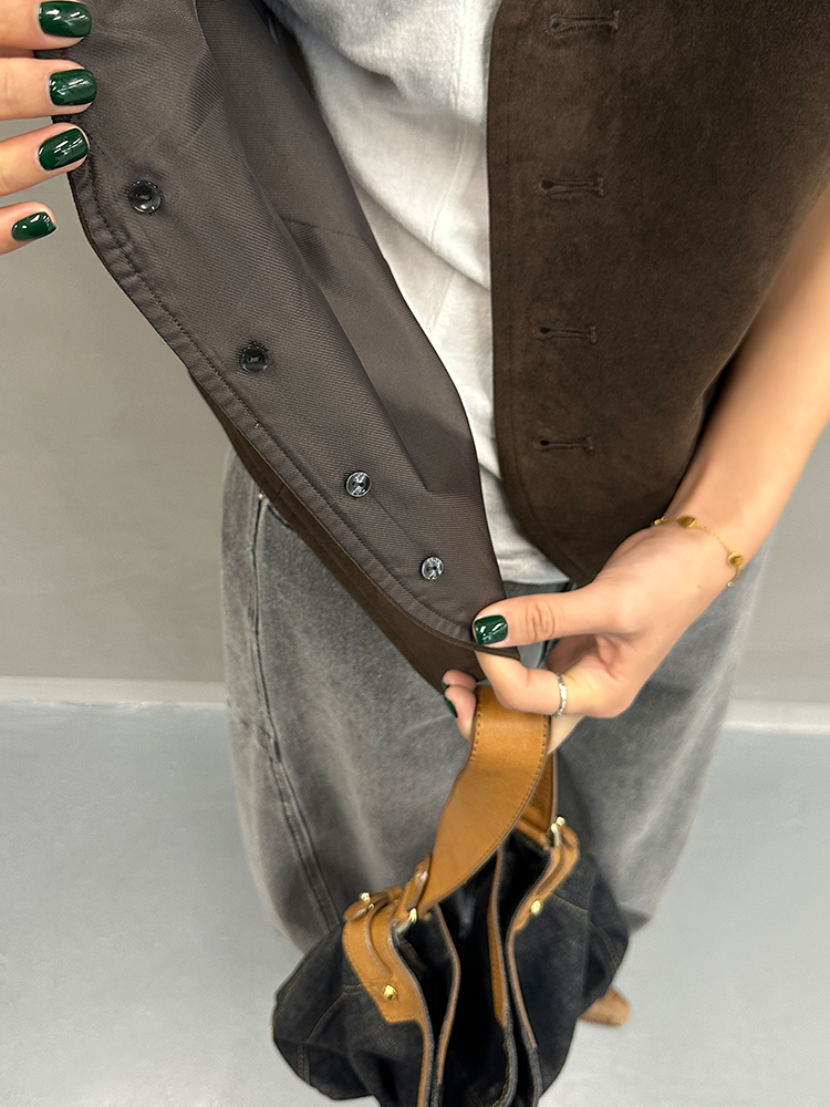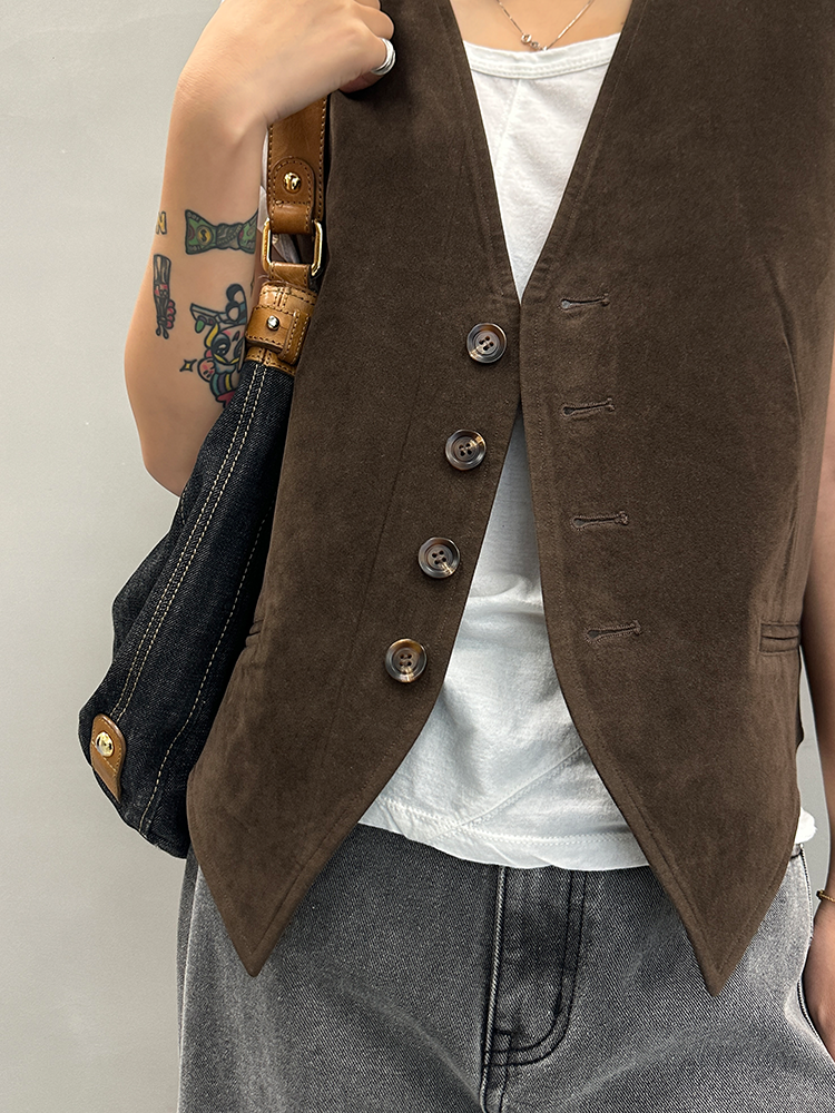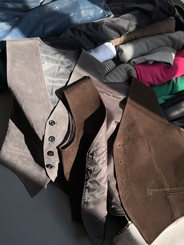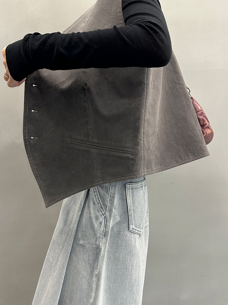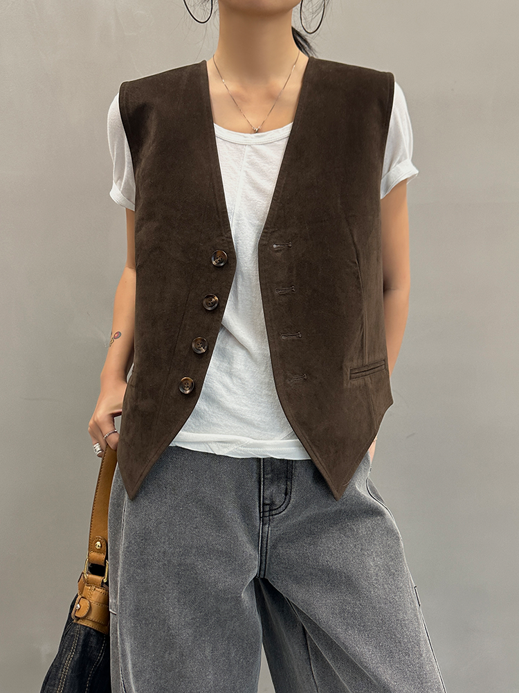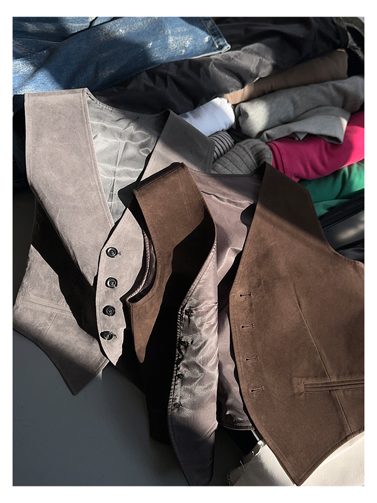 *o-ha-you*【FLCT2573】麂皮絨復古疊穿馬甲背心2025春季新款V領短版無袖坎肩馬夾外套-2色-如有需要請先諮詢
