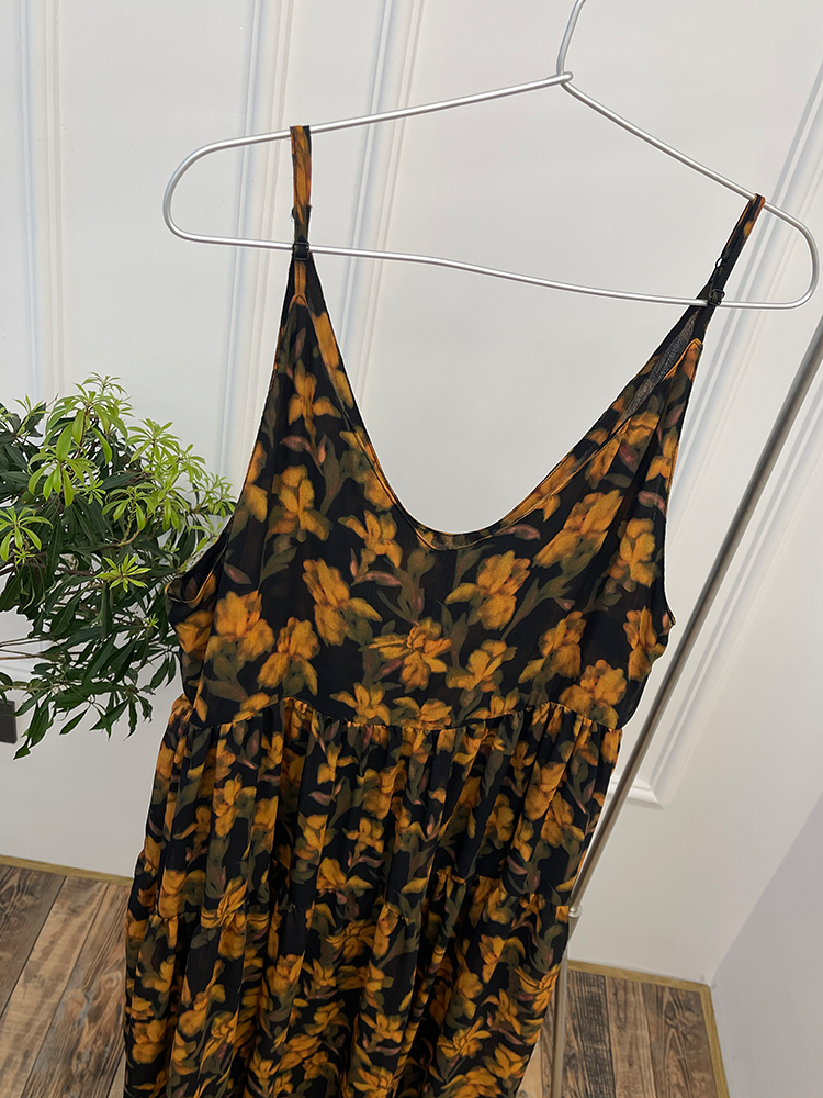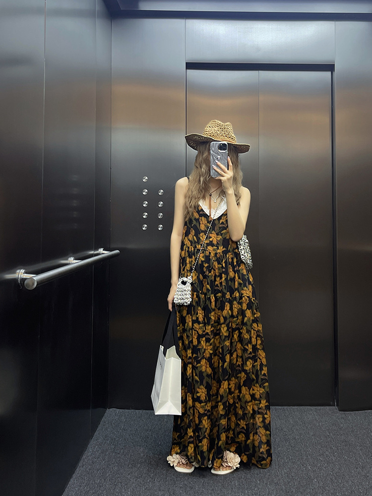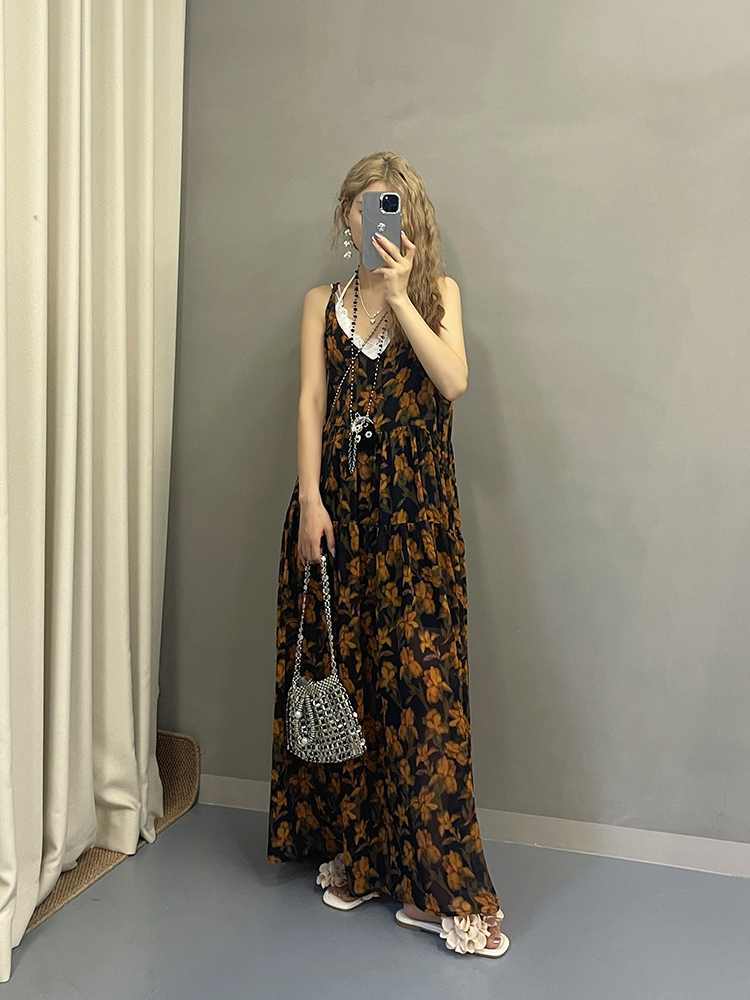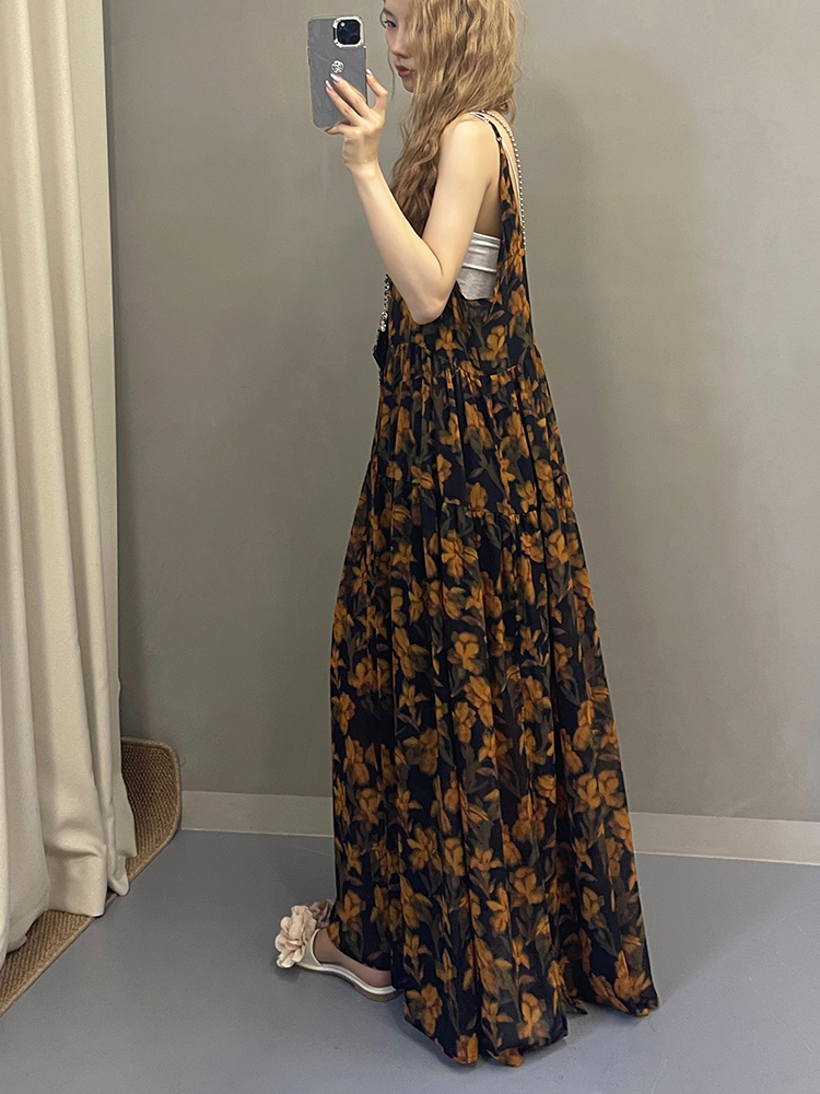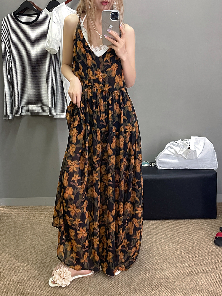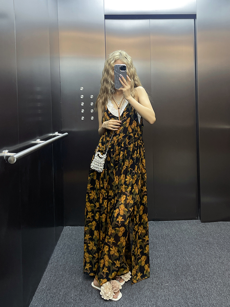*o-ha-you*【FLCT2608】慵懶感拉滿的黃花雪紡吊帶連衣裙洋裝-如有需要請先諮詢