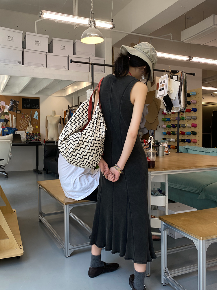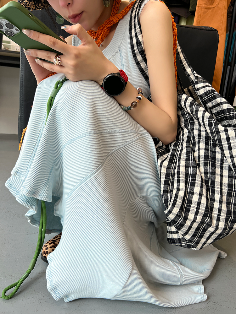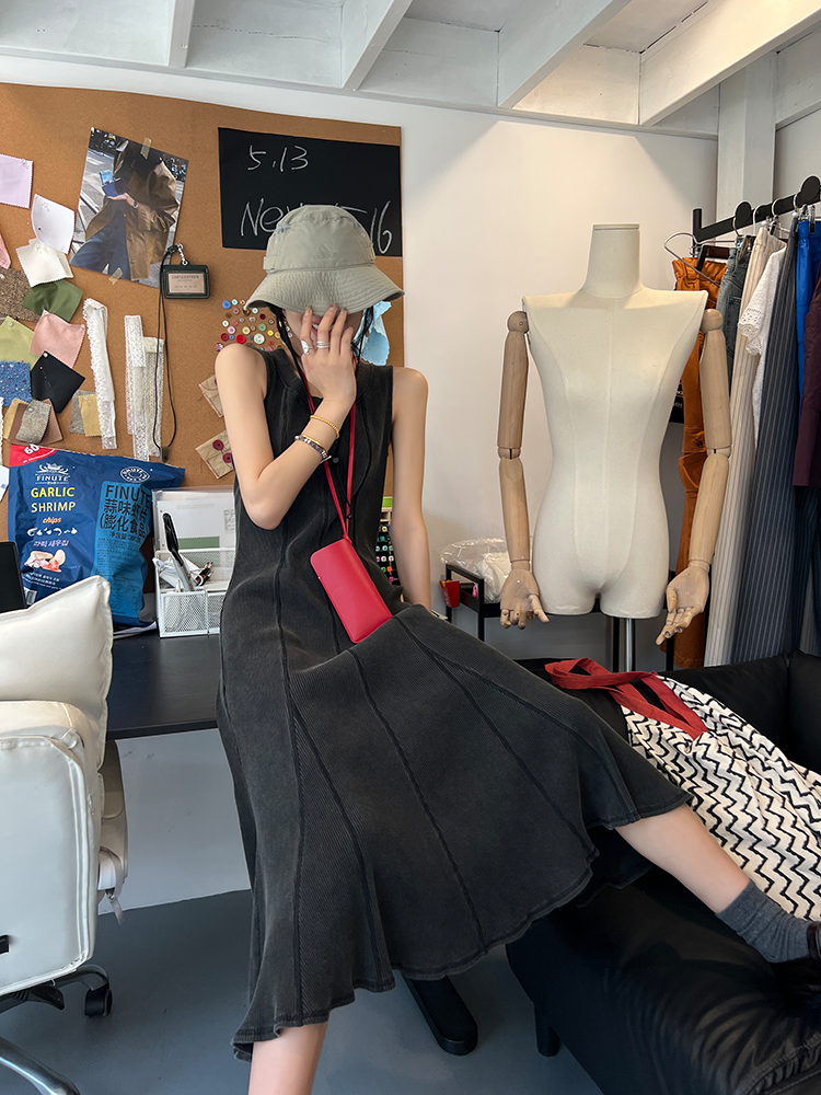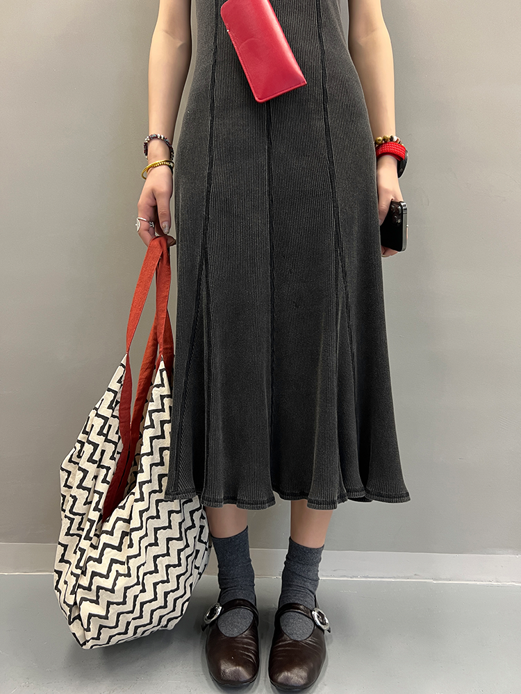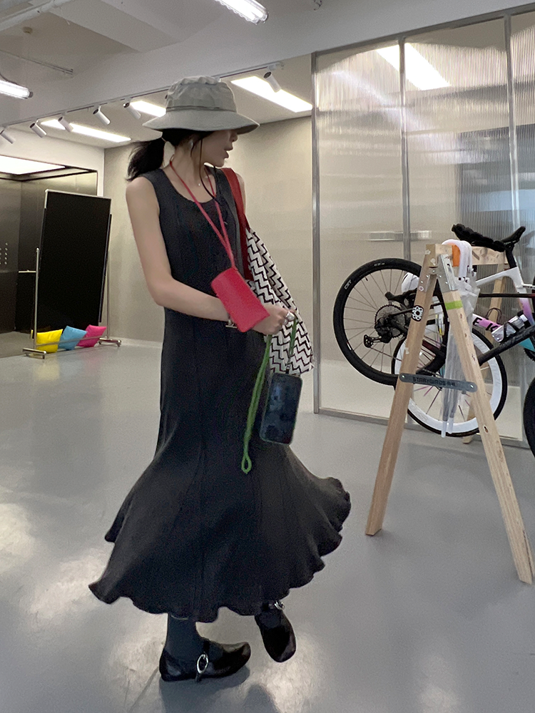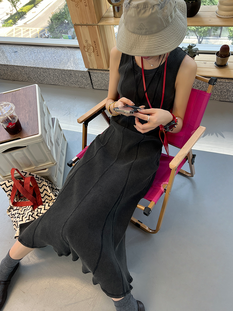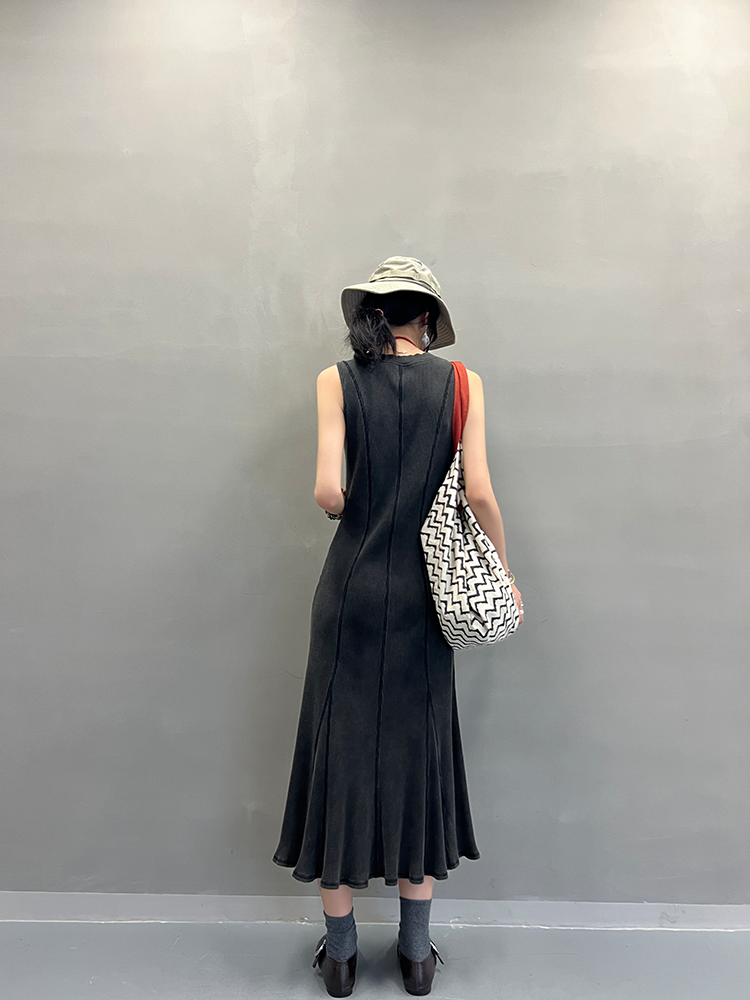 *o-ha-you*【FLCT2718】微彈髒洗魚尾連衣裙! 2025夏季新款氣質時尚顯瘦無袖背心裙長裙洋裝-2色-黑灰色L有現貨
