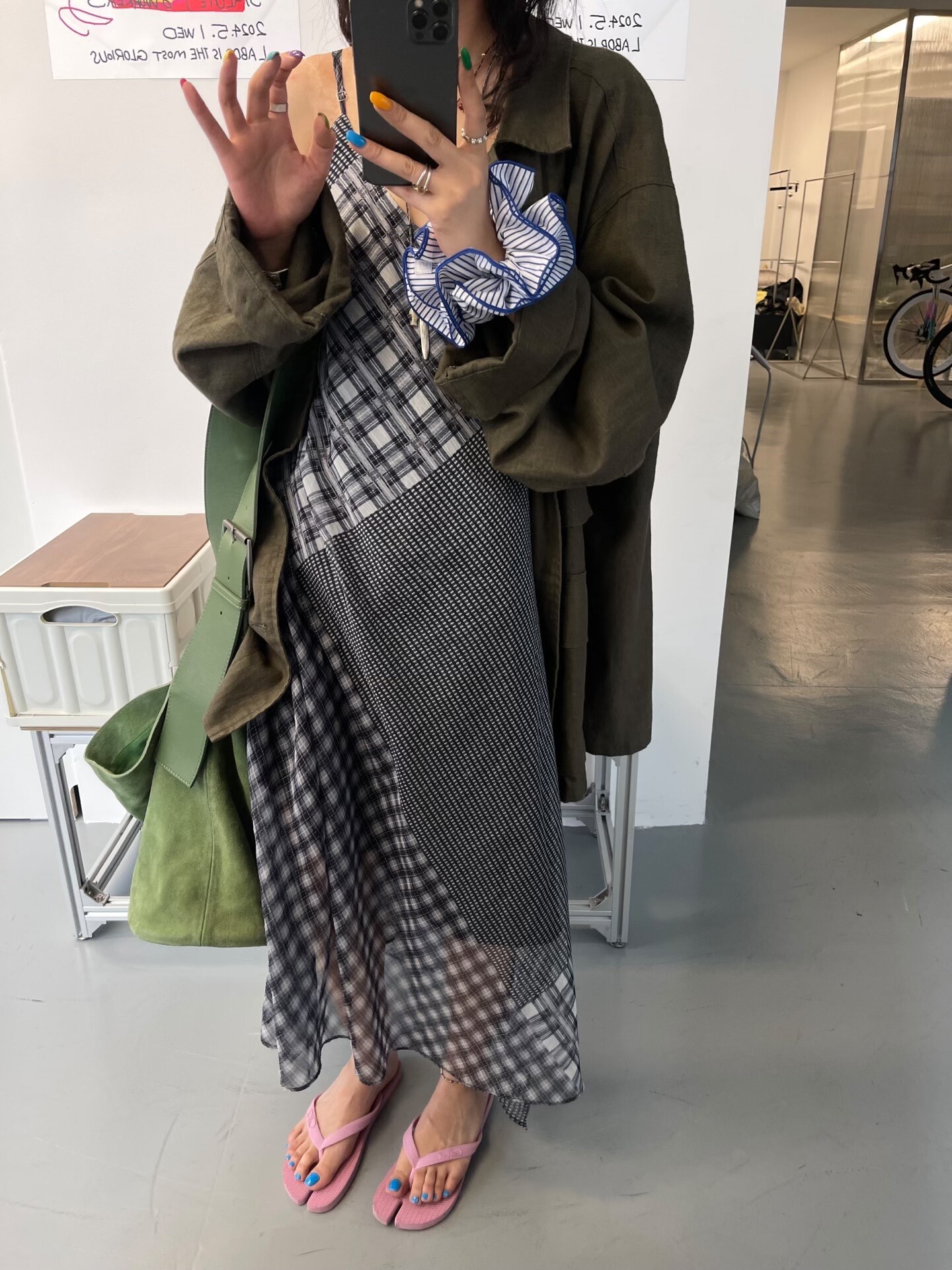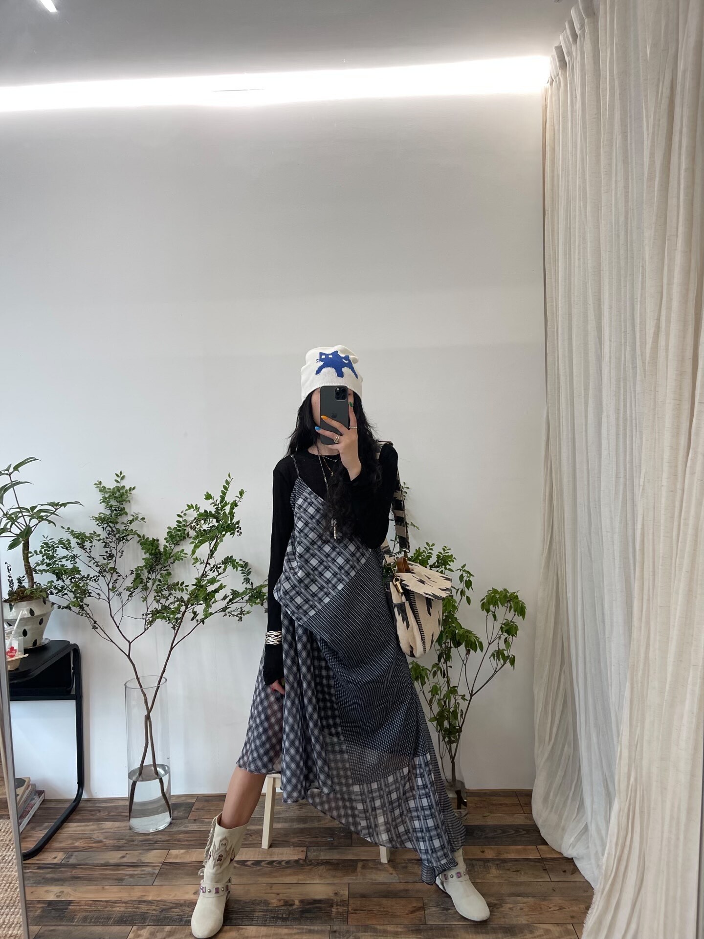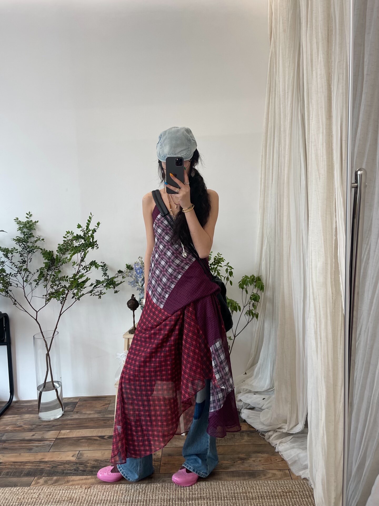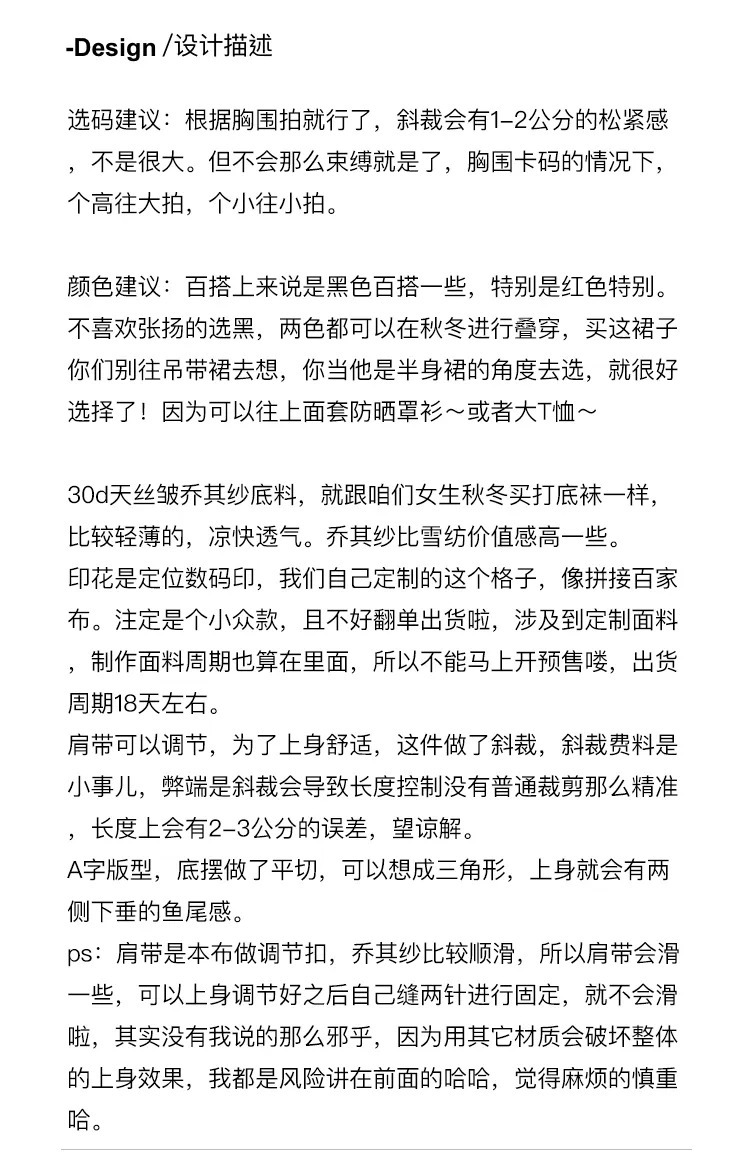 印花是定位數位印,我們自己訂製的這個格子,像拼接百家布。注定是個小眾款,且不好翻單出貨啦,涉及到定制面料,製作面料週期也算在裡面,所以不能馬上開預售嘍,出貨週期18天左右。