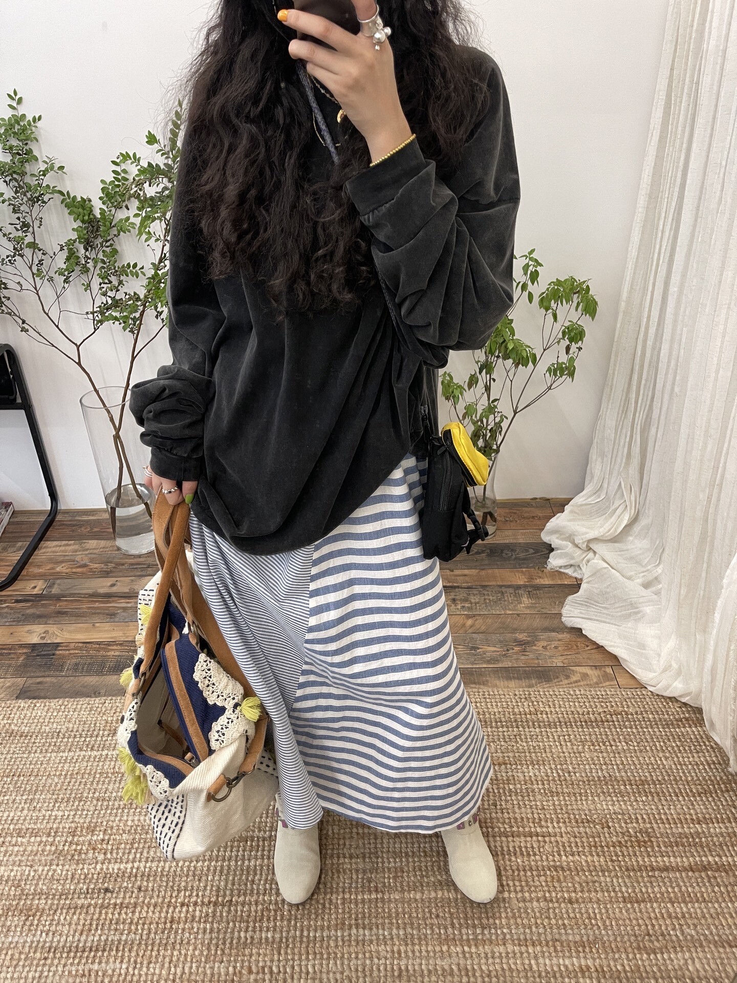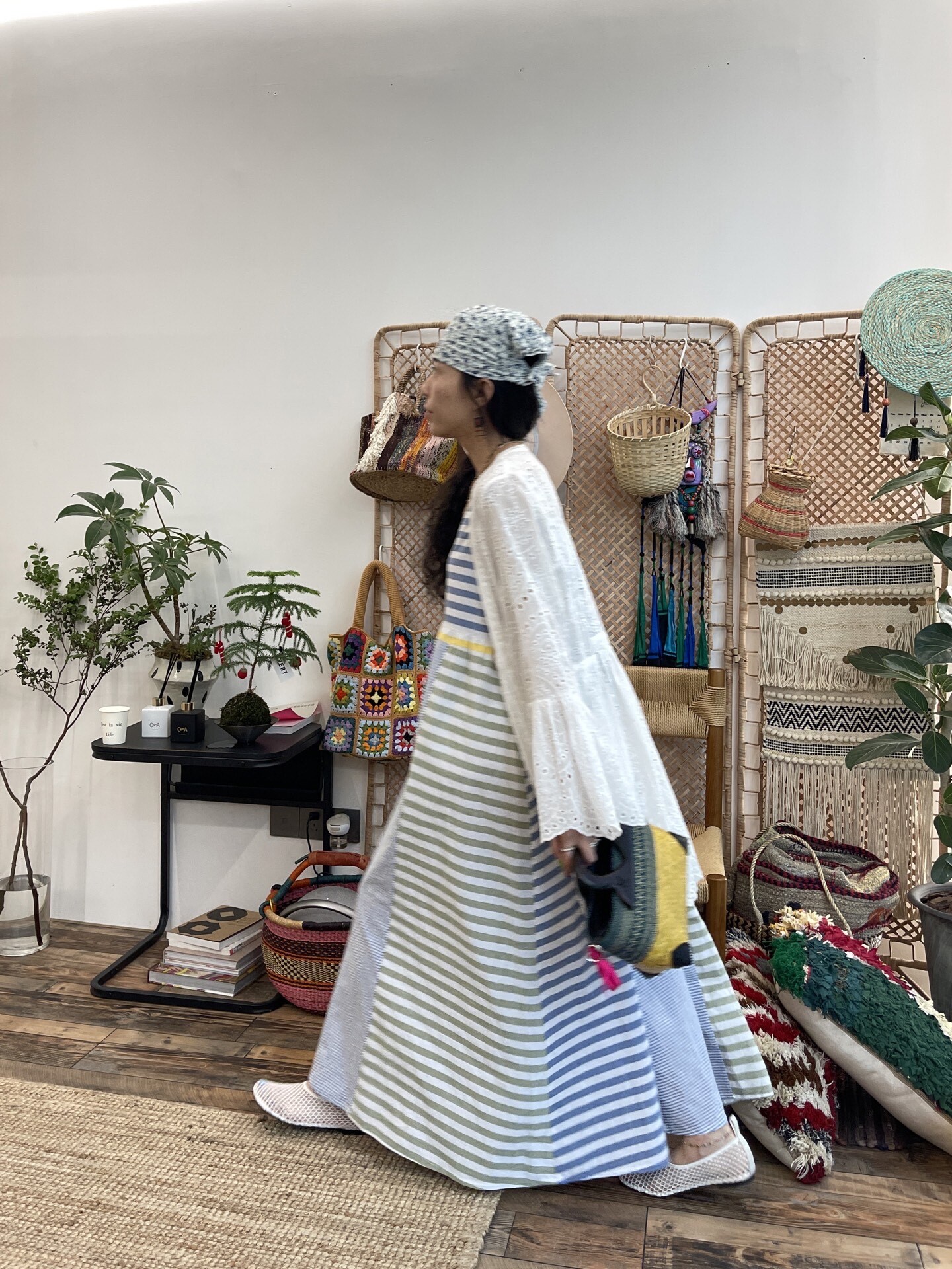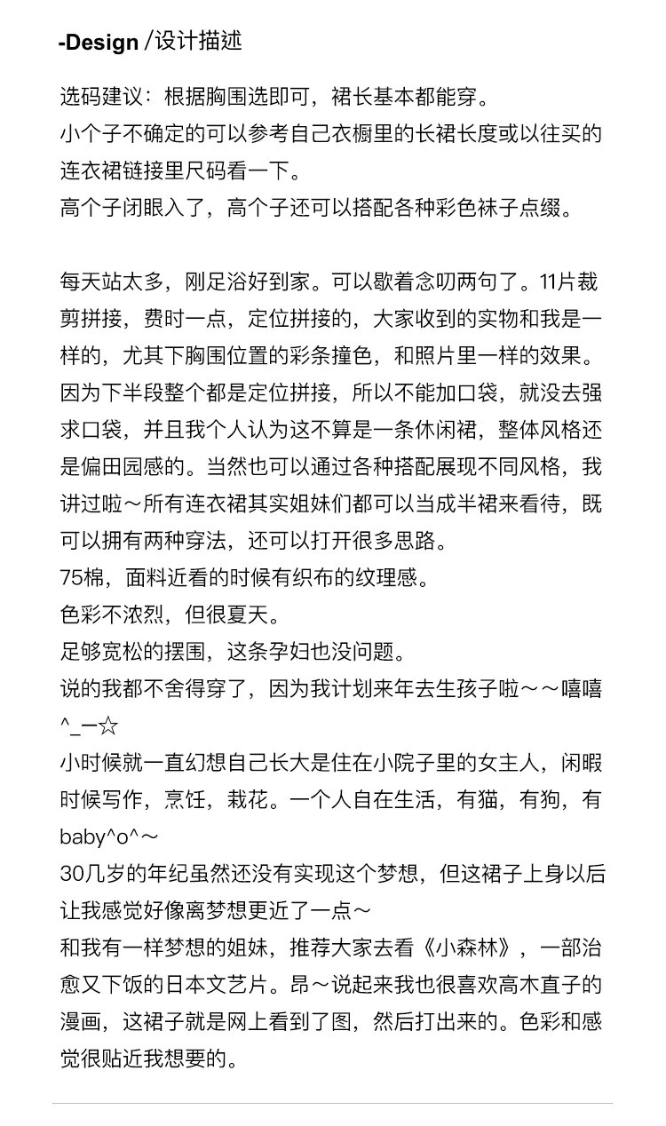 因為下半段整個都是定位拼接,所以不要加口袋,就沒去強求口袋,並且我個人認為這不算是一條休閒裙,整體風格還是偏田園感的。當然也可以透過各種搭配展現不同風格,我講過啦~所有洋裝其實姊妹都可以當成半裙來看待,既可以擁有兩種穿法,還可以打開很多思路。