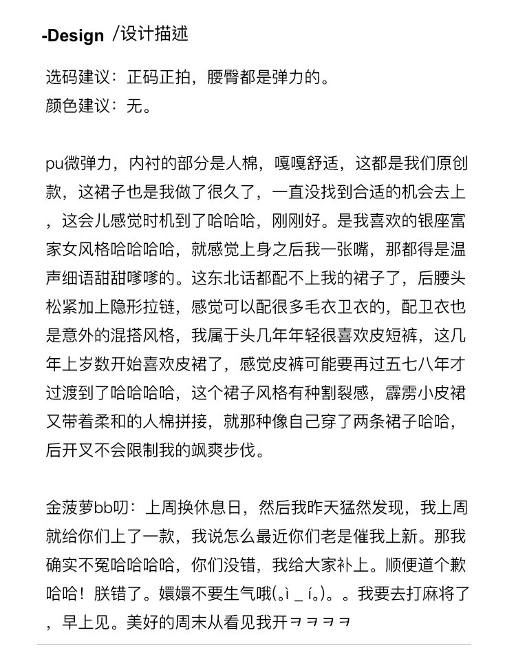 pu微彈力,內襯的部分是人棉,嘎嘎舒適,這都是我們原創款,這裙子也是我做了很久了,一直沒找到合適的機會去上,這會兒感覺時機到了哈哈哈,剛剛好。是我喜歡的銀座富家女風格哈哈哈哈,就感覺上身之後我一張嘴,那都得是溫聲細語甜甜嗲嗲的。這東北話都配不上我的裙子了,後腰頭鬆緊加上隱形拉鍊,感覺可以配很多毛衣衛衣的,配衛衣也是意外的混搭風格,我屬於頭幾年年輕很喜歡皮短褲,這幾年上歲數開始喜歡皮裙了,感覺皮褲可能要再過五七八年才過渡到了哈哈哈哈,這個裙子風格有種割裂感,霹靂小皮裙又帶著柔和的人棉拼接,就那種像自己穿了兩條裙子哈哈,後開叉不會限制我的颯爽步伐。