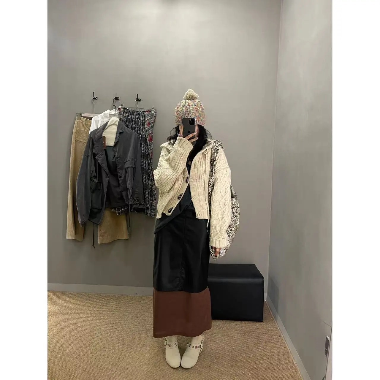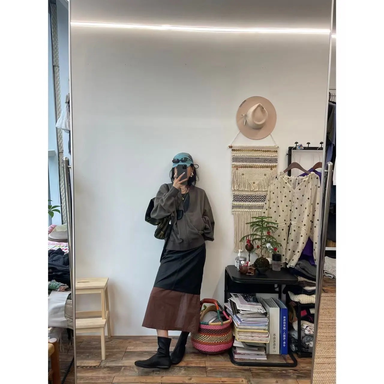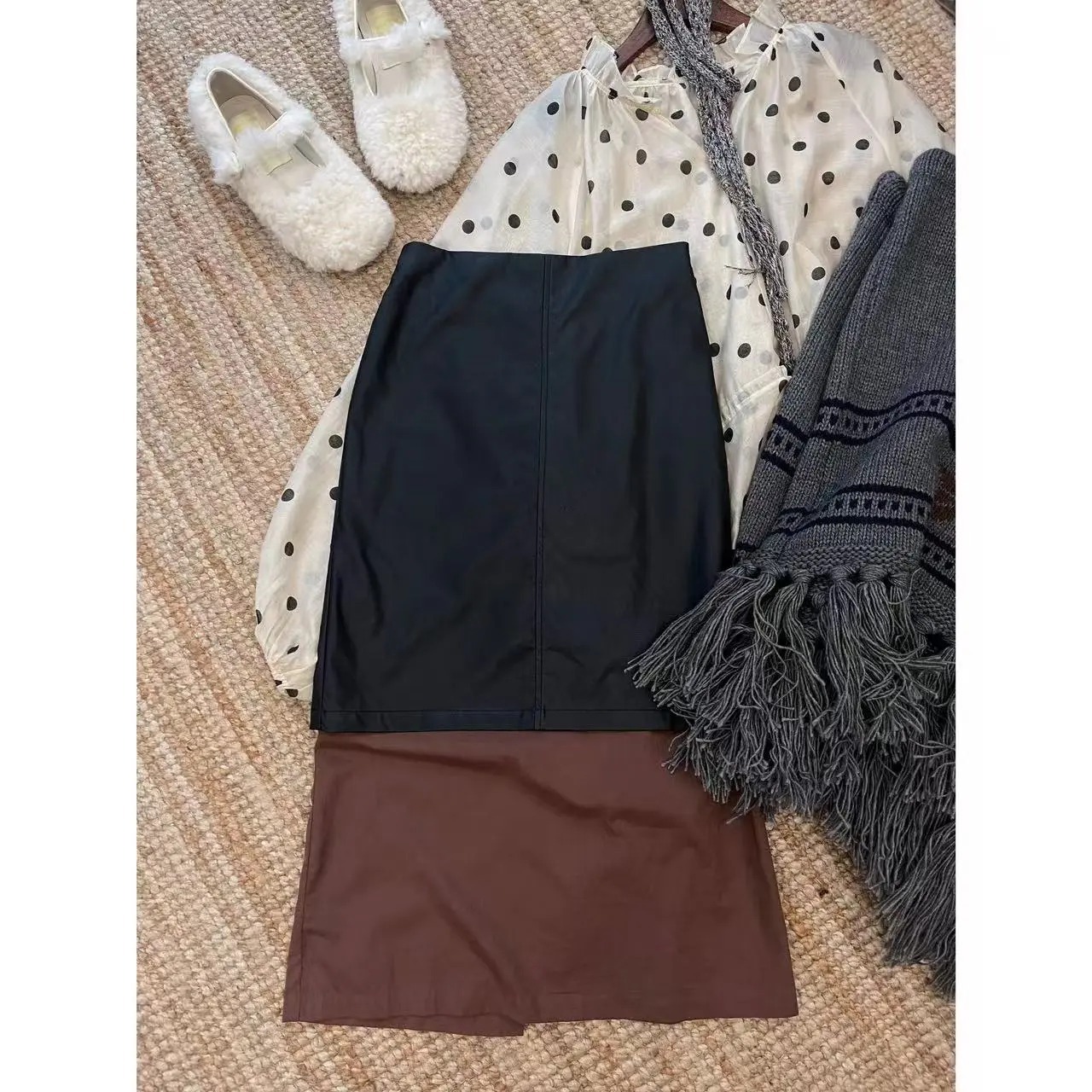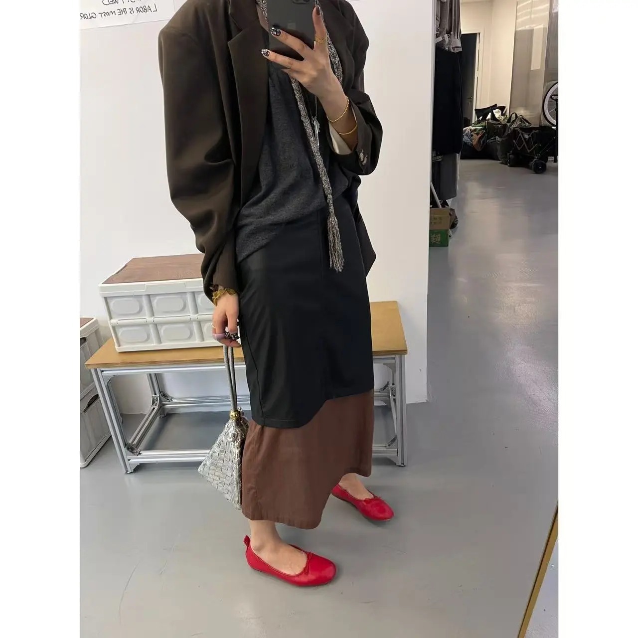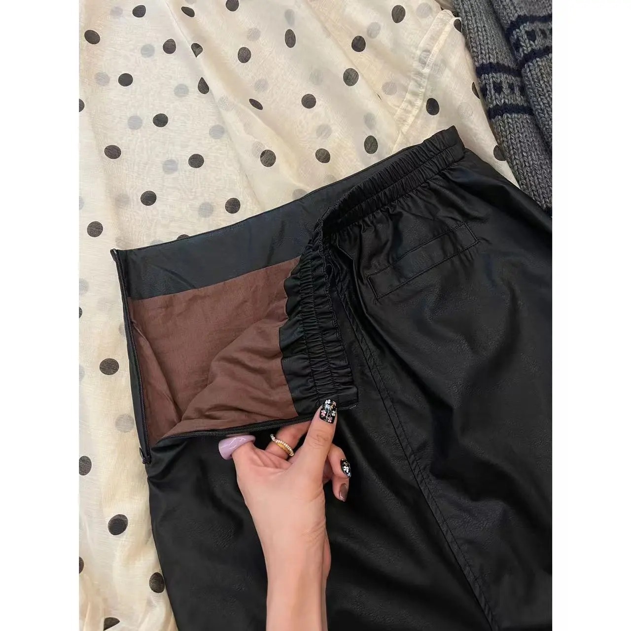 *o-ha-you*【FLCT2805】絕版><隱藏限量款~假兩件拼接皮半裙! pu皮人棉兩件疊穿感個性百搭優雅秋冬半身裙~下單後盡力搶~搶不到別怪我