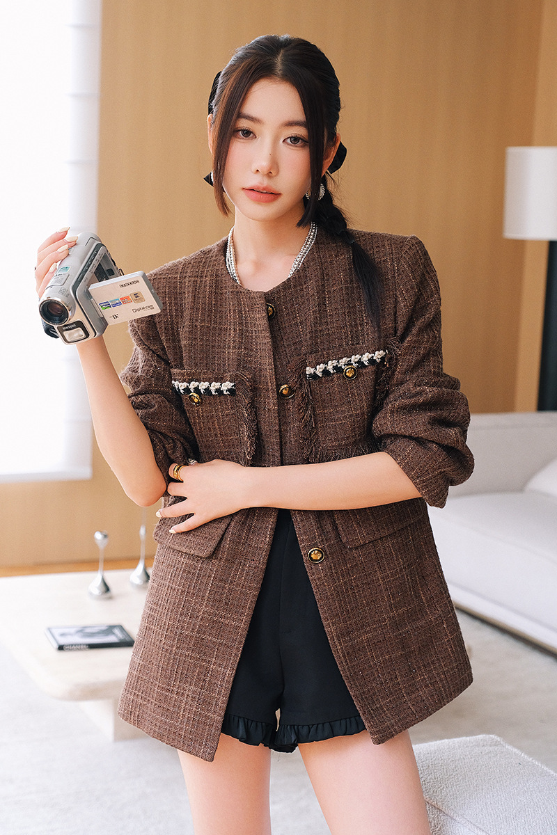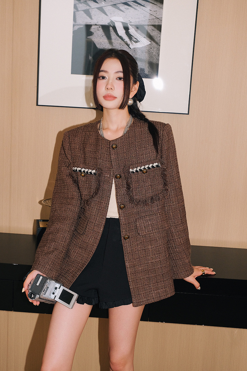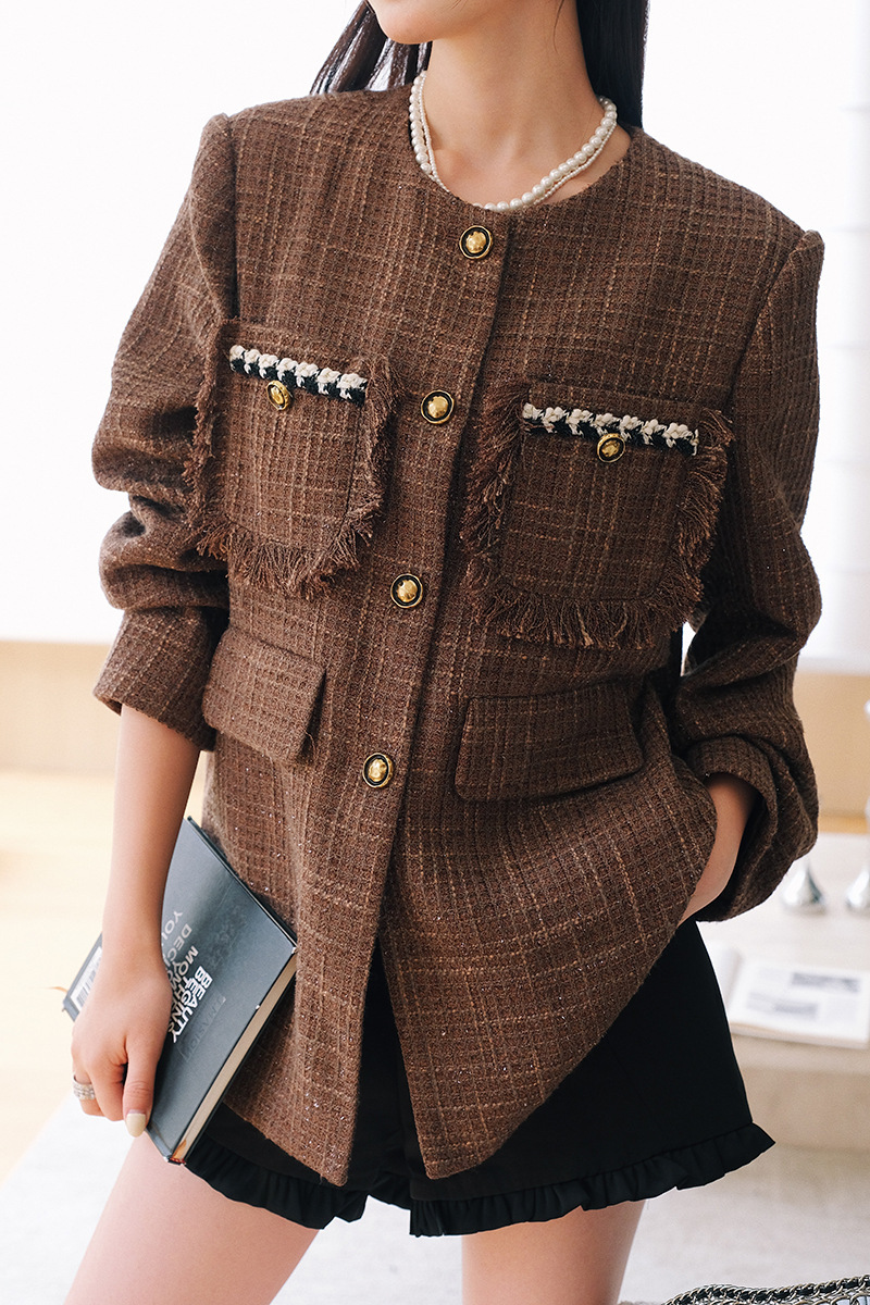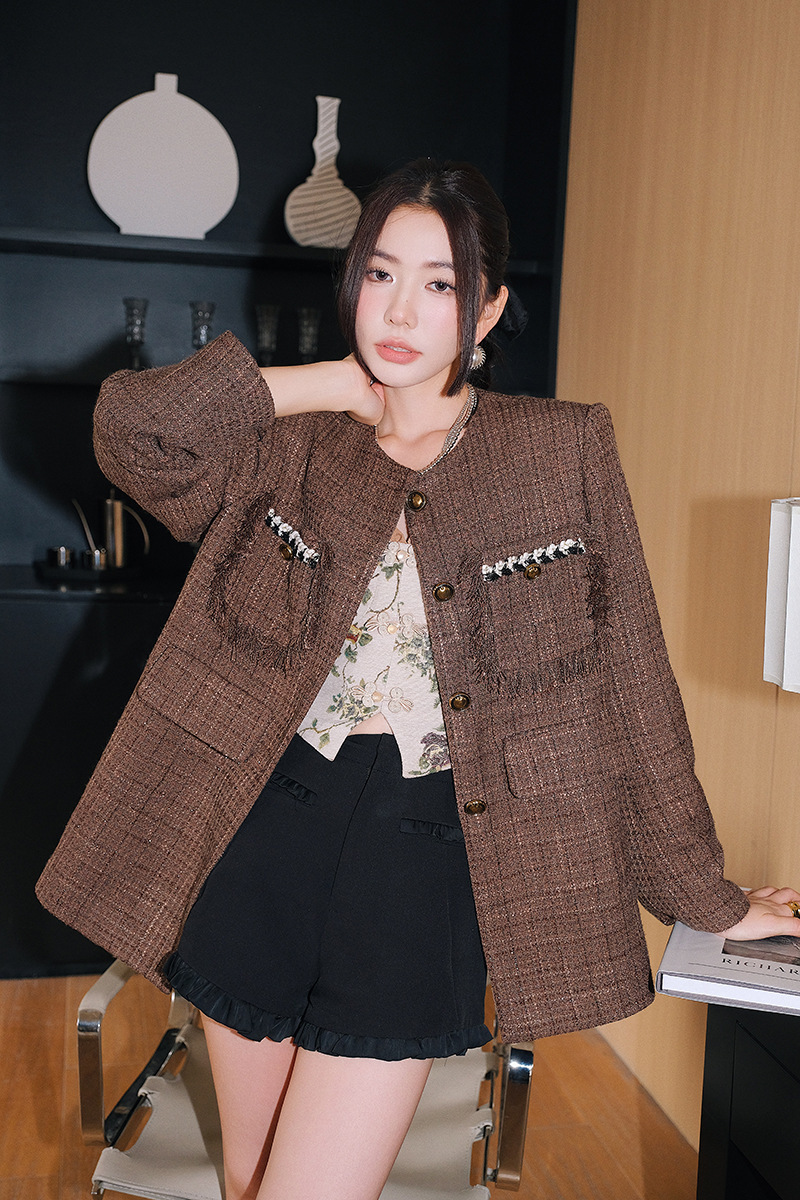 *o-ha-you*【FLKD1001】復古法式小香風咖色格紋薄呢外套流蘇邊圓領通勤氣質上衣