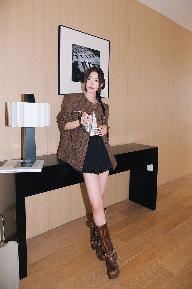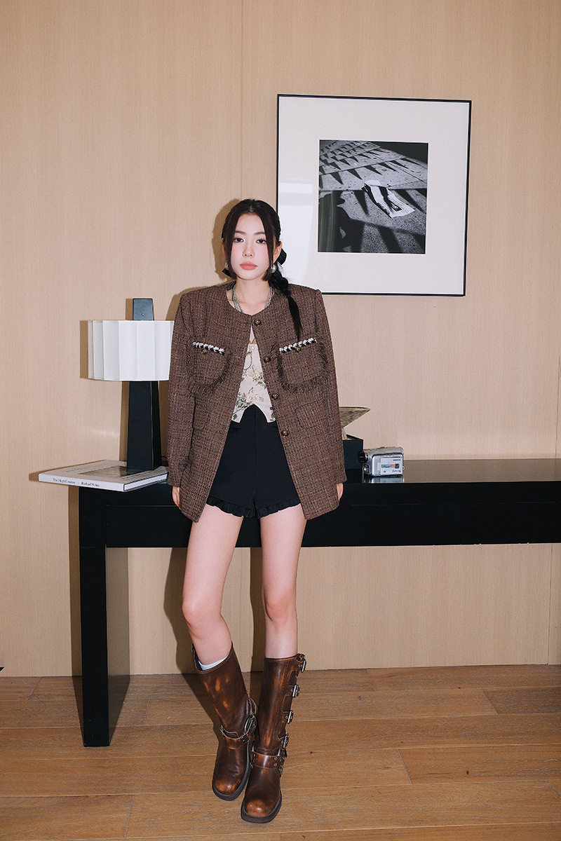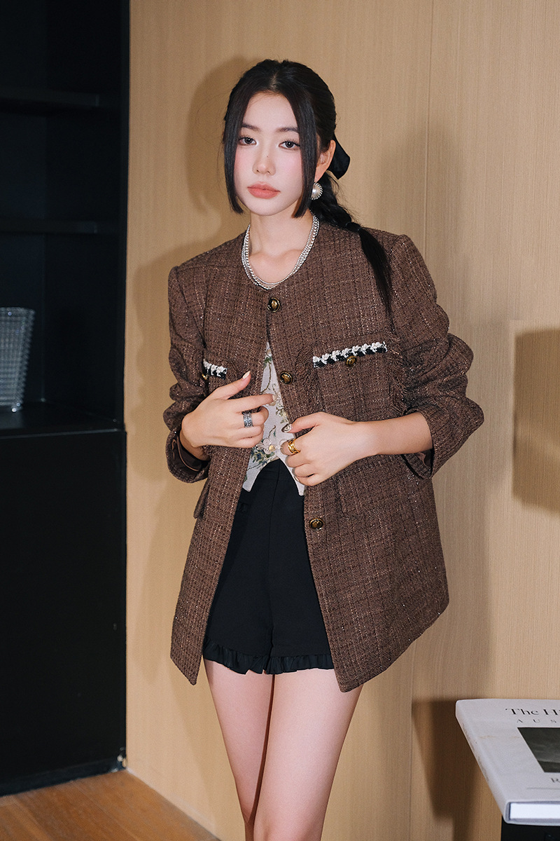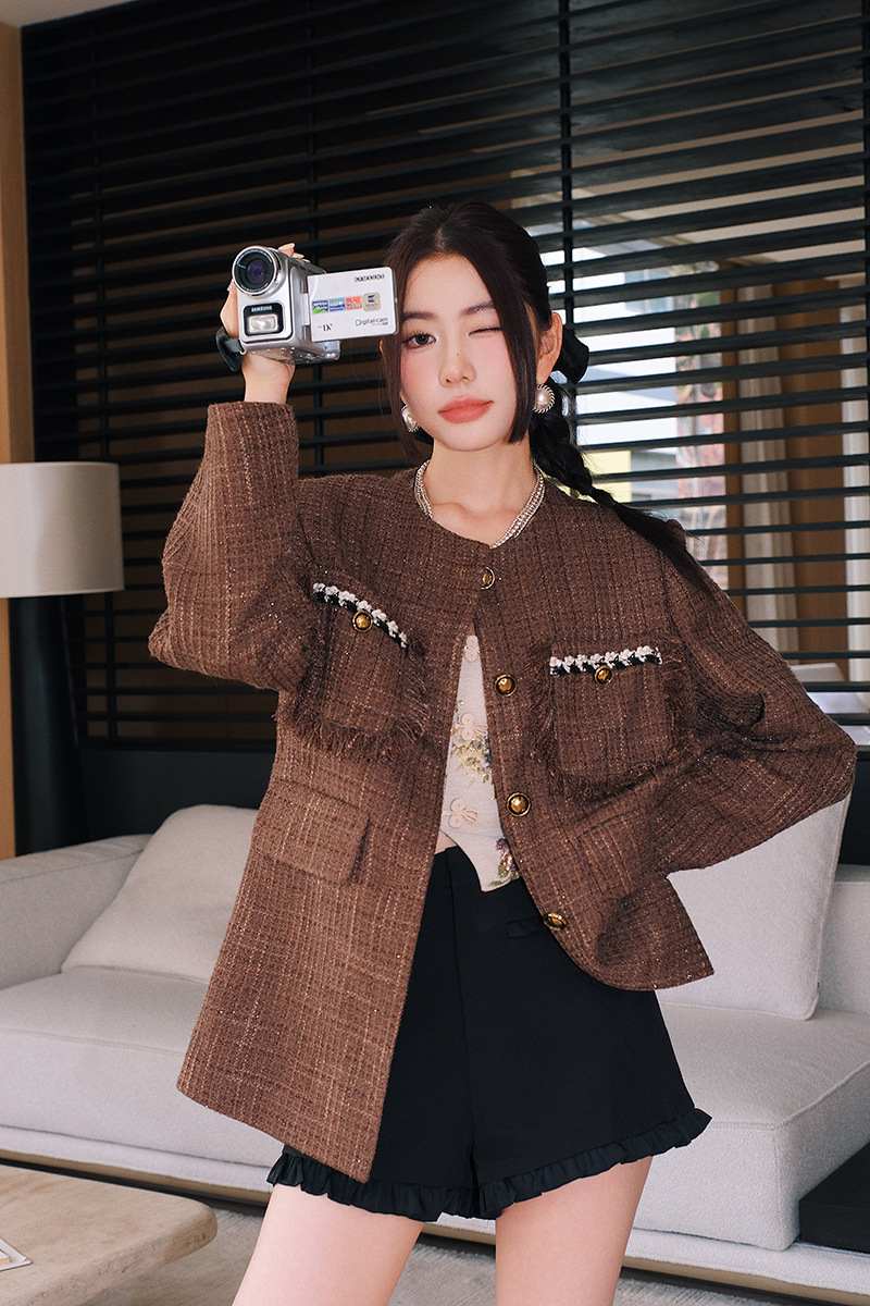 *o-ha-you*【FLKD1001】復古法式小香風咖色格紋薄呢外套流蘇邊圓領通勤氣質上衣