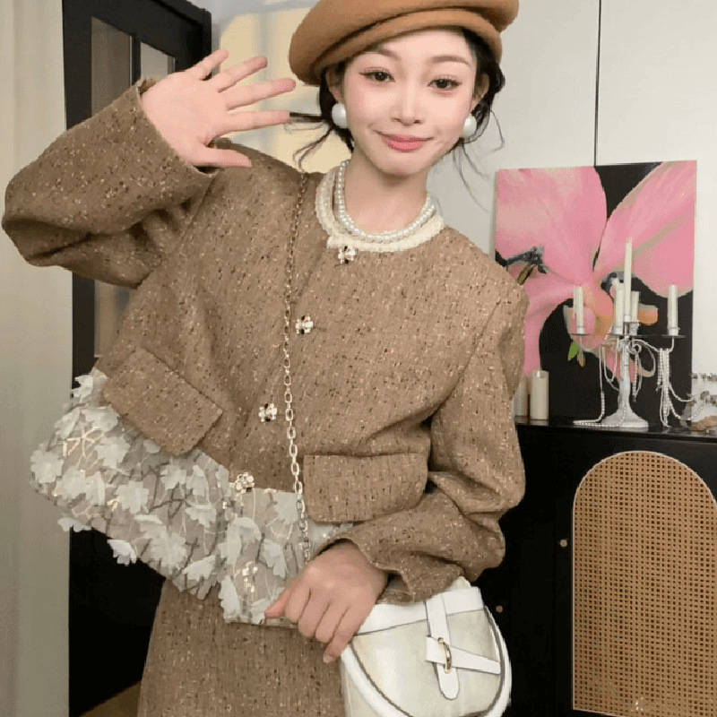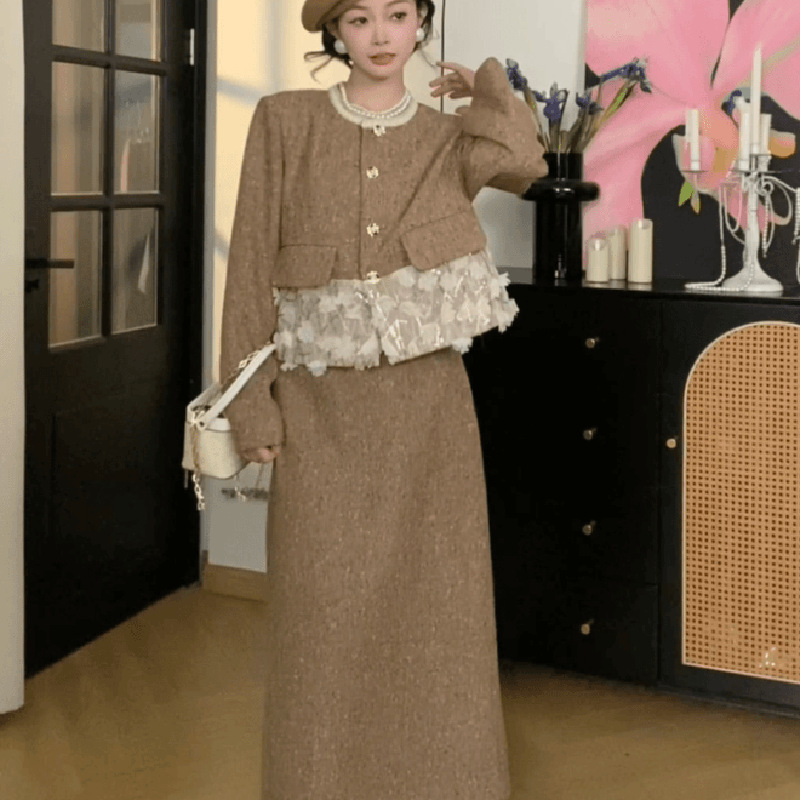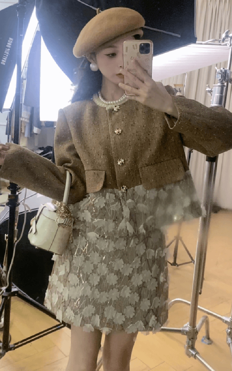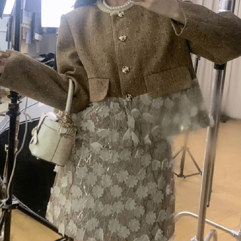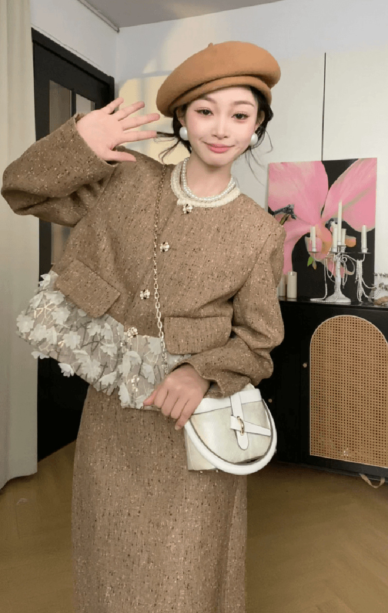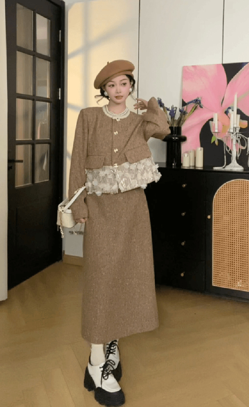 *o-ha-you*【FLKD5089】南洋千金半身裙子套裝卡其色復古設計小香風優雅秋裝