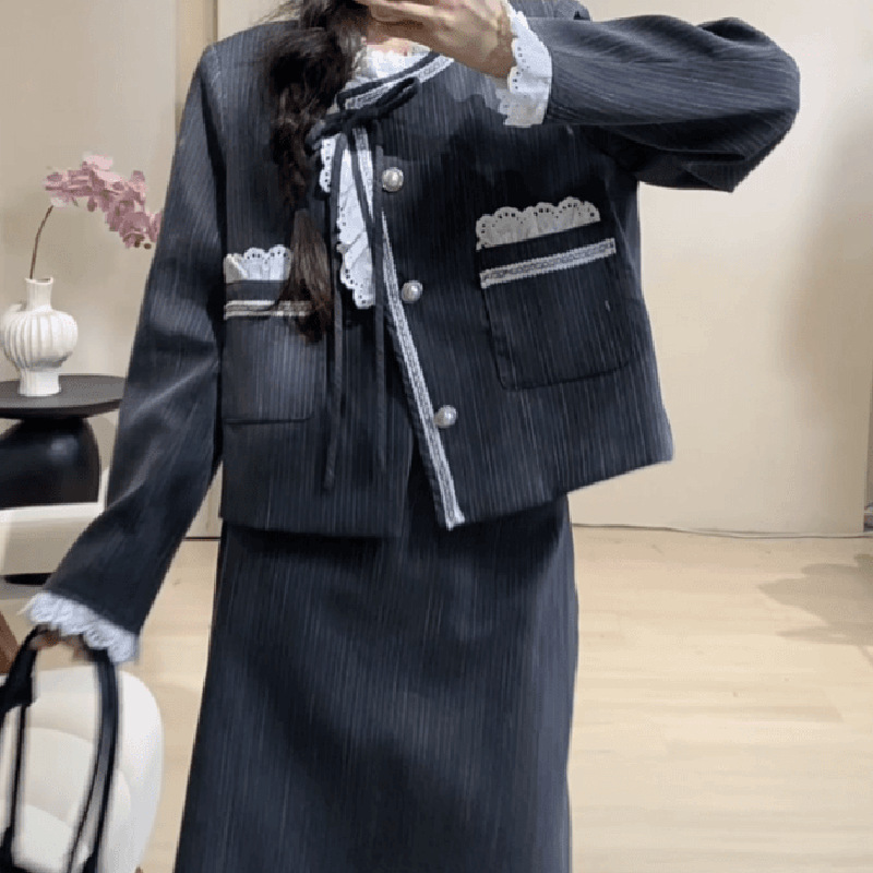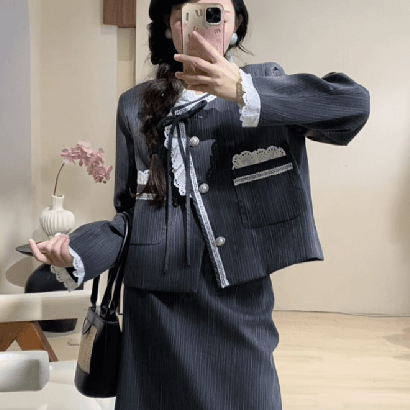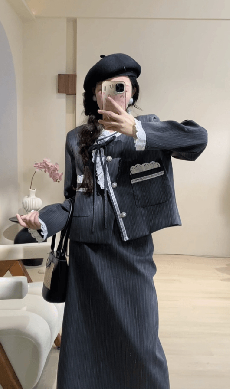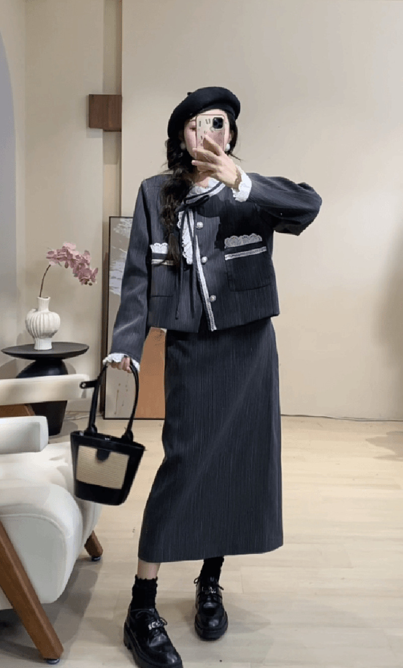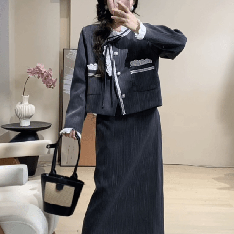 *o-ha-you*【FLKD5092】知否知否長裙套裝深灰色名媛優雅小眾設計感品牌女裝秋季潮