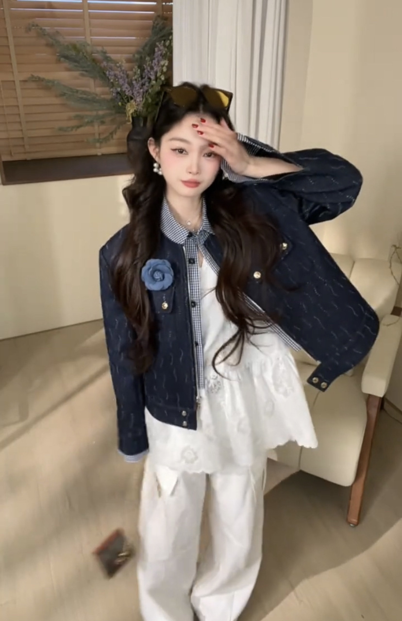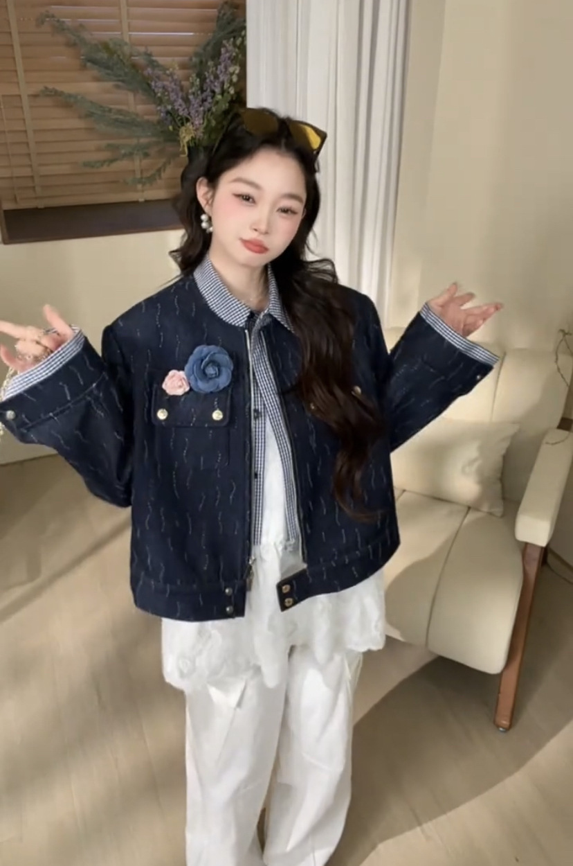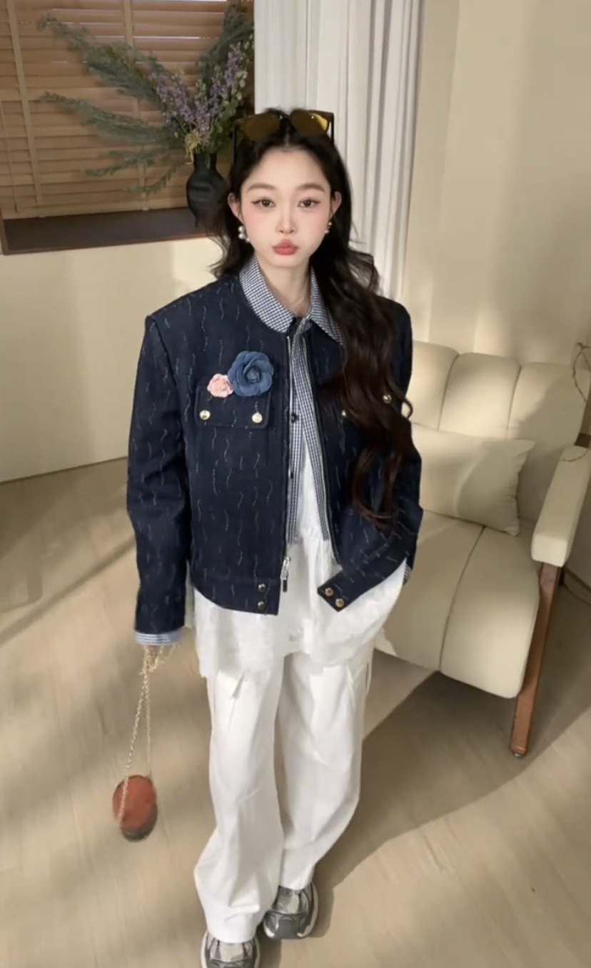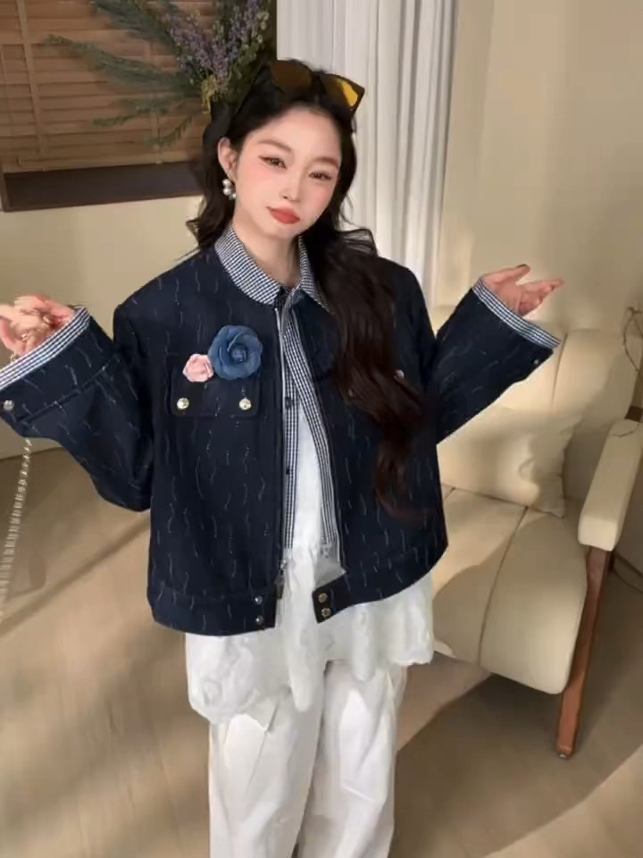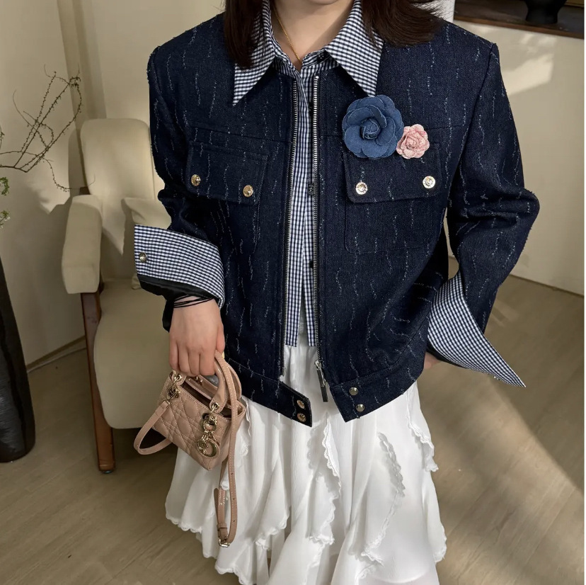 *o-ha-you*【FLKDD2025015】花朵深藍色上衣夾克帥氣機車網紅春季假兩件牛仔外套2025新款高級感氣質時尚短版