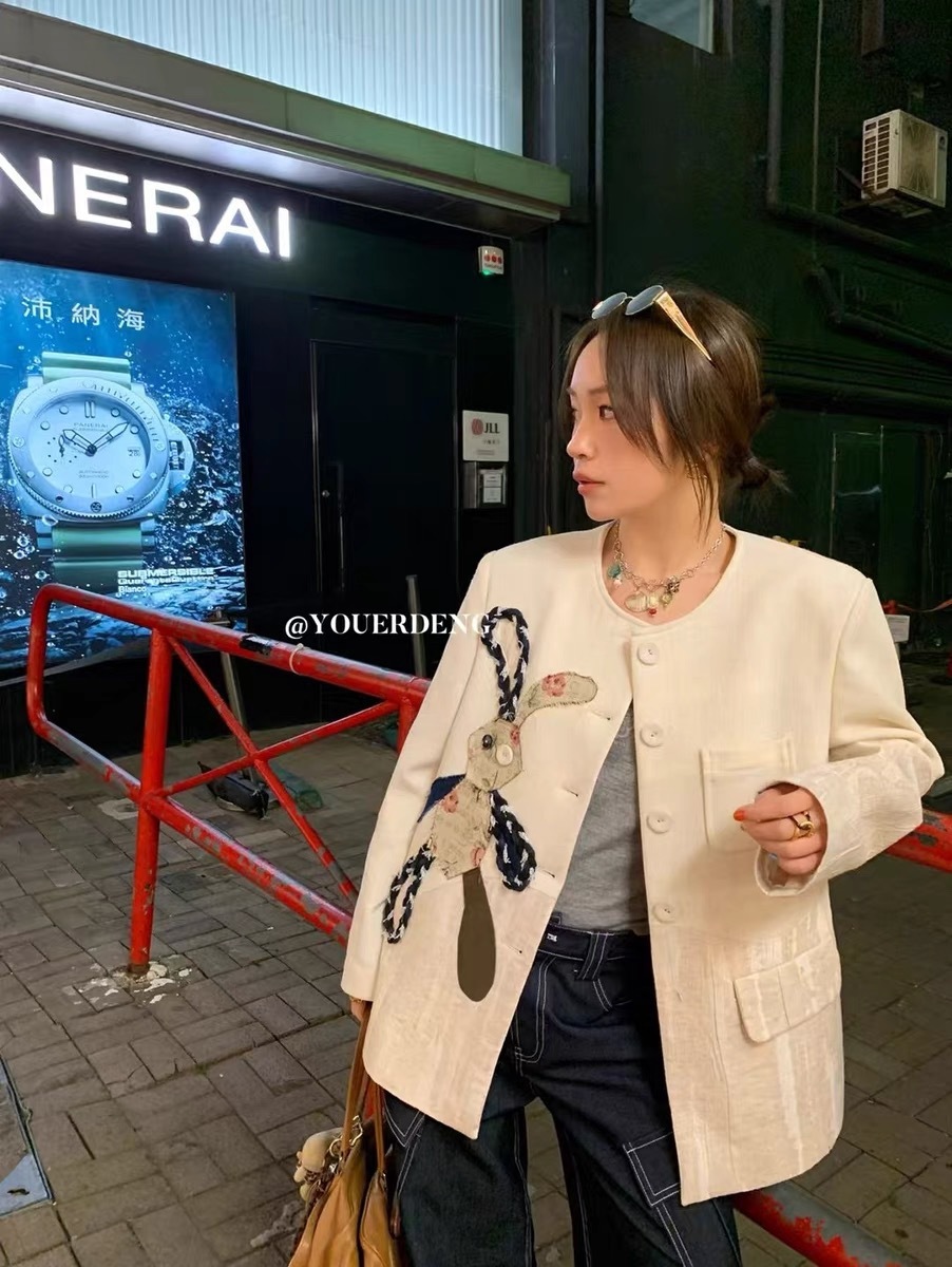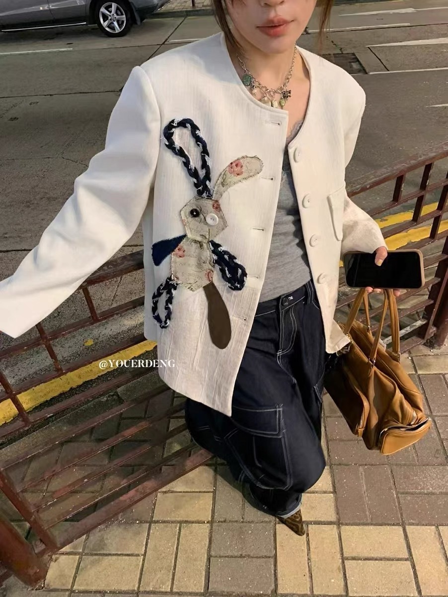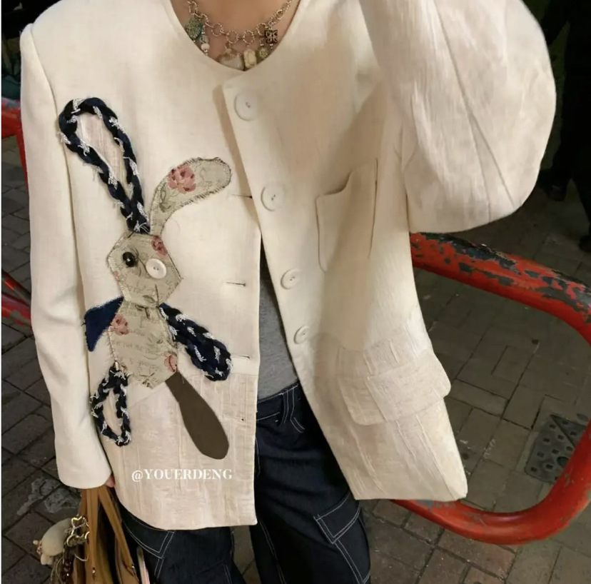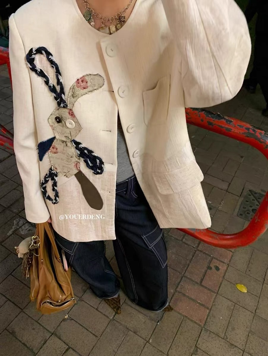 *o-ha-you*【FLKDD2025024】2025年春季新款小眾設計感西裝外套兔子圓領上衣韓版貼布刺繡寬鬆外套