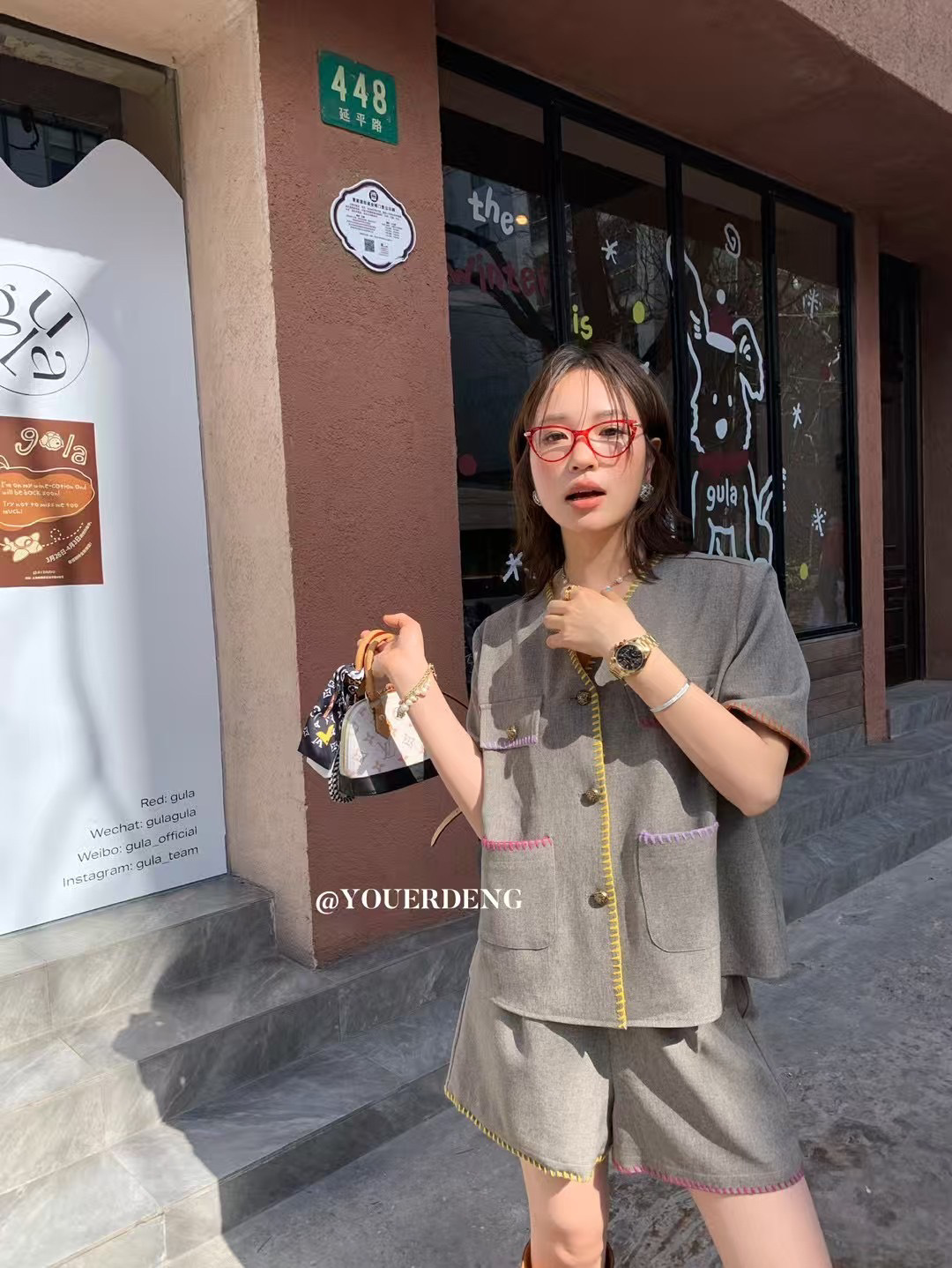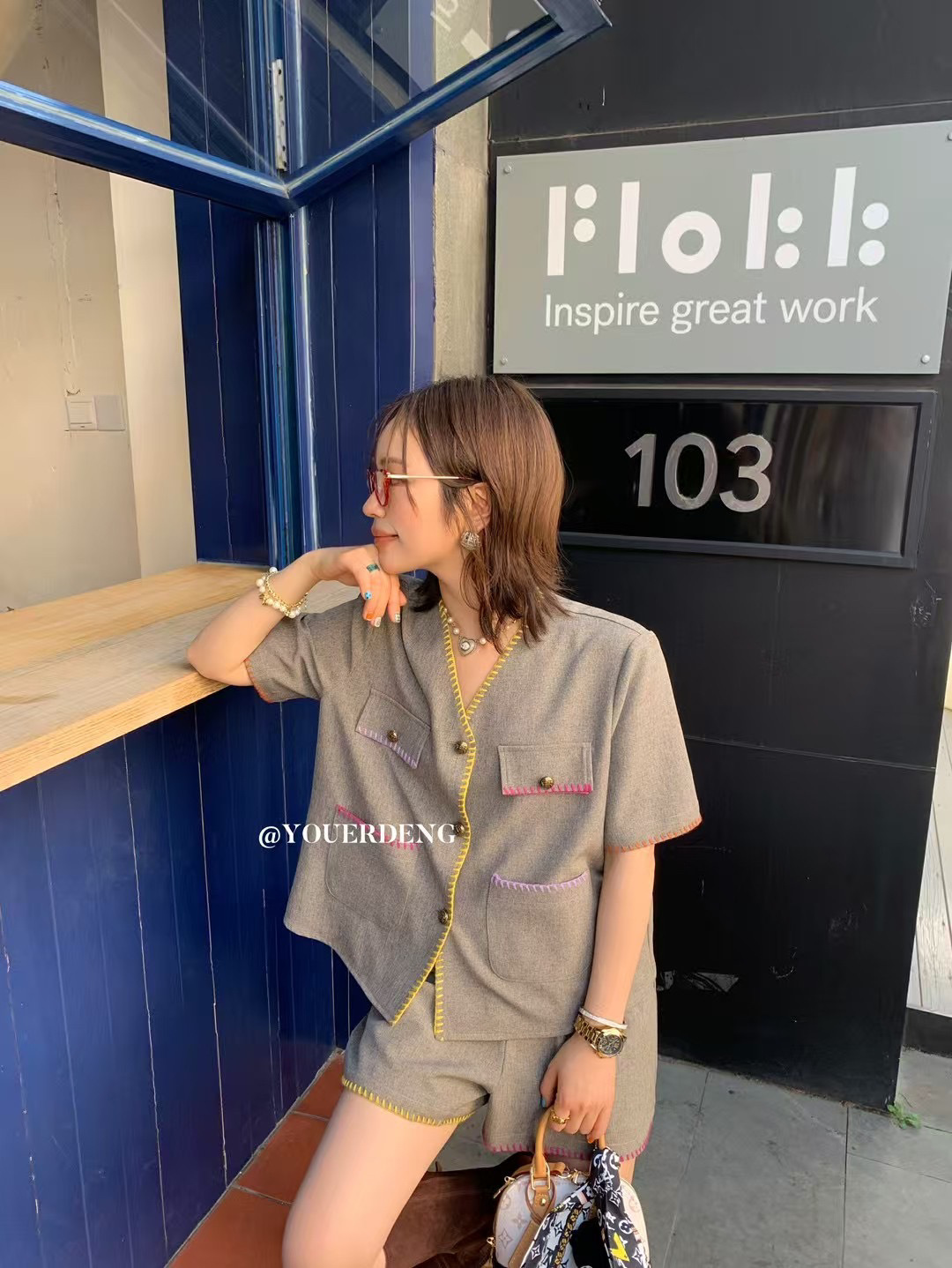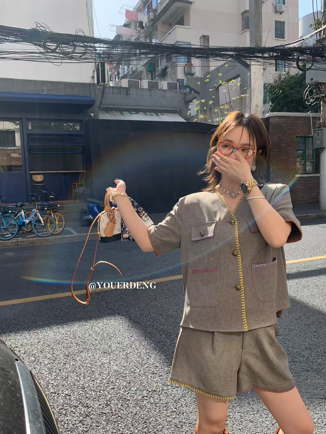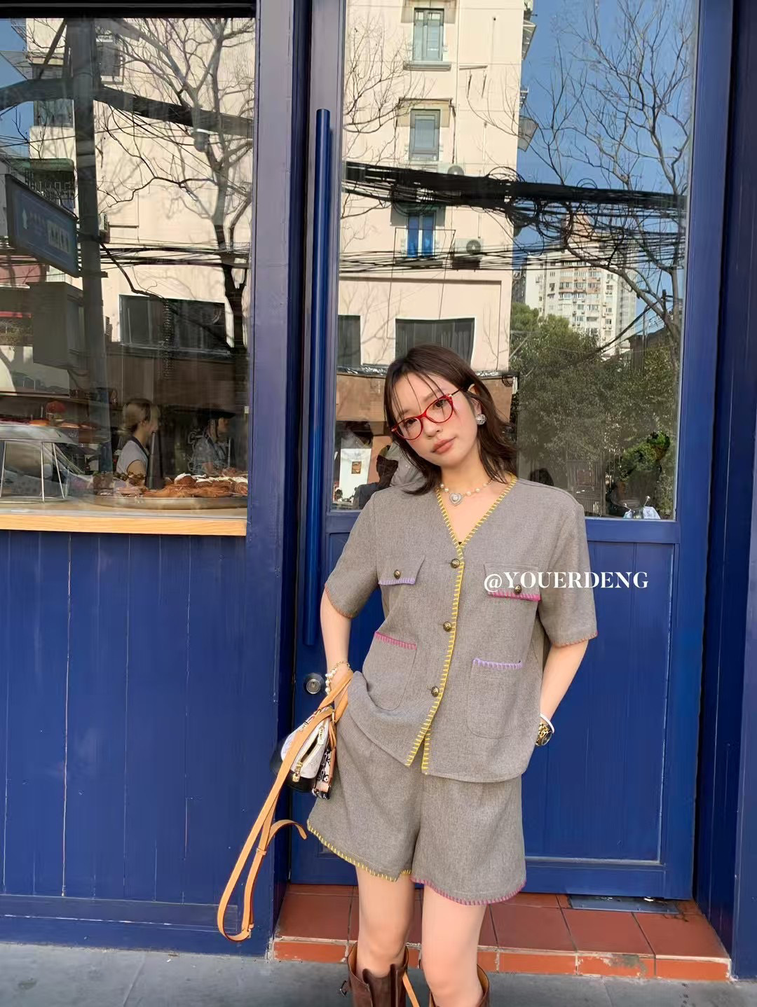 *o-ha-you*【FLKDD2025031】2025夏季甜美小眾設計感時髦套裝V領上衣短褲兩件套