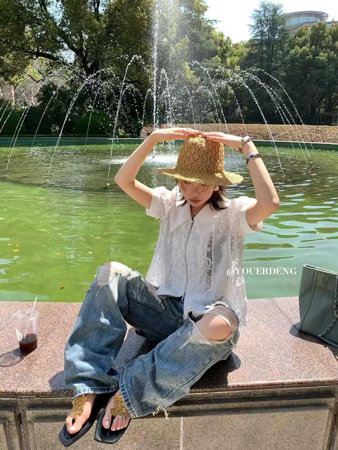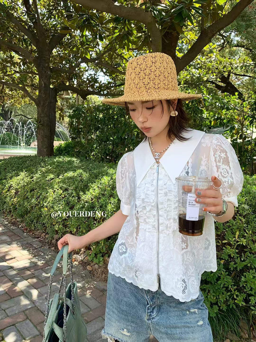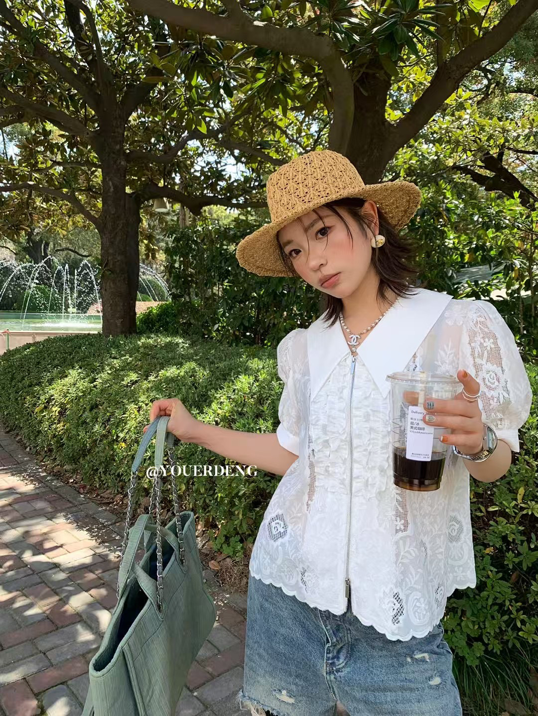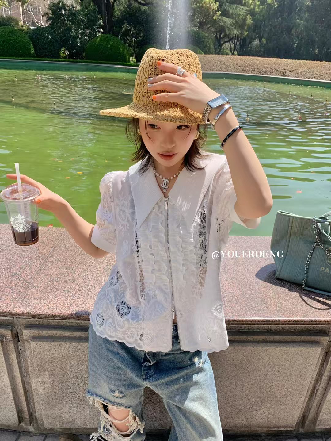 *o-ha-you*【FLKDD2025032】2025夏百搭韓系蕾絲拼接襯衫上下開拉鍊小姐姐短袖微透感小衫上衣小眾名媛寬鬆版小個子甜美上衣