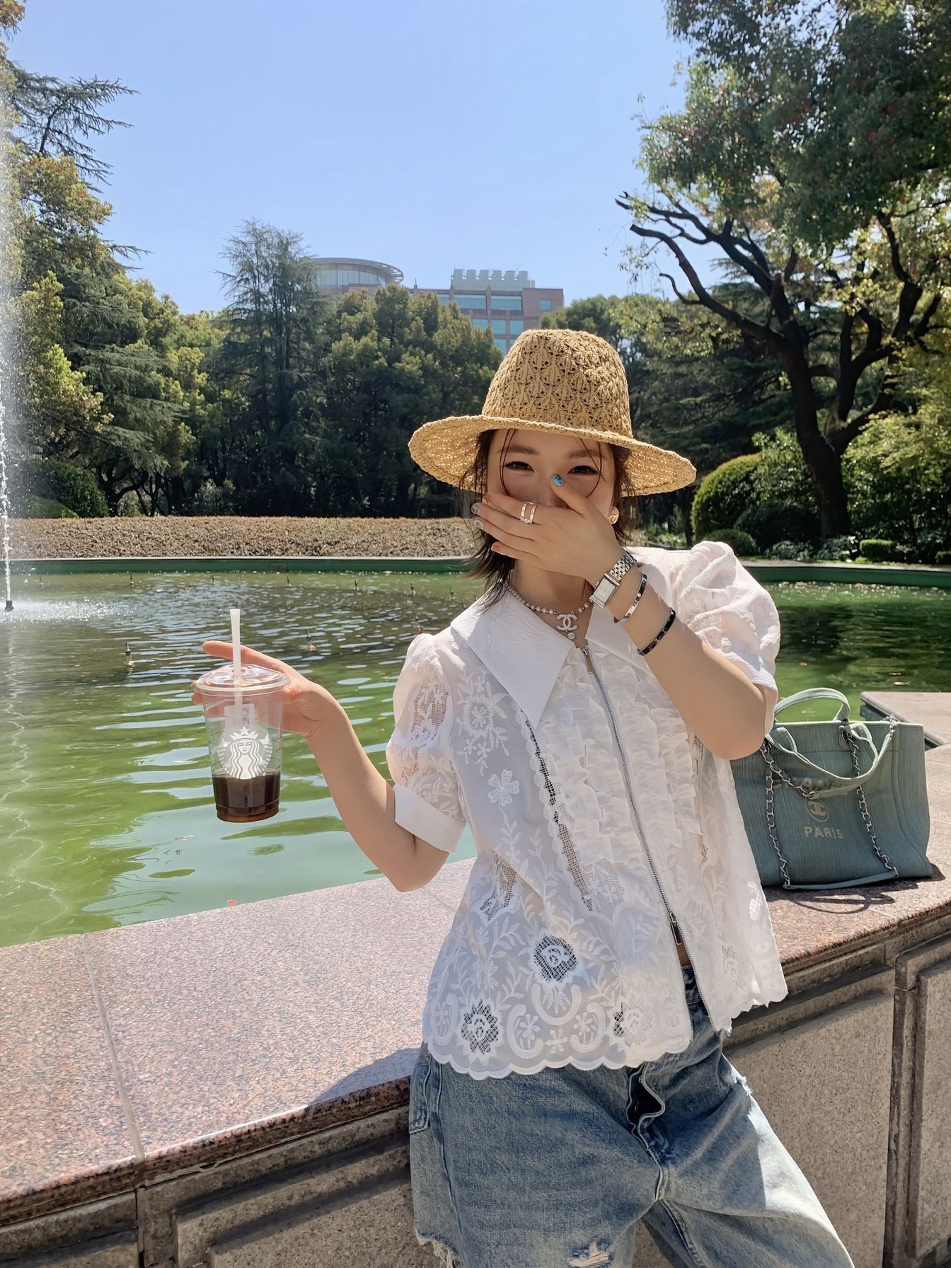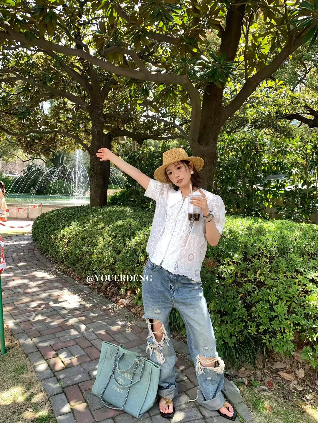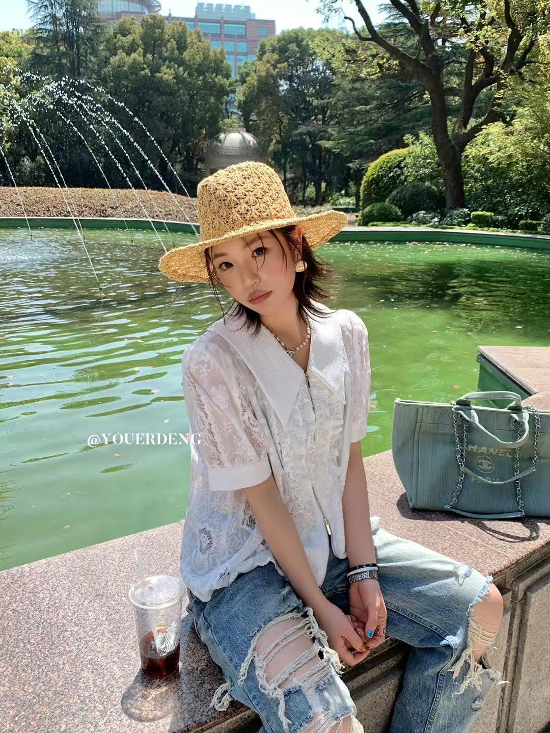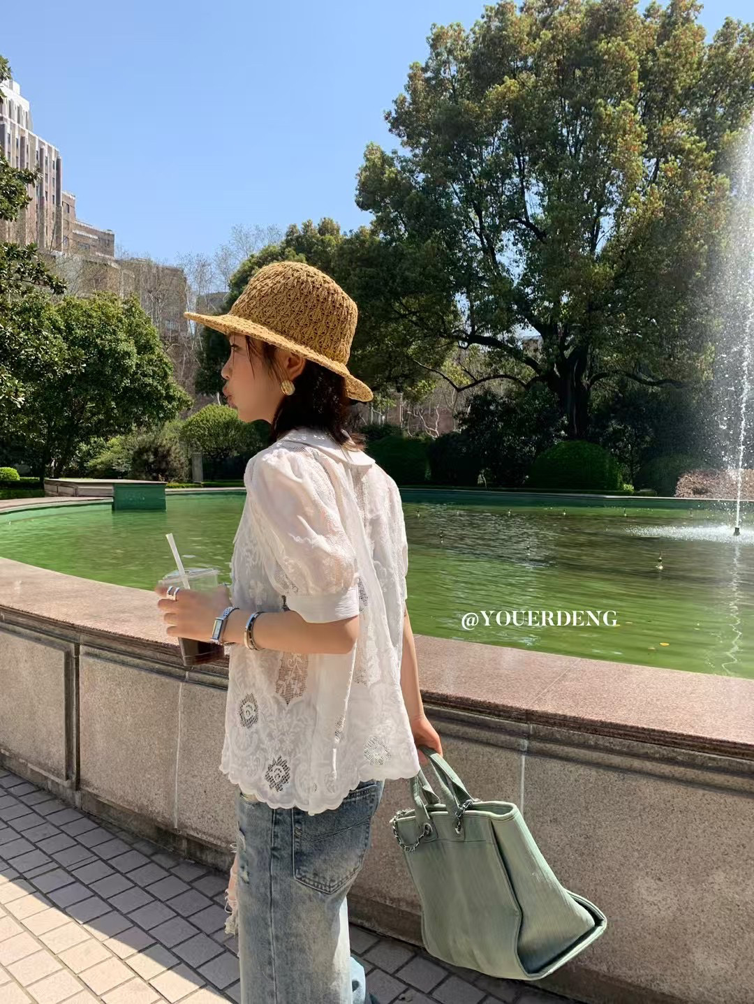 *o-ha-you*【FLKDD2025032】2025夏百搭韓系蕾絲拼接襯衫上下開拉鍊小姐姐短袖微透感小衫上衣小眾名媛寬鬆版小個子甜美上衣