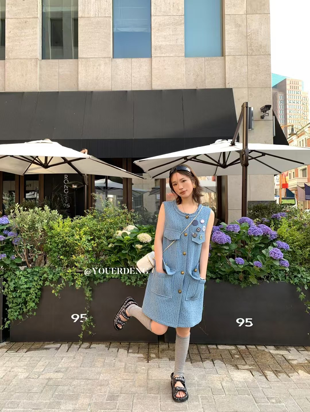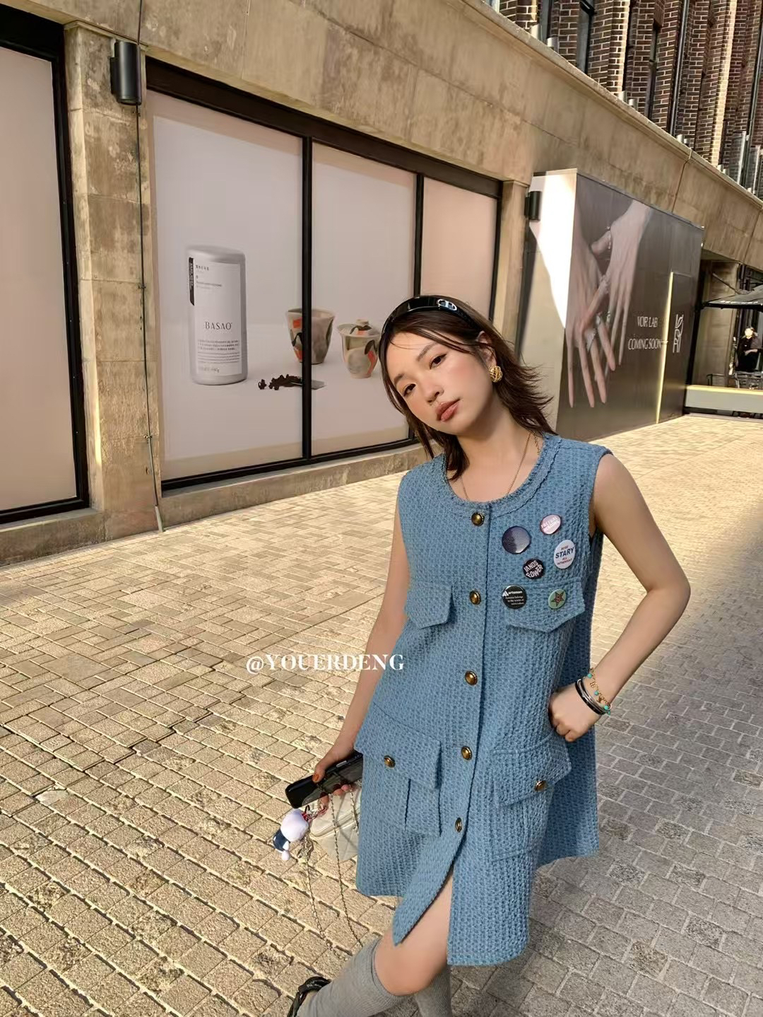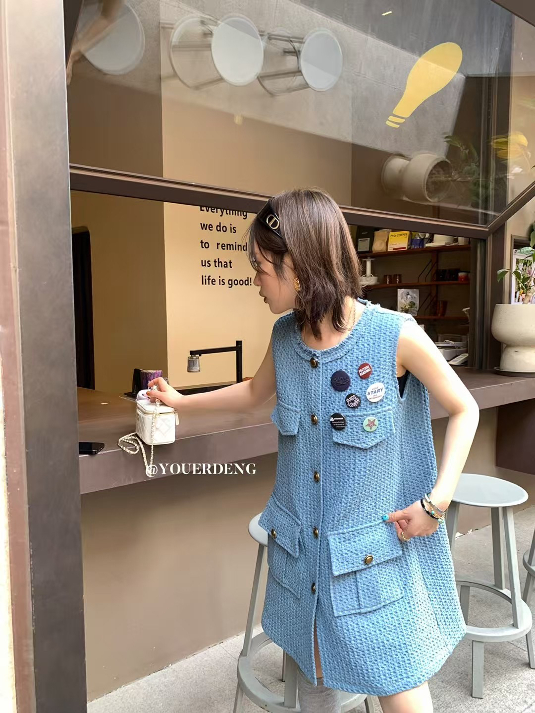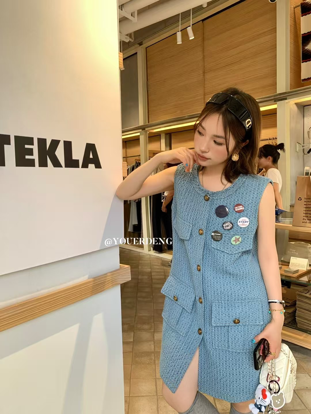 *o-ha-you*【FLKDD2025033】2025夏季小香風設計連衣裙直筒短裙輕奢多口袋藍色小眾設計感背心裙洋裝