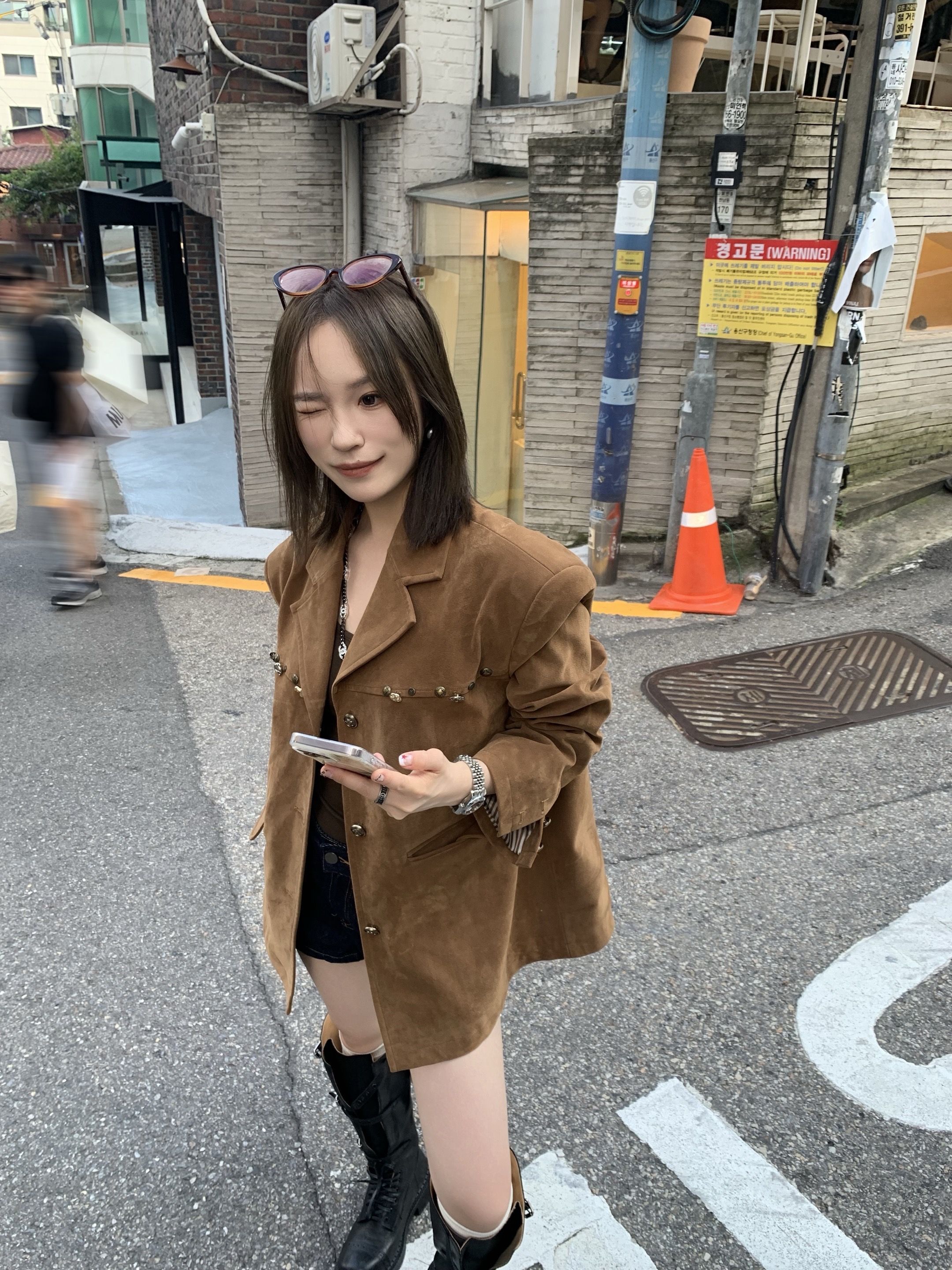 *o-ha-you*【FLKDD2025050】秋季新款設計感西裝領咖色外套 時尚潮酷墊肩上衣