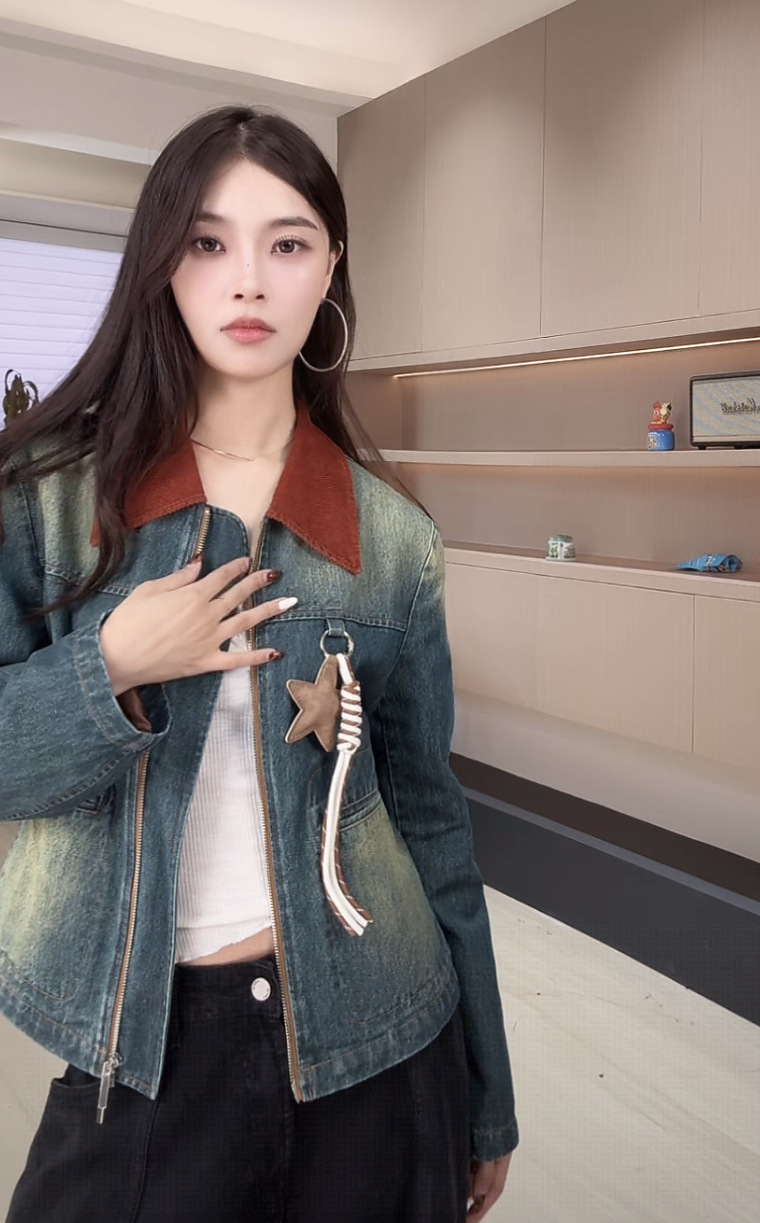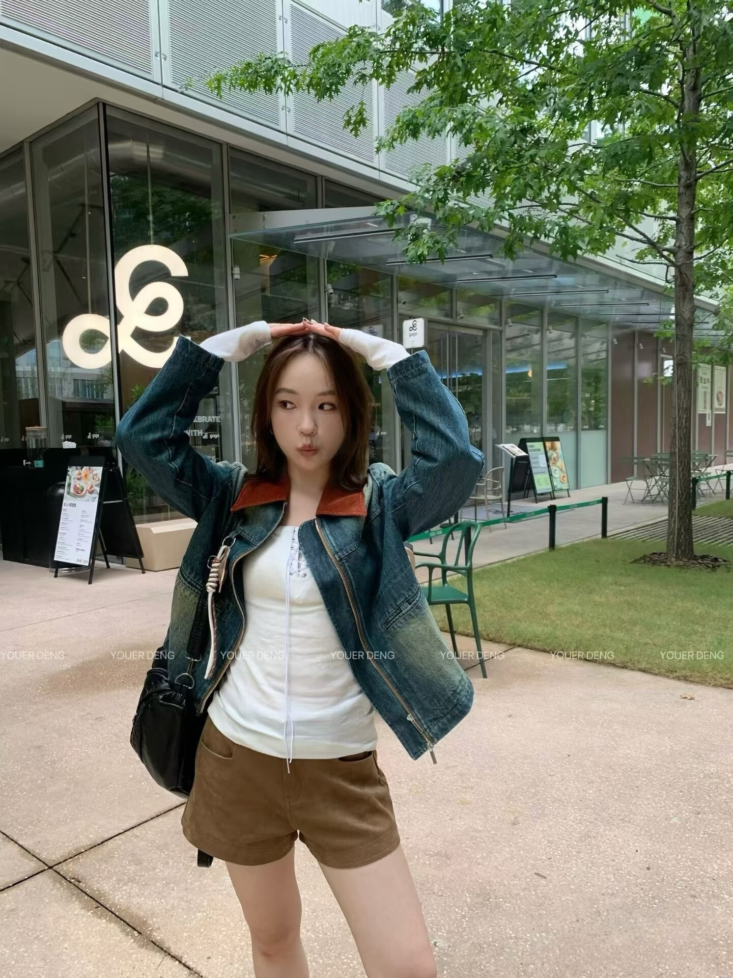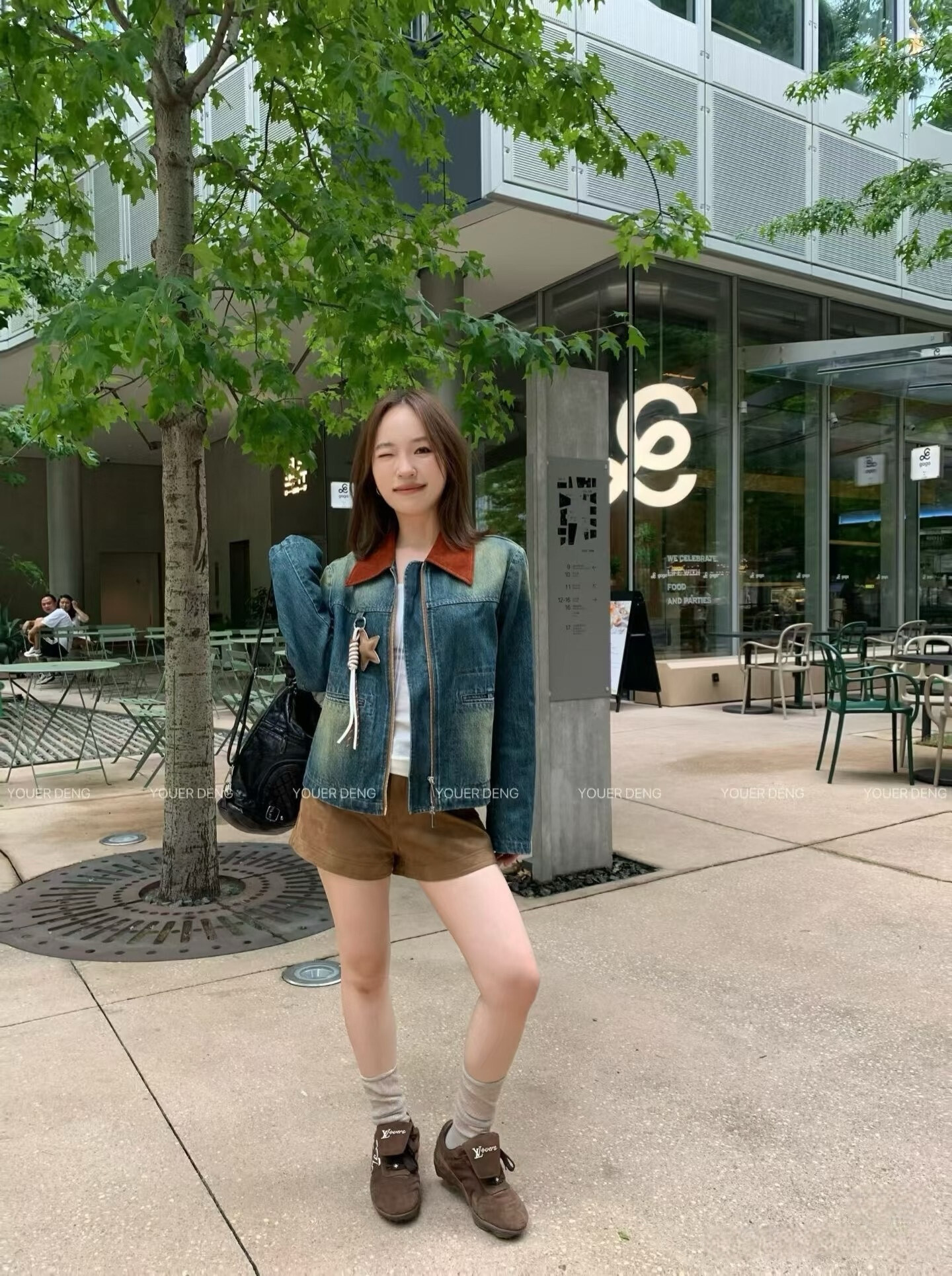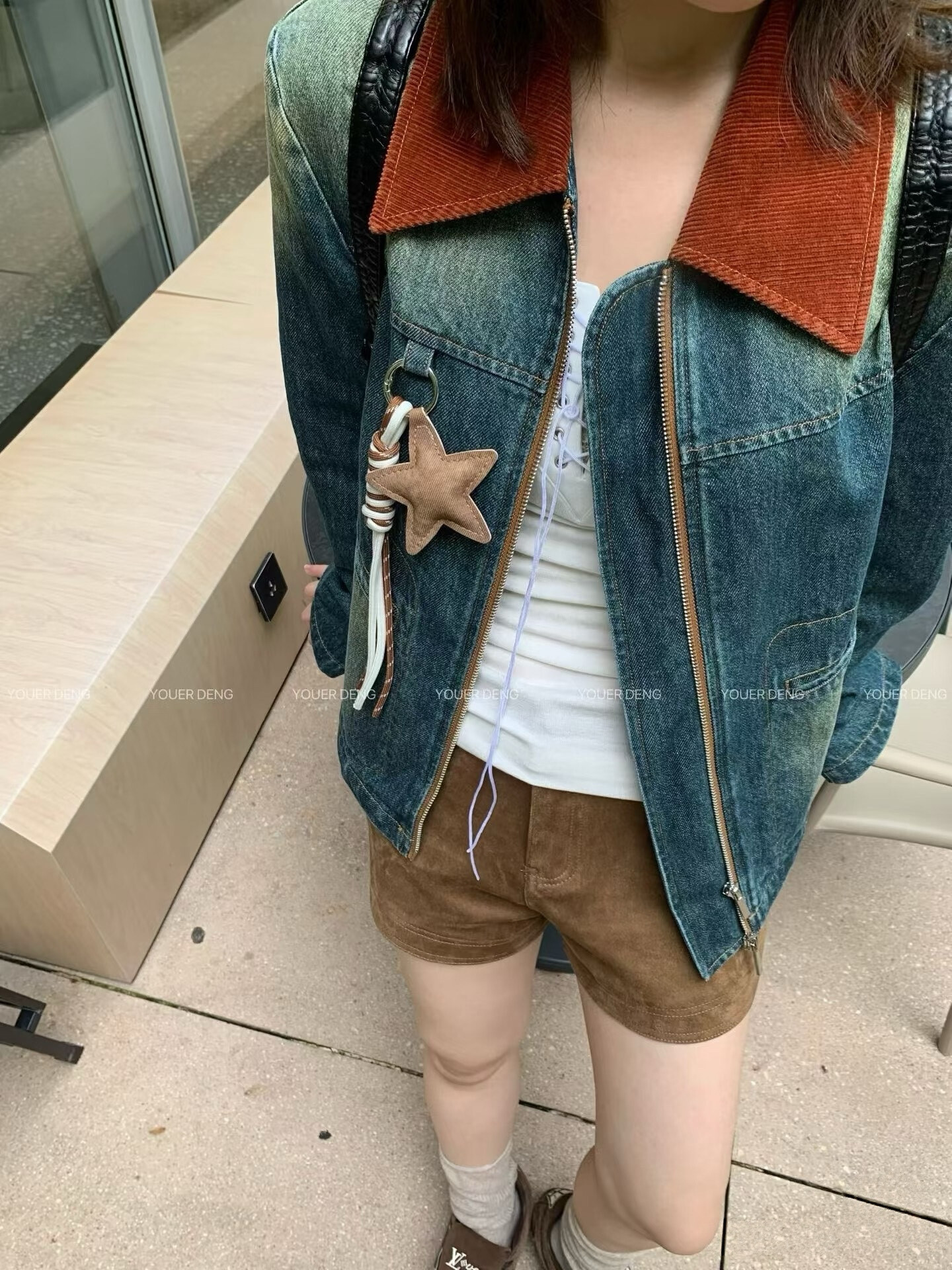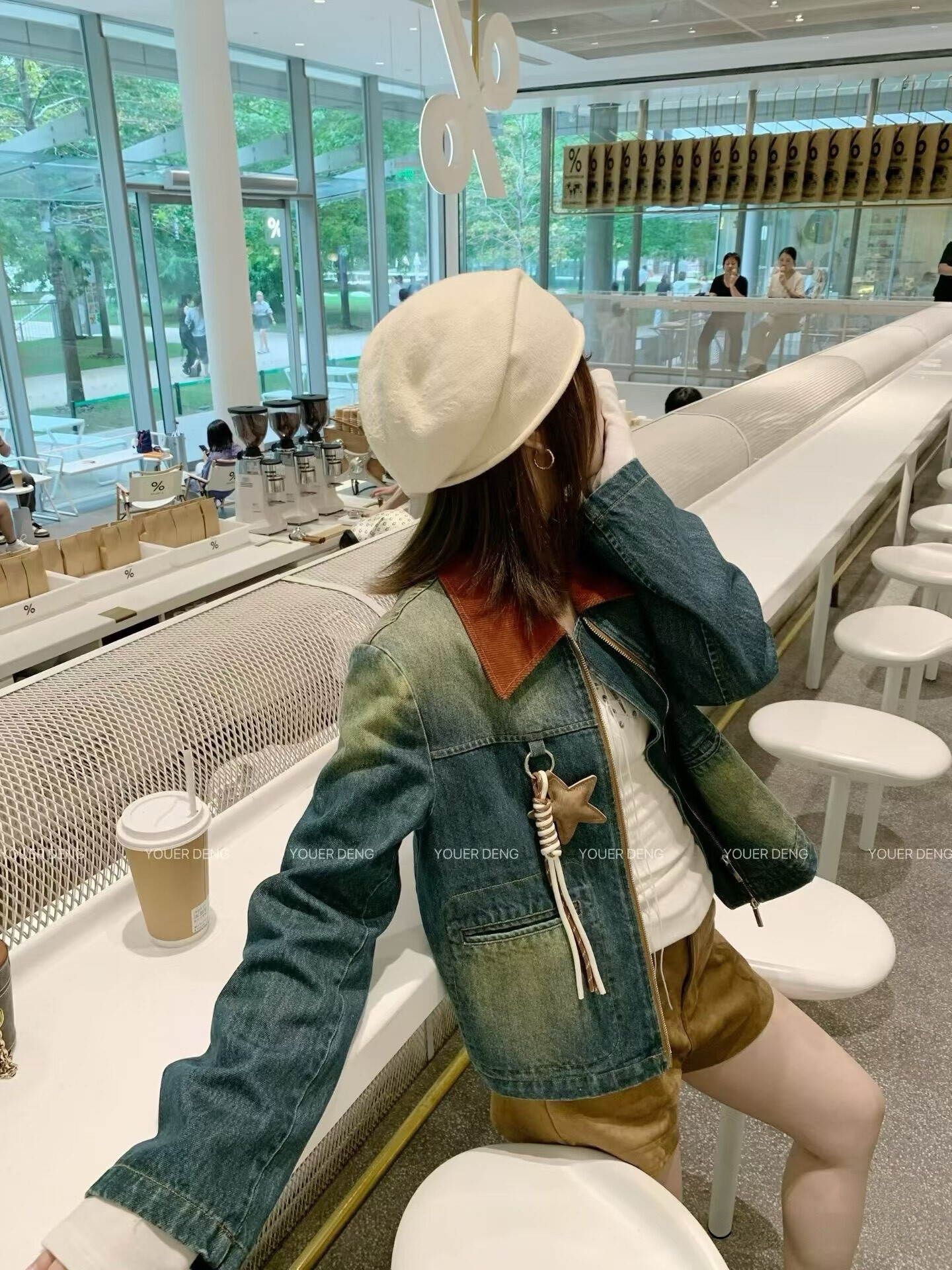 *o-ha-you*【FLKDD2025054】【復古牛仔】街頭撞色領翻領外套小眾帥氣機車上衣秋季新夾克