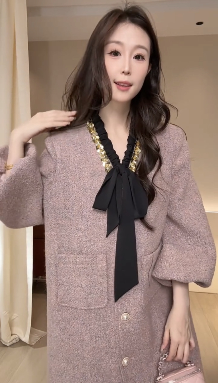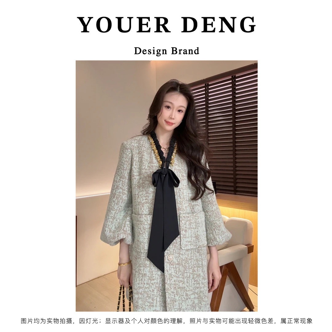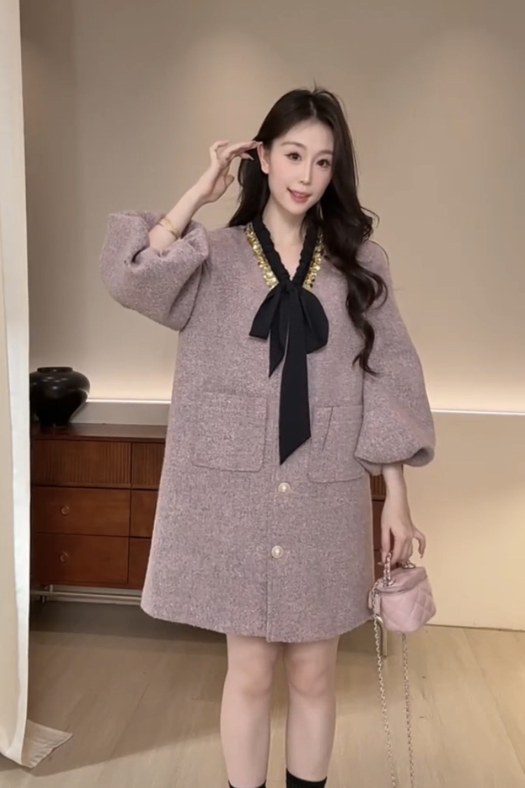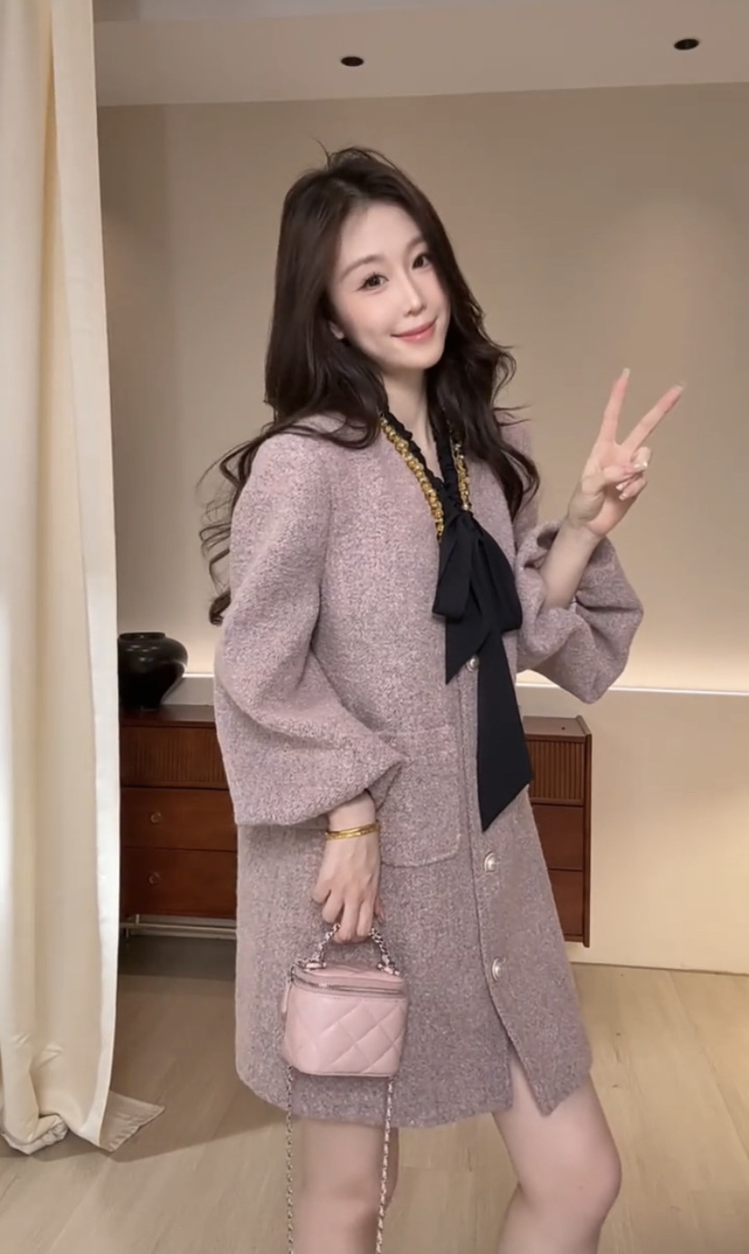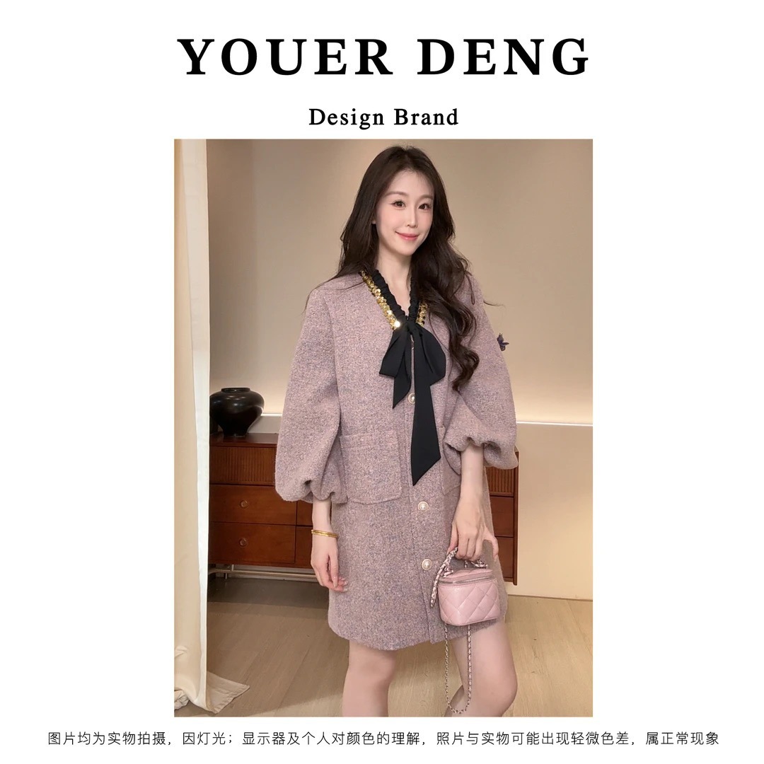 *o-ha-you*【FLKDD2025069】秋冬新款名媛溫柔氣質減齡小香風法式拼接洋裝韓版羊毛呢蝴蝶結寬鬆大衣-2色