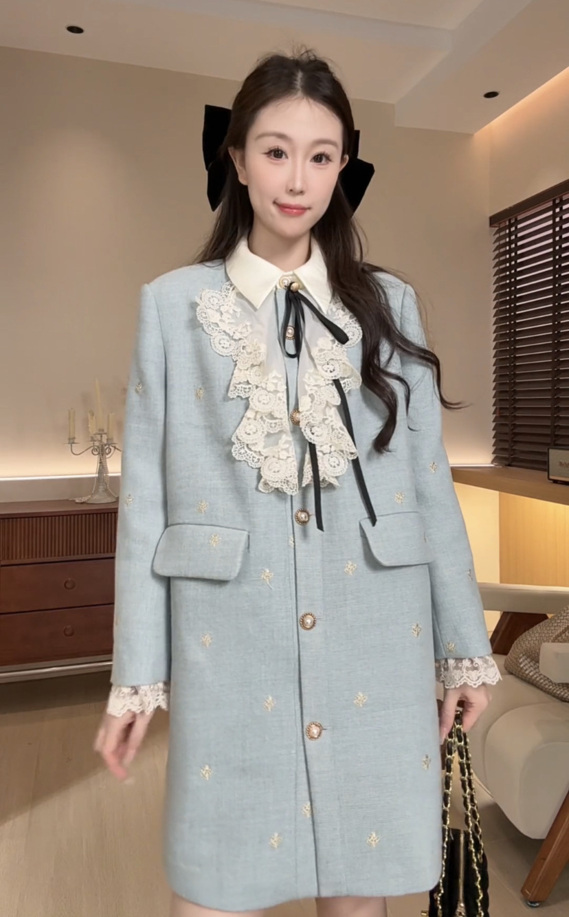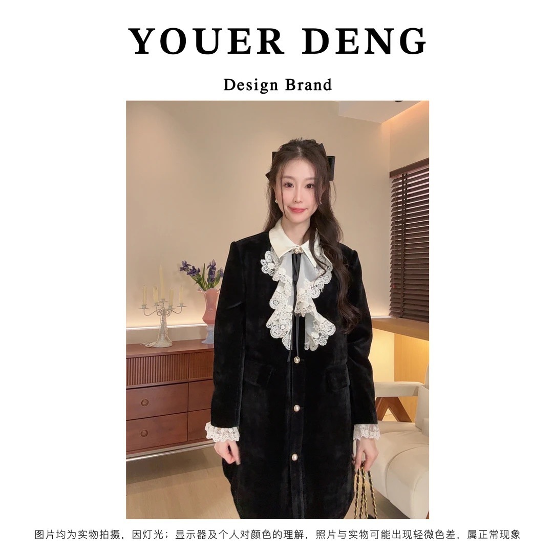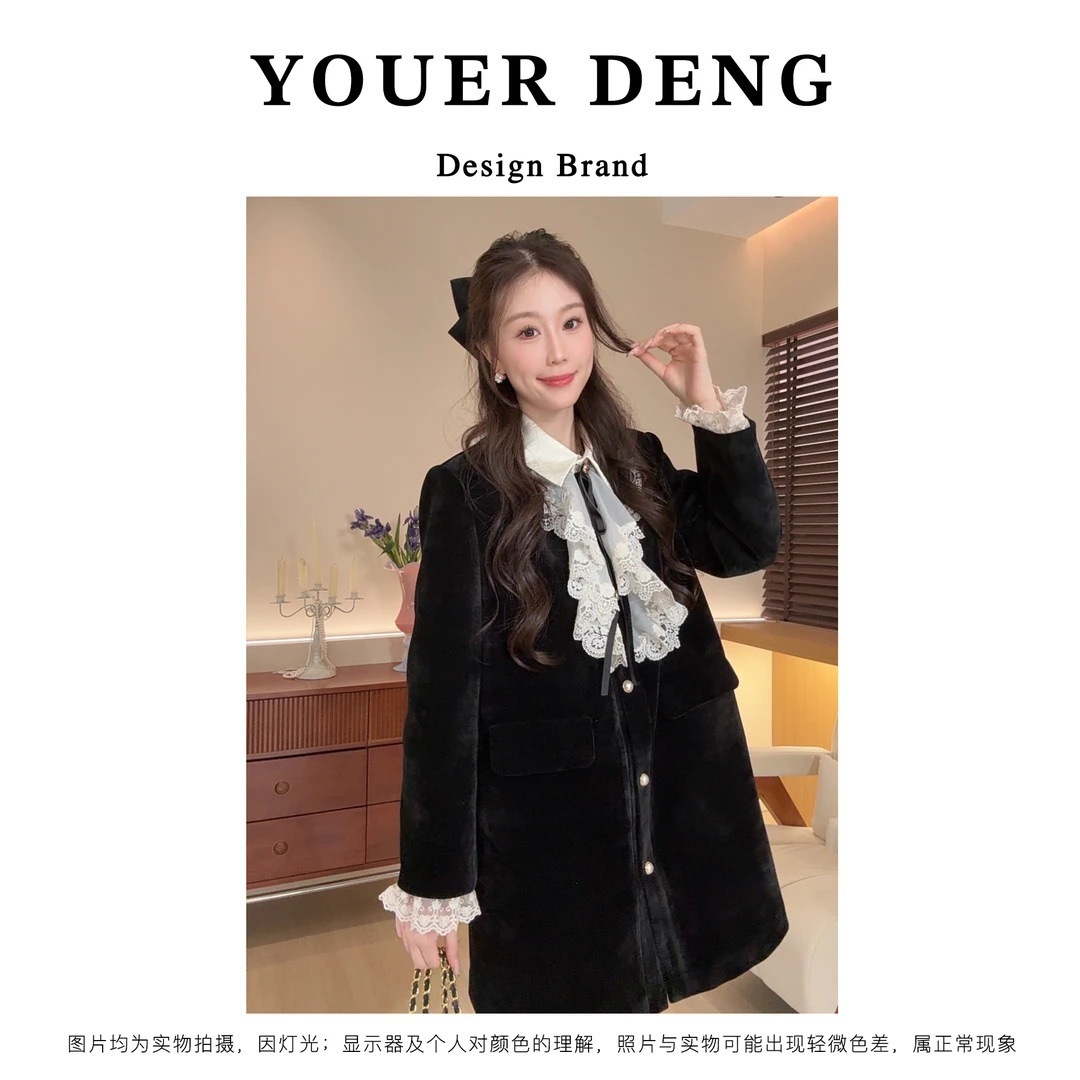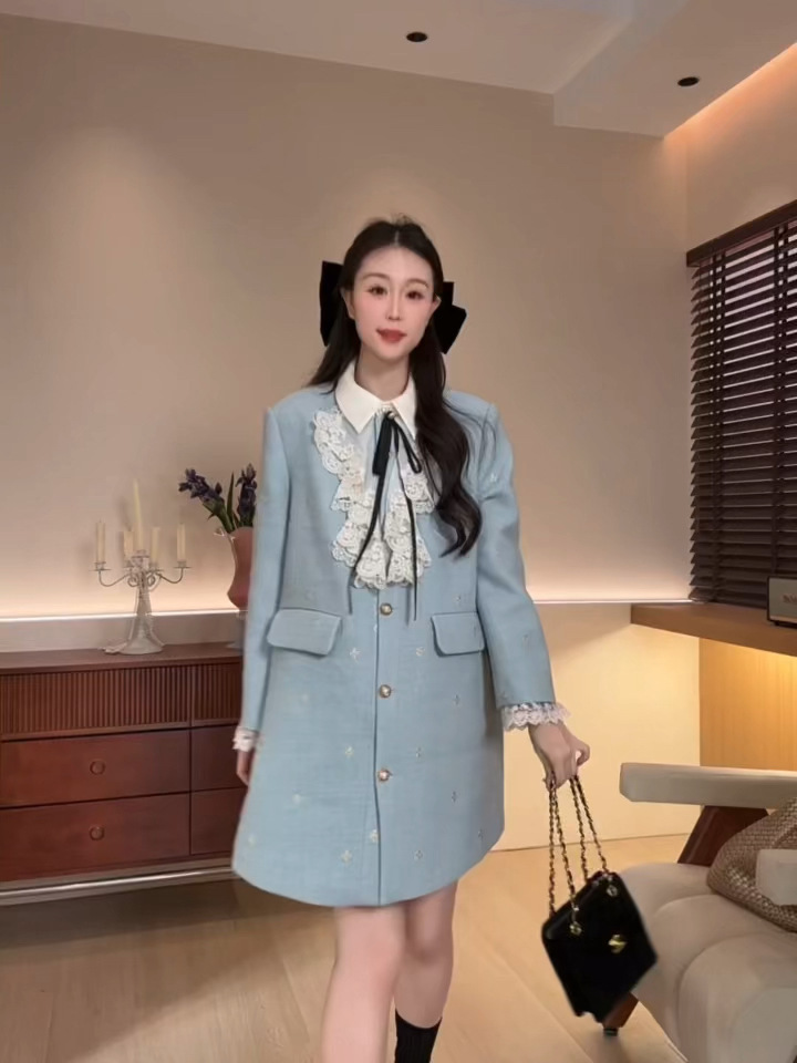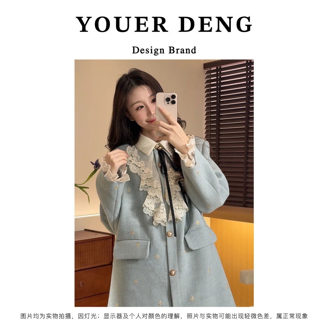 *o-ha-you*【FLKDD2025070】秋冬小眾精緻毛呢名媛溫柔毛呢蝴蝶結連衣裙外套白鴨絨厚實大衣中長蕾絲羽絨洋裝外套-2色