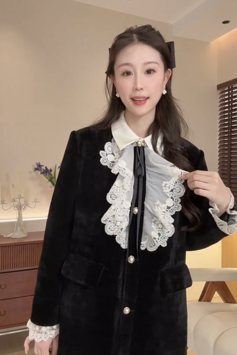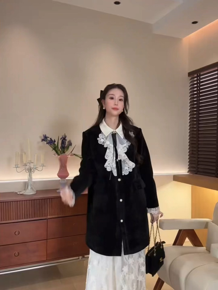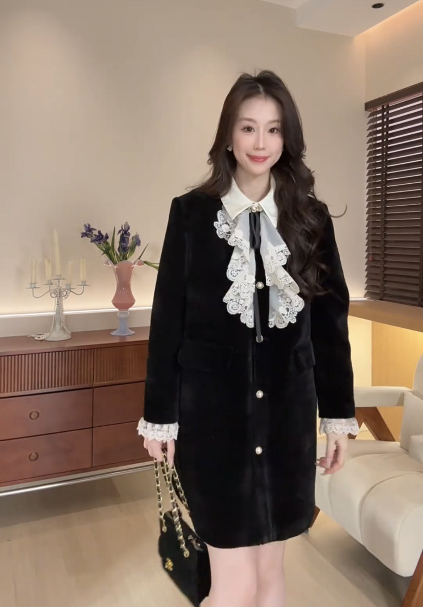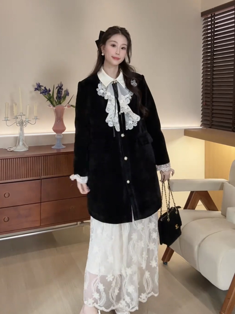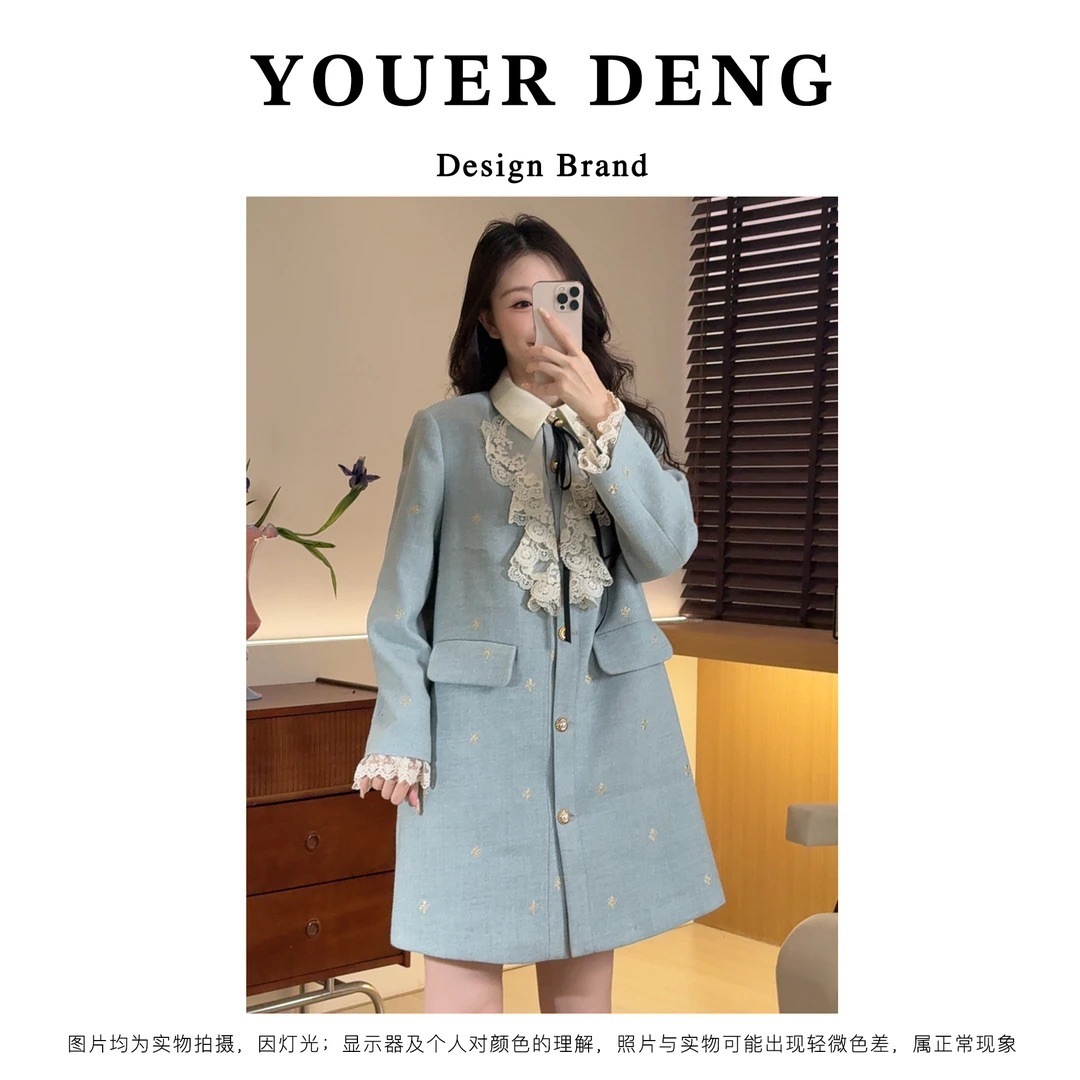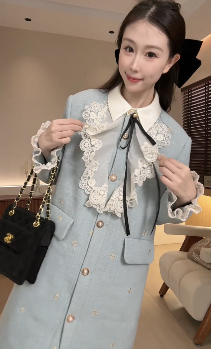 *o-ha-you*【FLKDD2025070】秋冬小眾精緻毛呢名媛溫柔毛呢蝴蝶結連衣裙外套白鴨絨厚實大衣中長蕾絲羽絨洋裝外套-2色