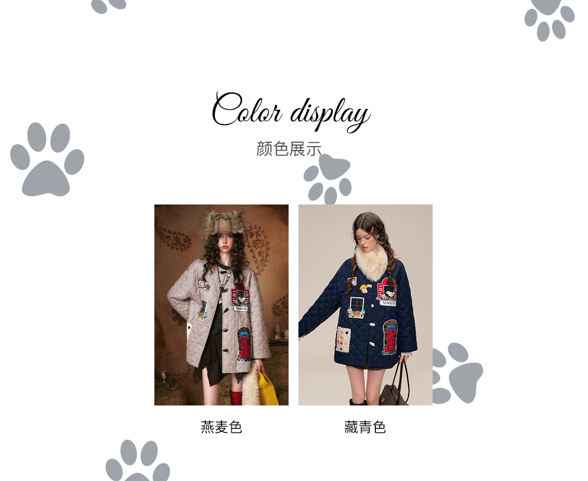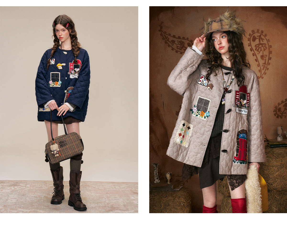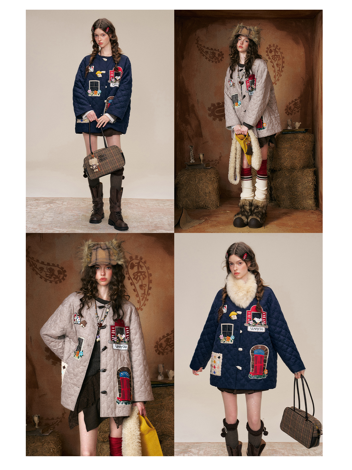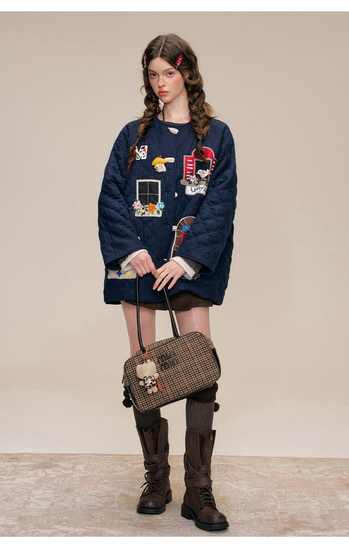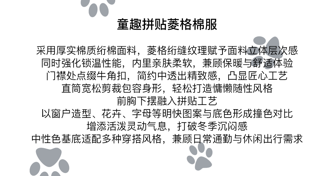 *o-ha-you*【FLKDD2025078】2025冬季新款韓版可愛卡通童趣貼布拼接菱格棉服外套女設計感-2色