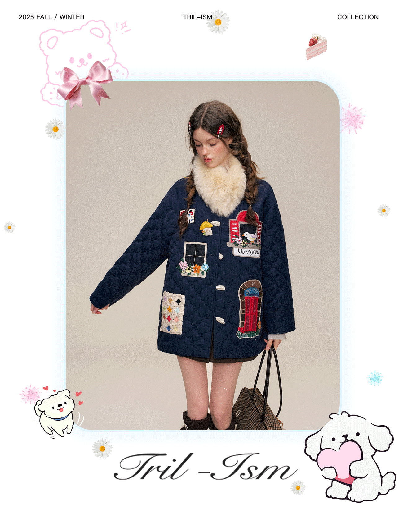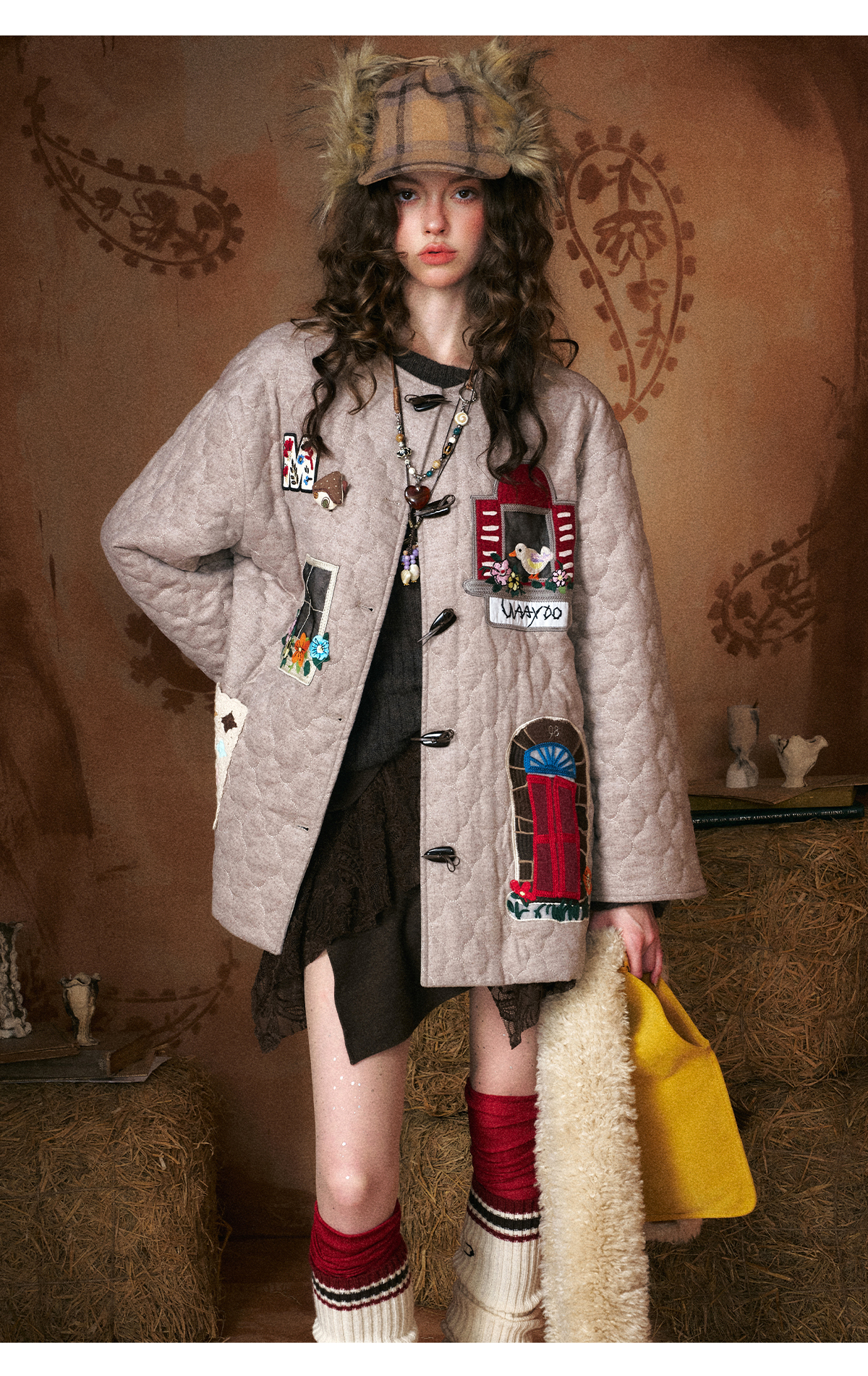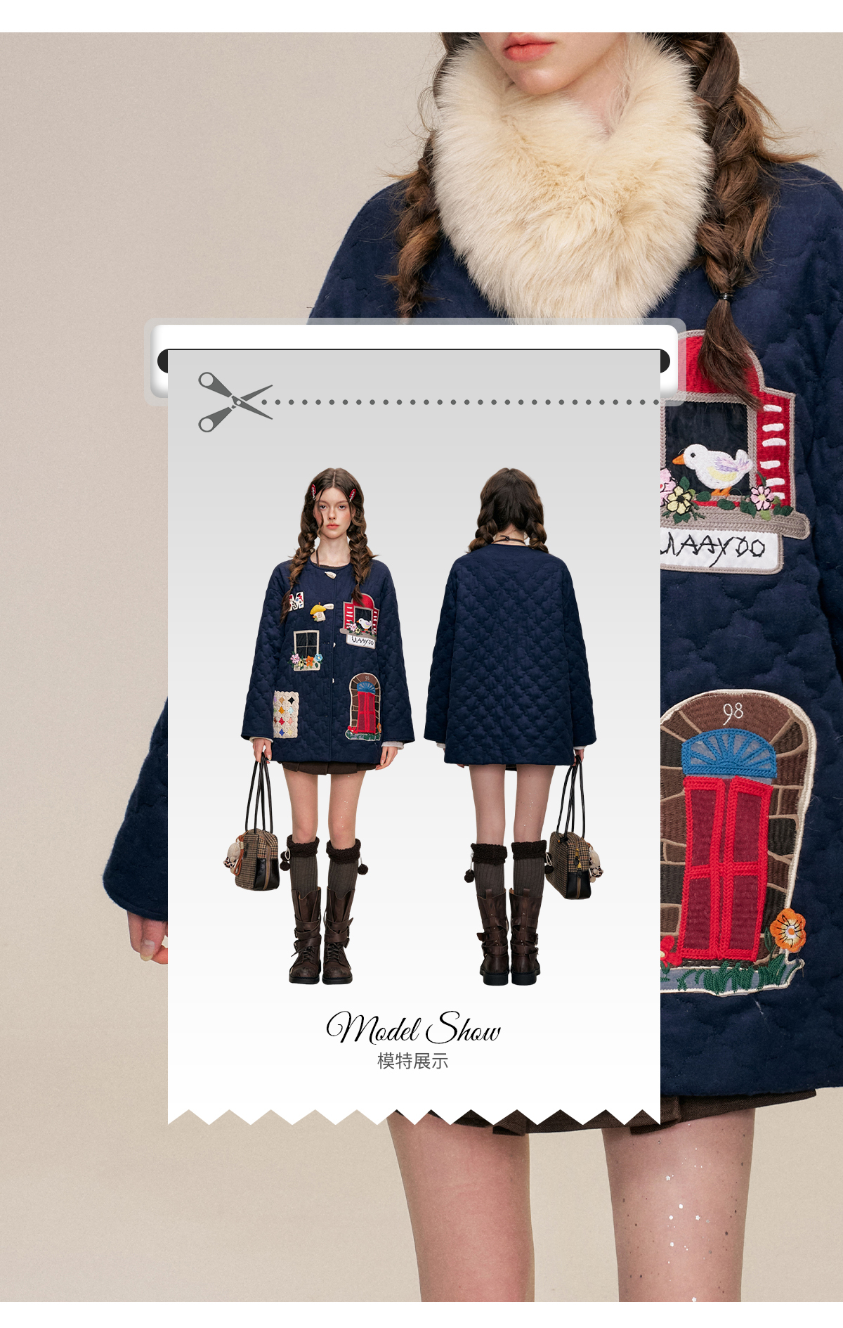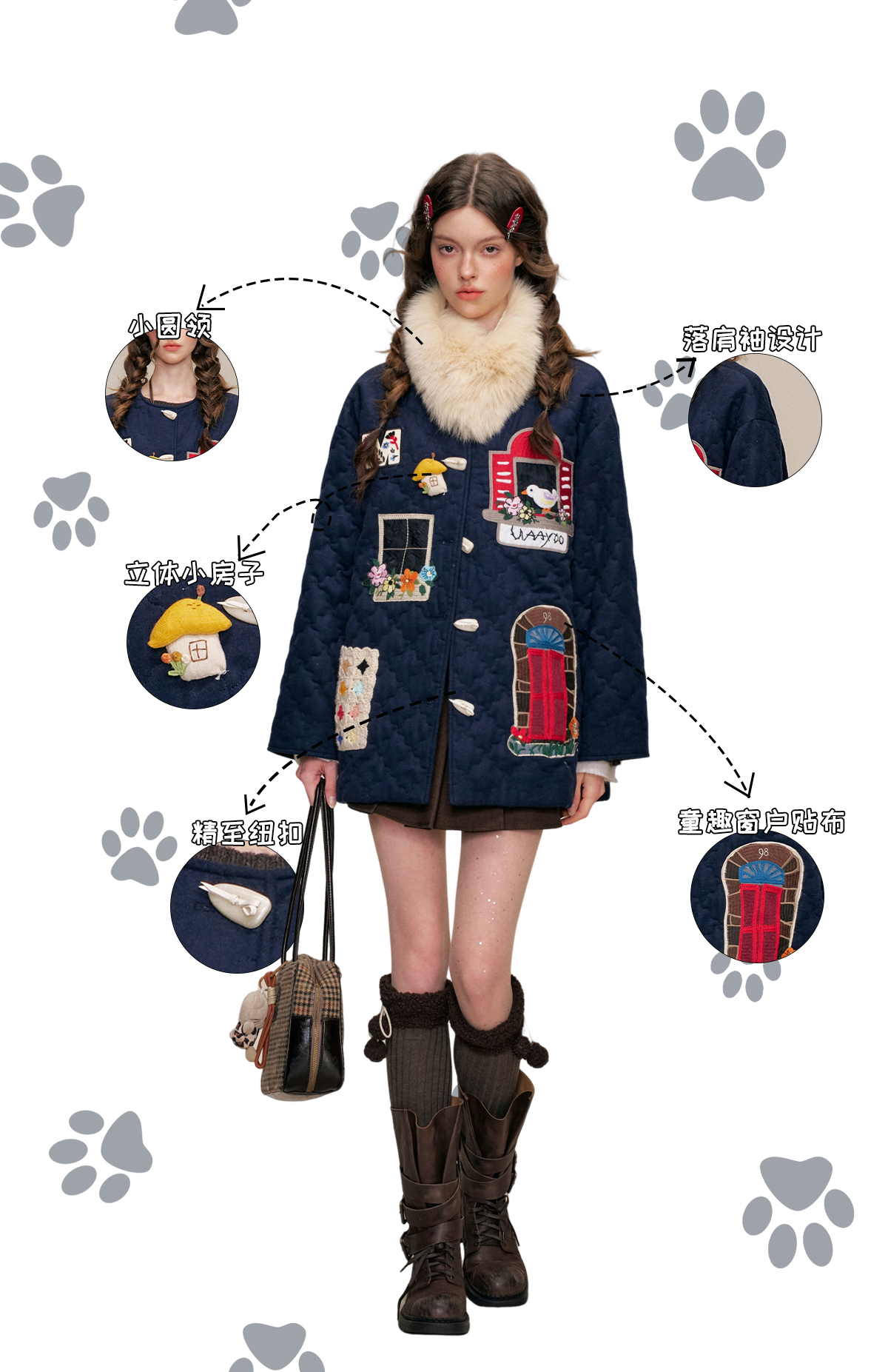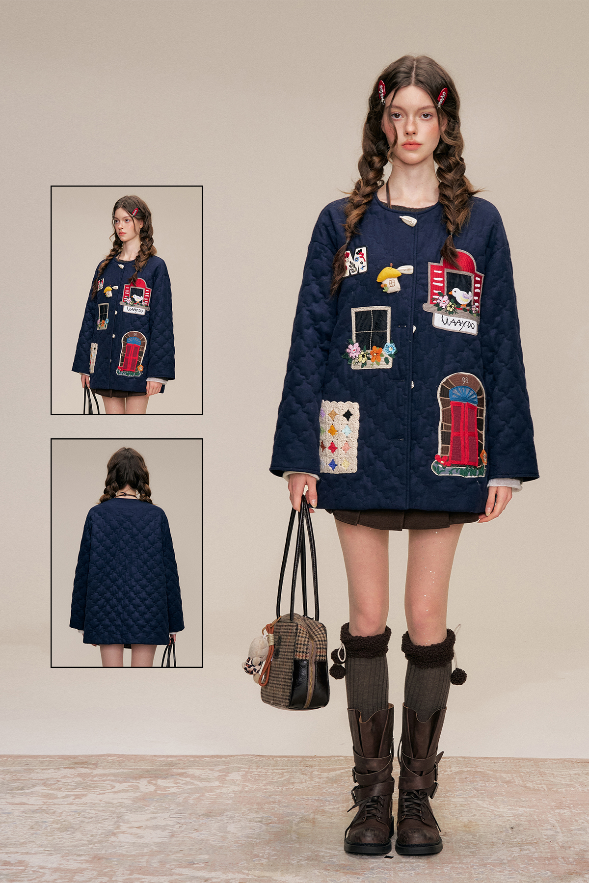 *o-ha-you*【FLKDD2025078】2025冬季新款韓版可愛卡通童趣貼布拼接菱格棉服外套女設計感-2色
