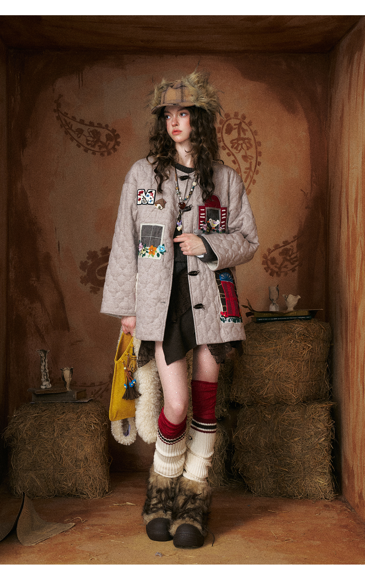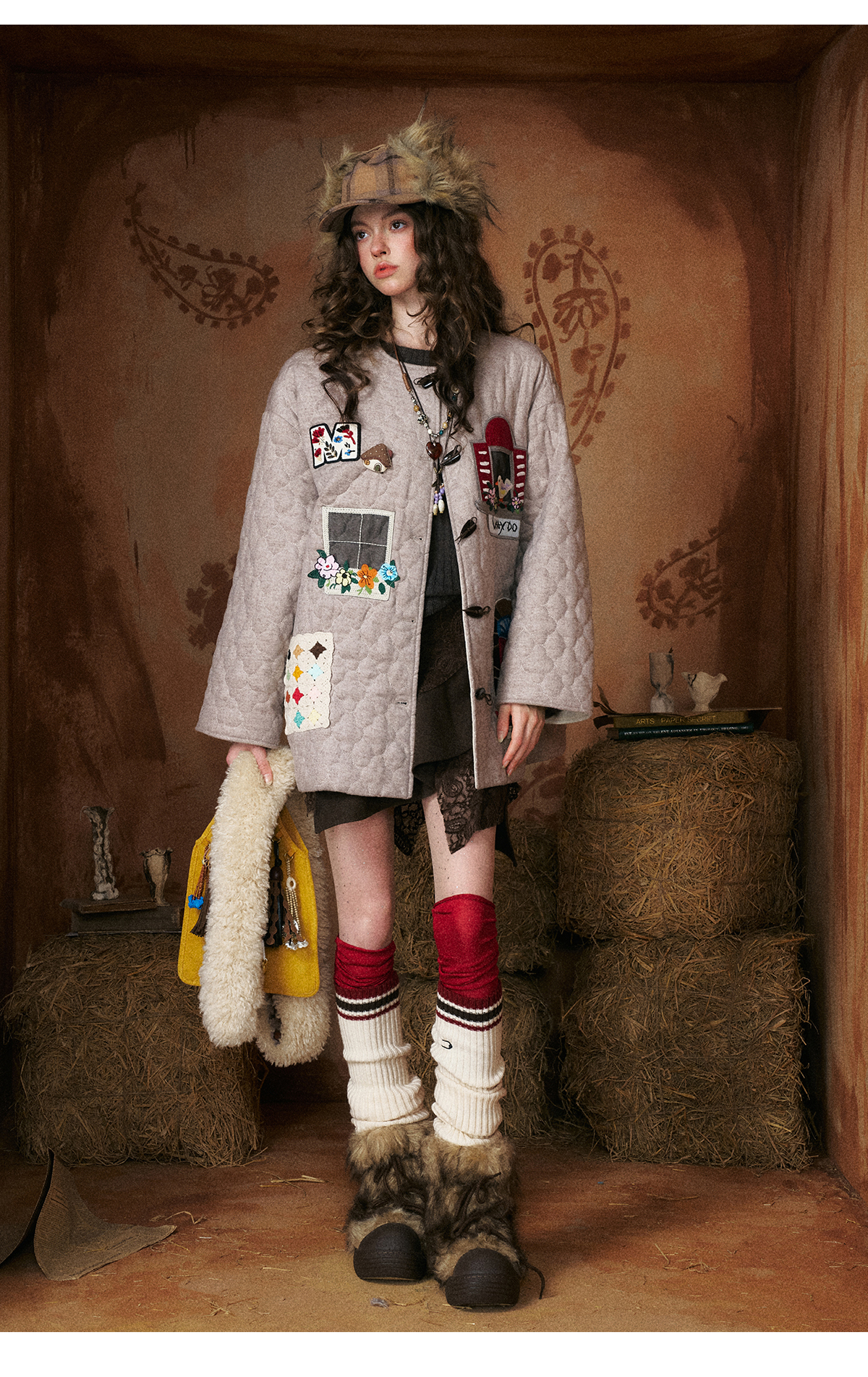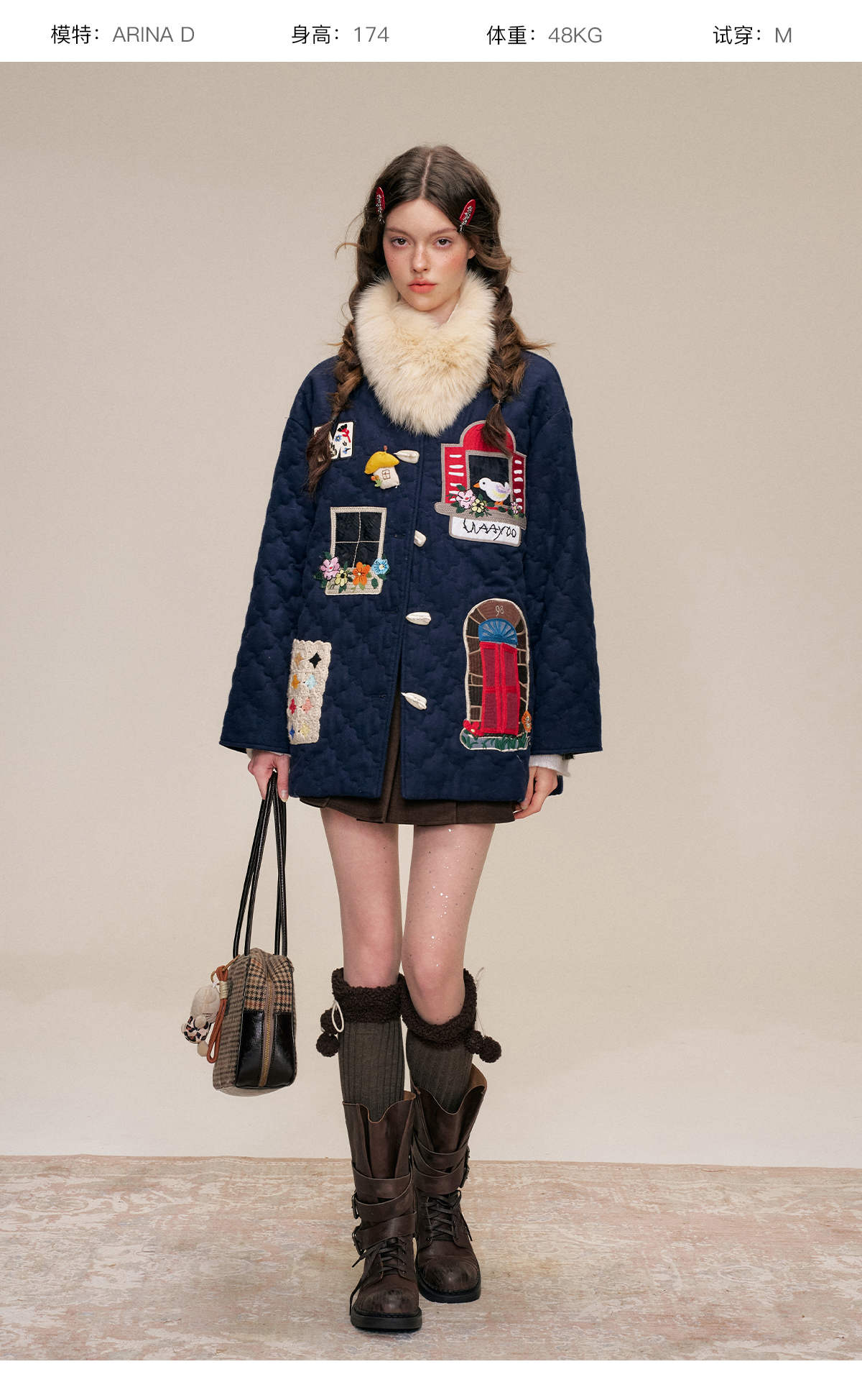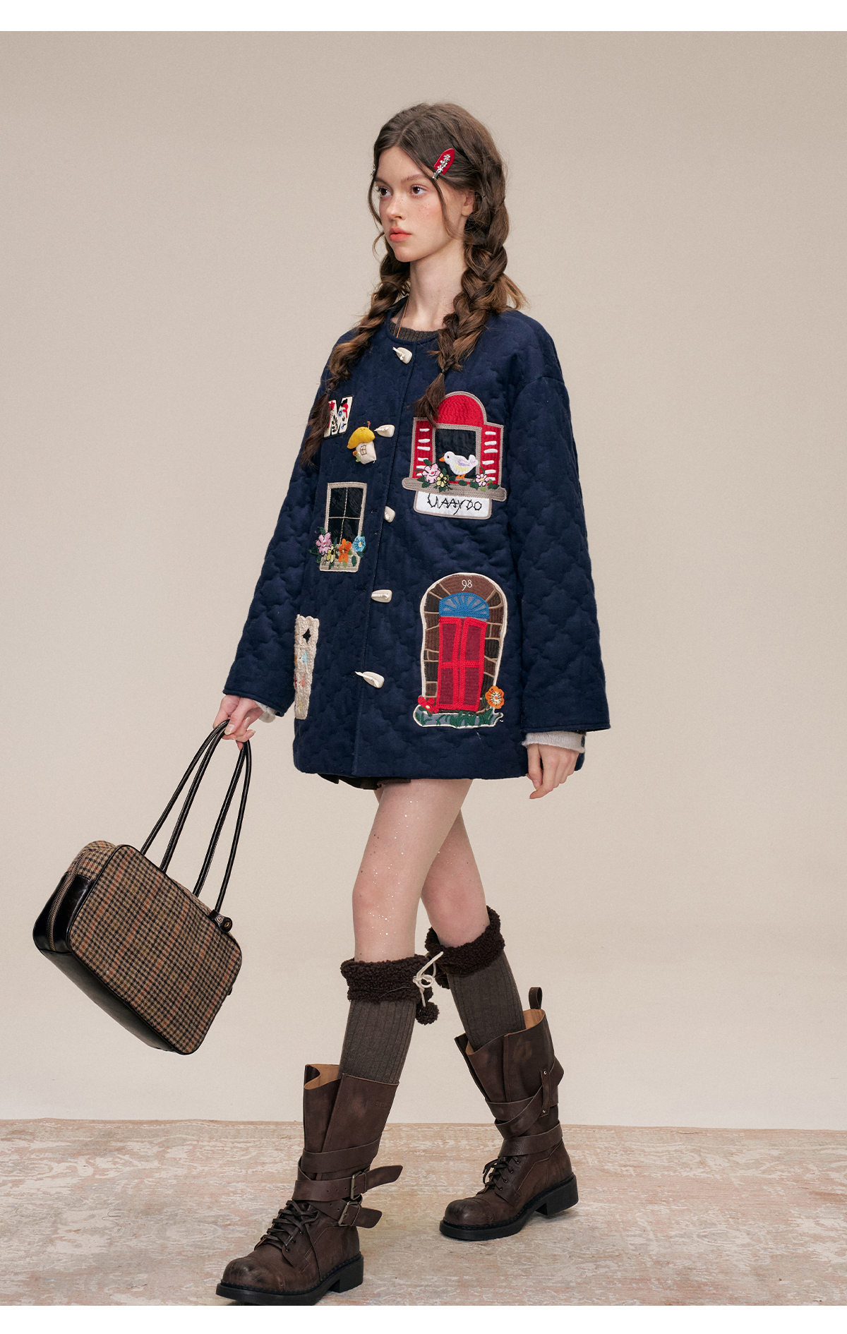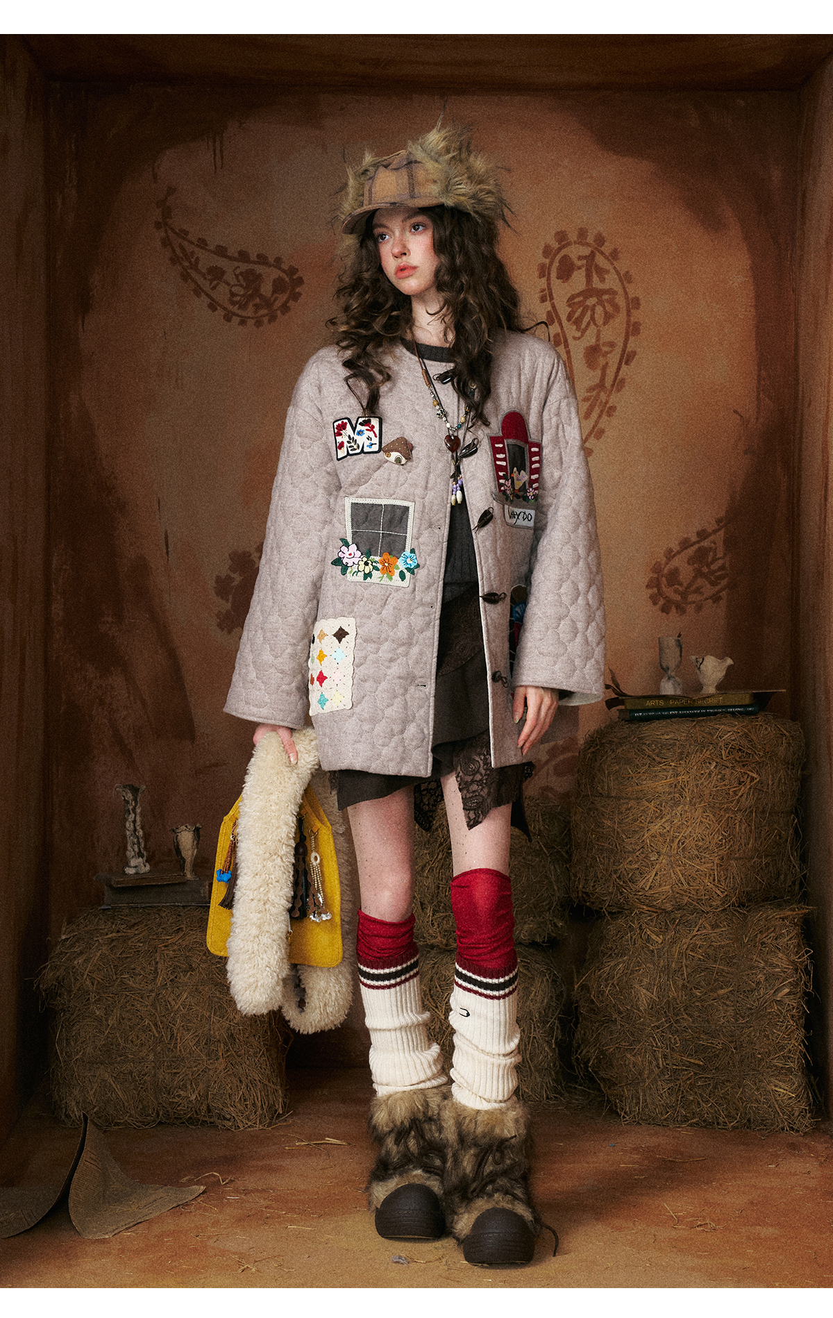 *o-ha-you*【FLKDD2025078】2025冬季新款韓版可愛卡通童趣貼布拼接菱格棉服外套女設計感-2色
