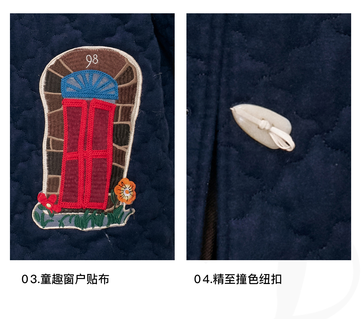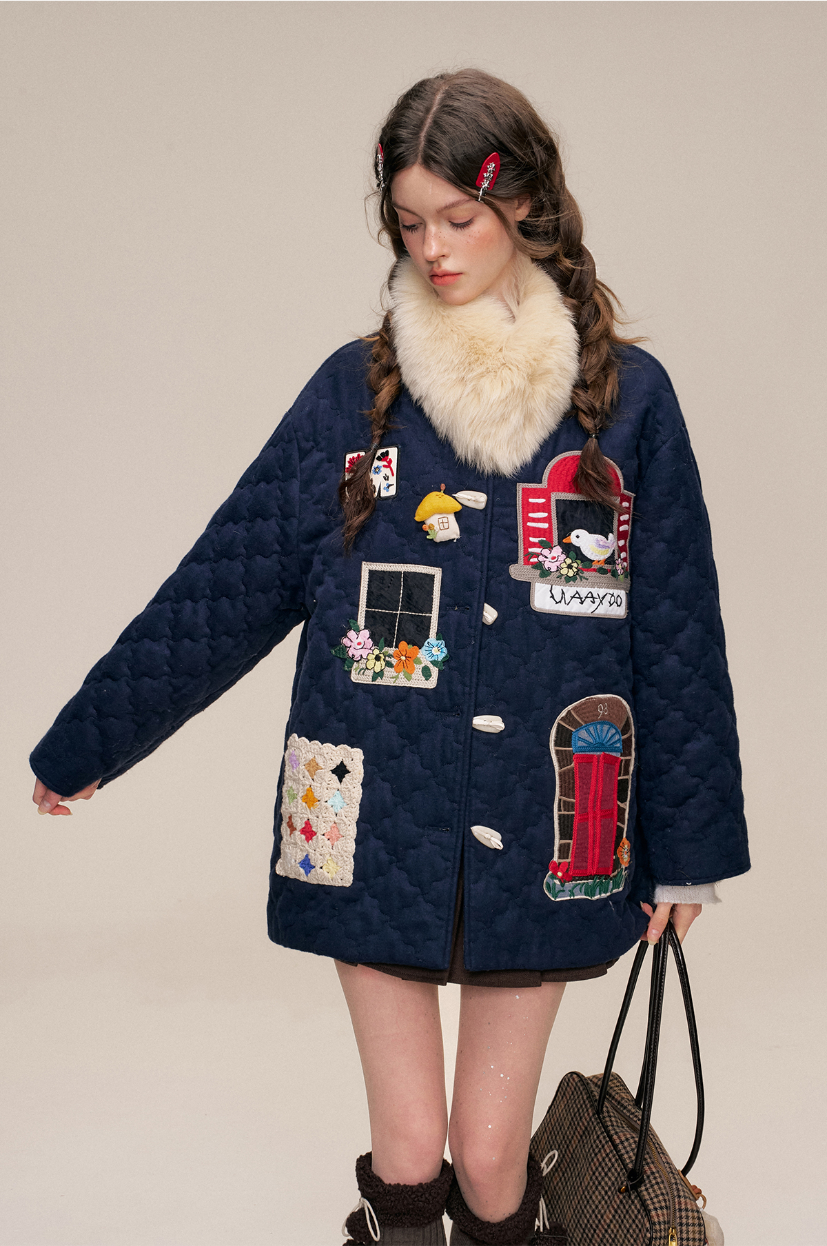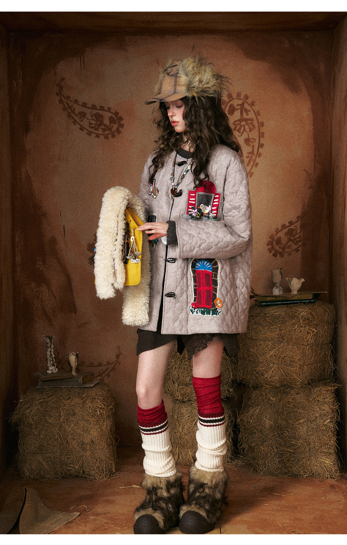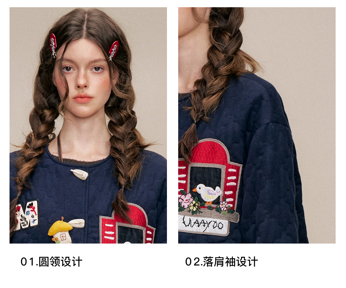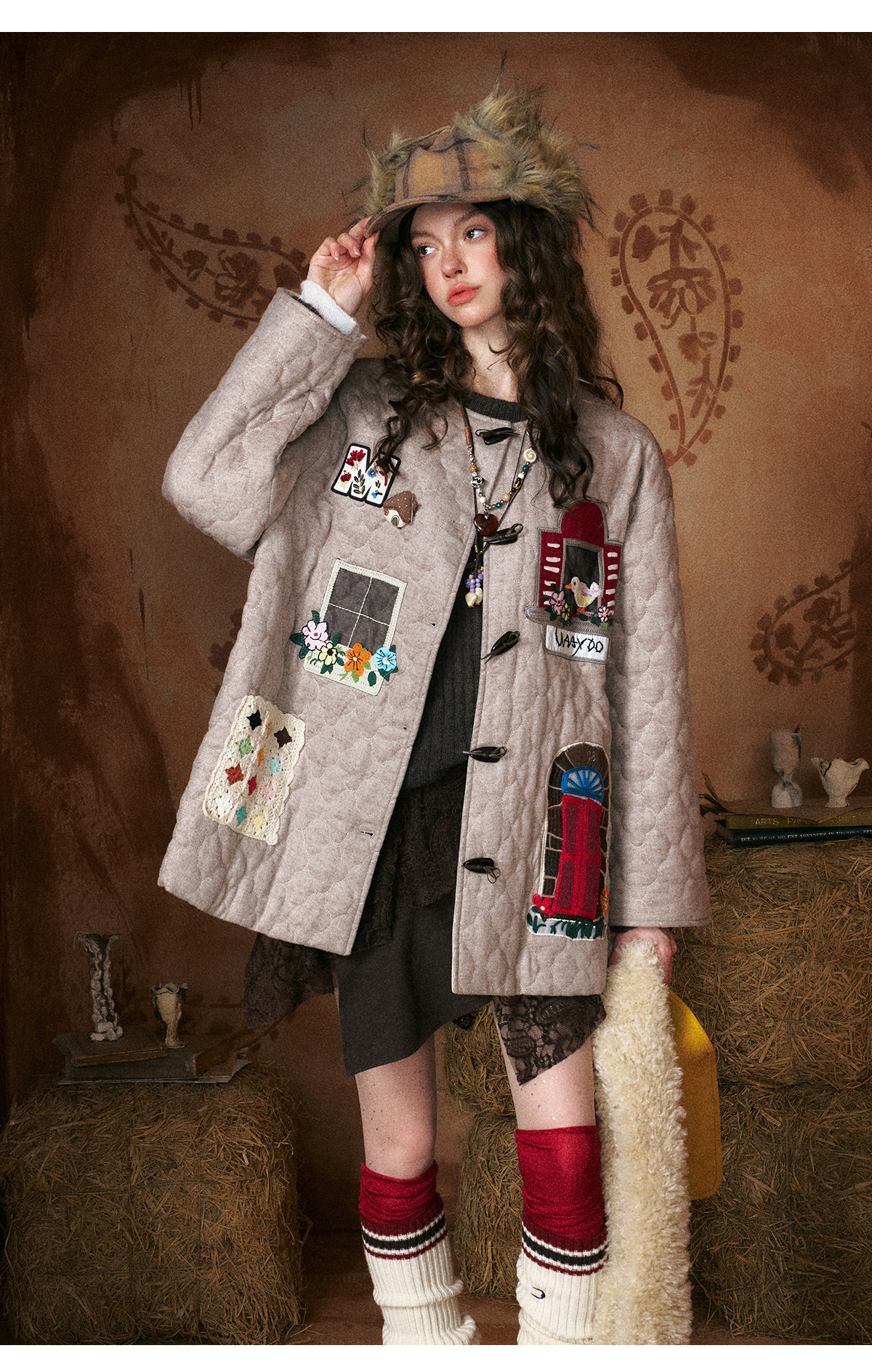 *o-ha-you*【FLKDD2025078】2025冬季新款韓版可愛卡通童趣貼布拼接菱格棉服外套女設計感-2色