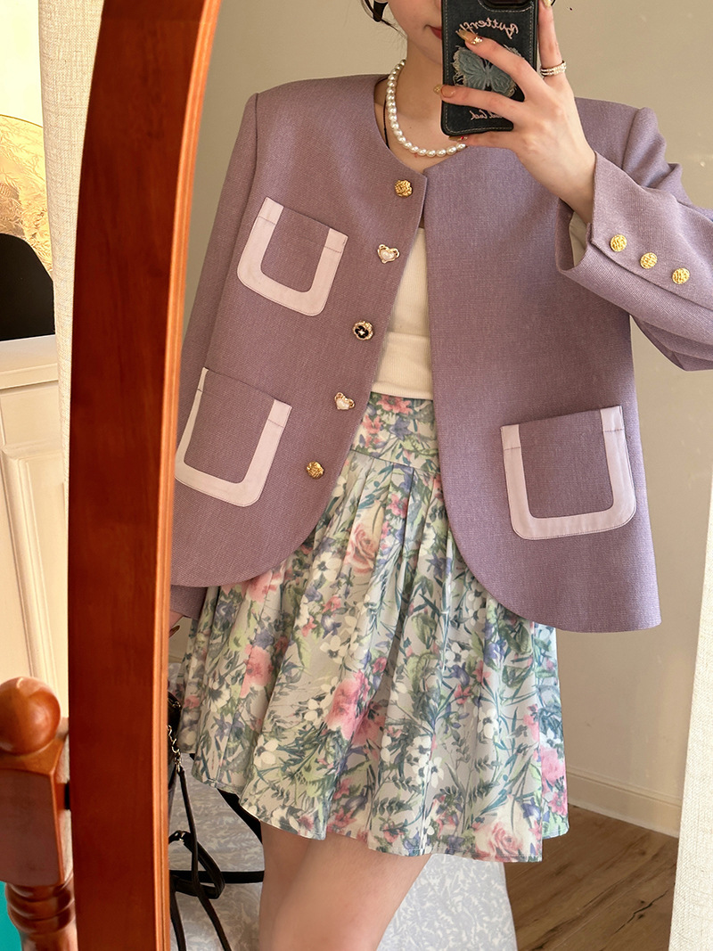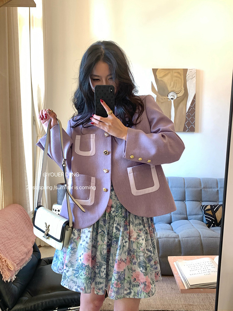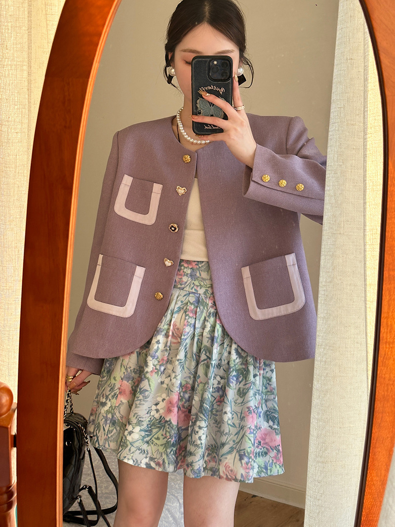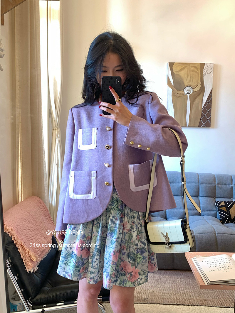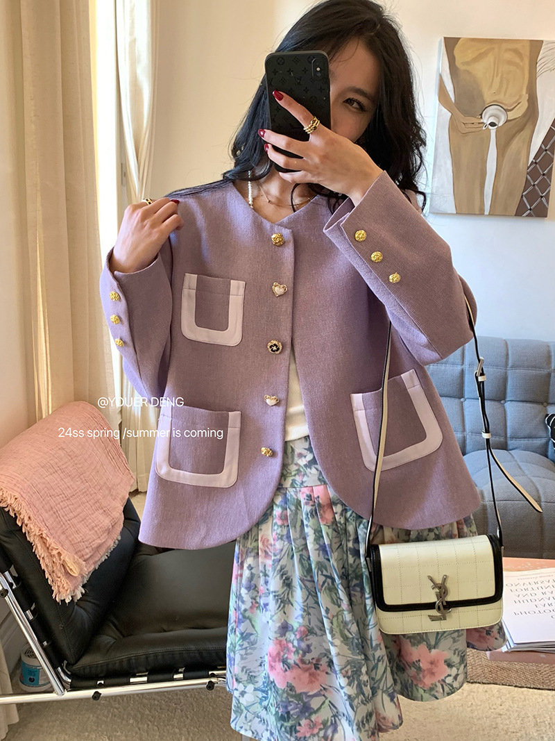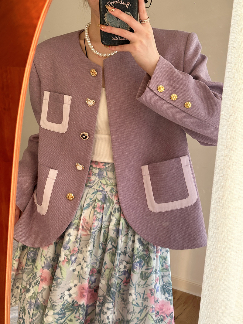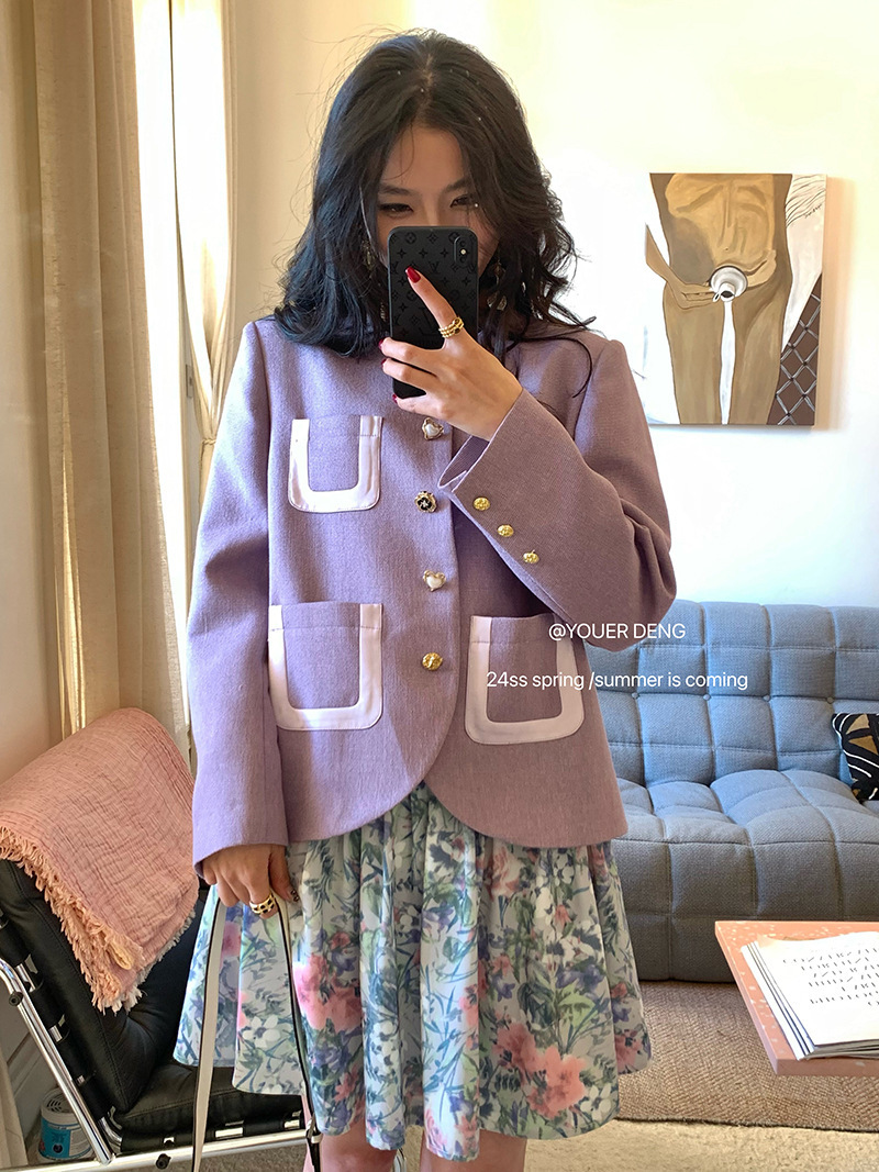 *o-ha-you*【FLKDYA006】復古法式小香風多口袋紫色外套優雅氣質異形紐扣通勤上衣