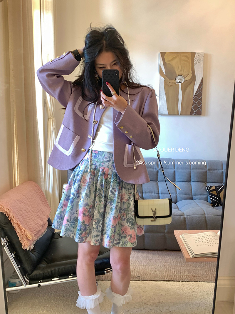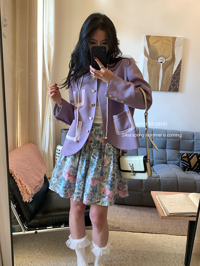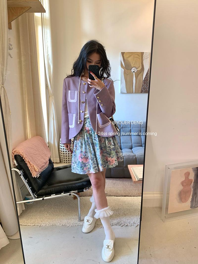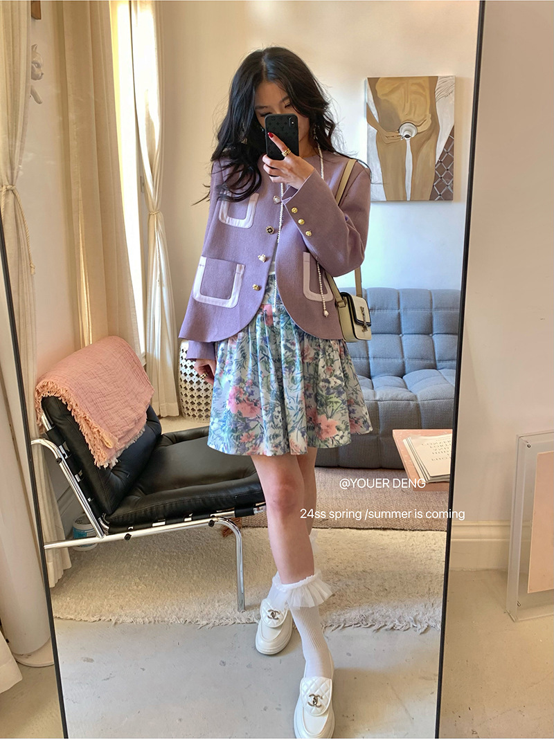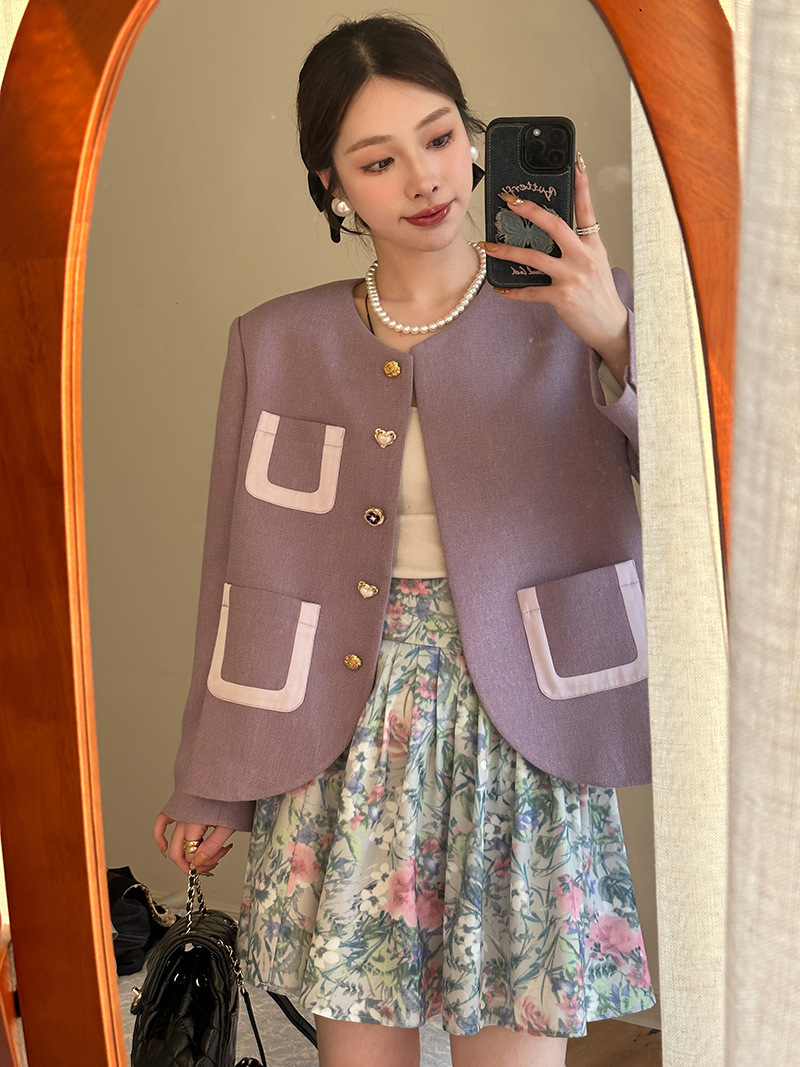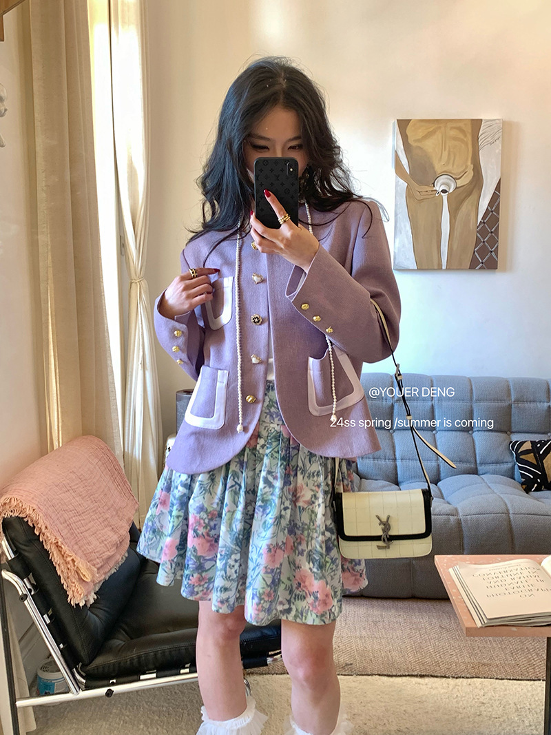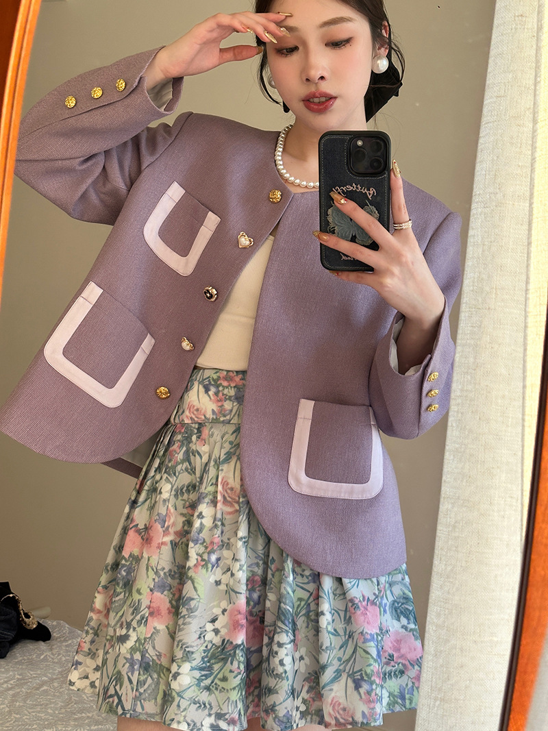 *o-ha-you*【FLKDYA006】復古法式小香風多口袋紫色外套優雅氣質異形紐扣通勤上衣