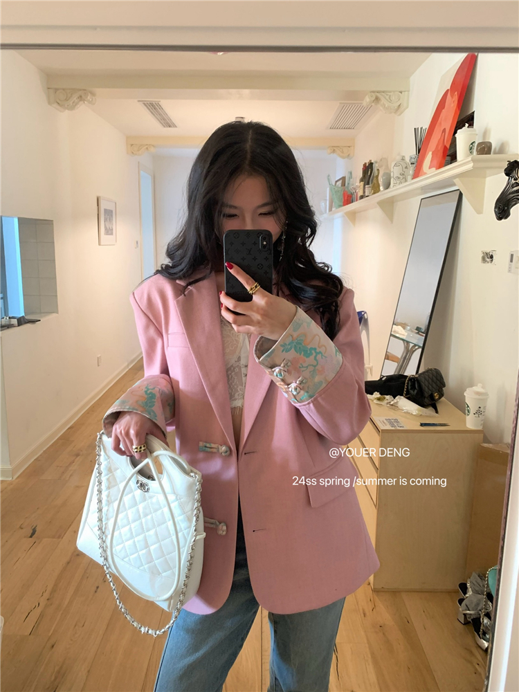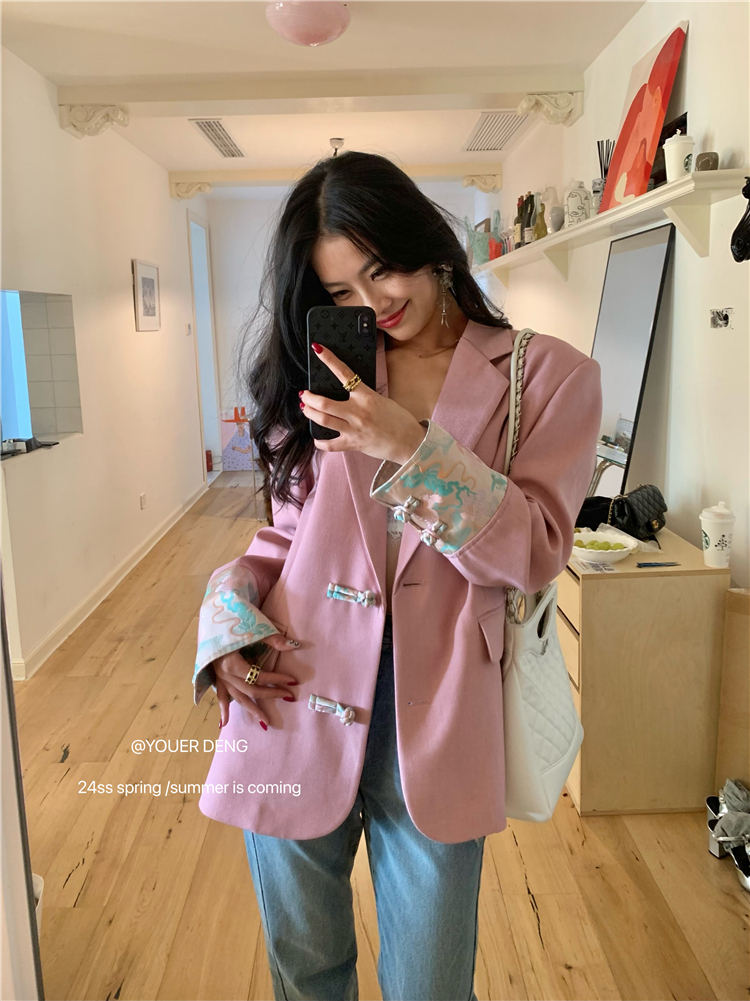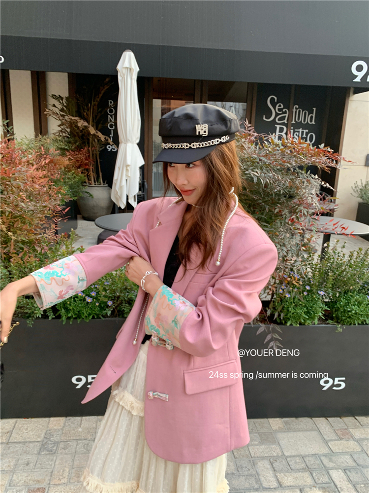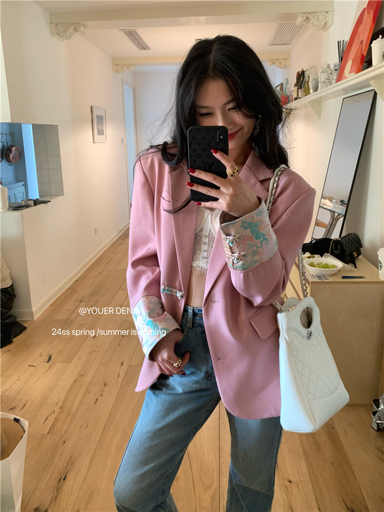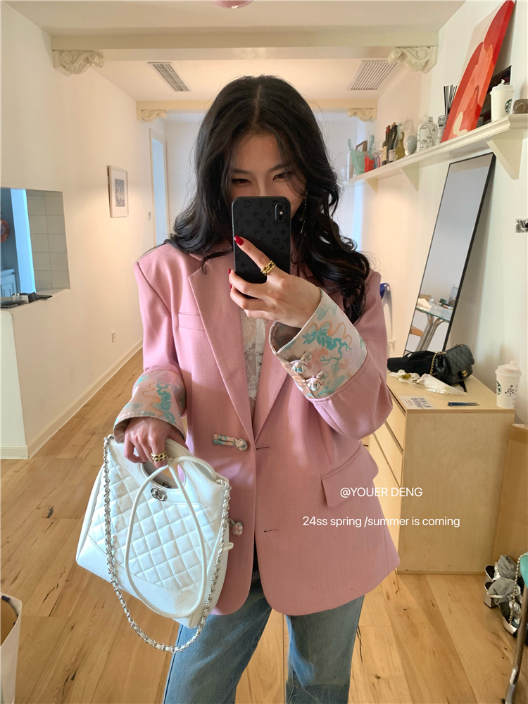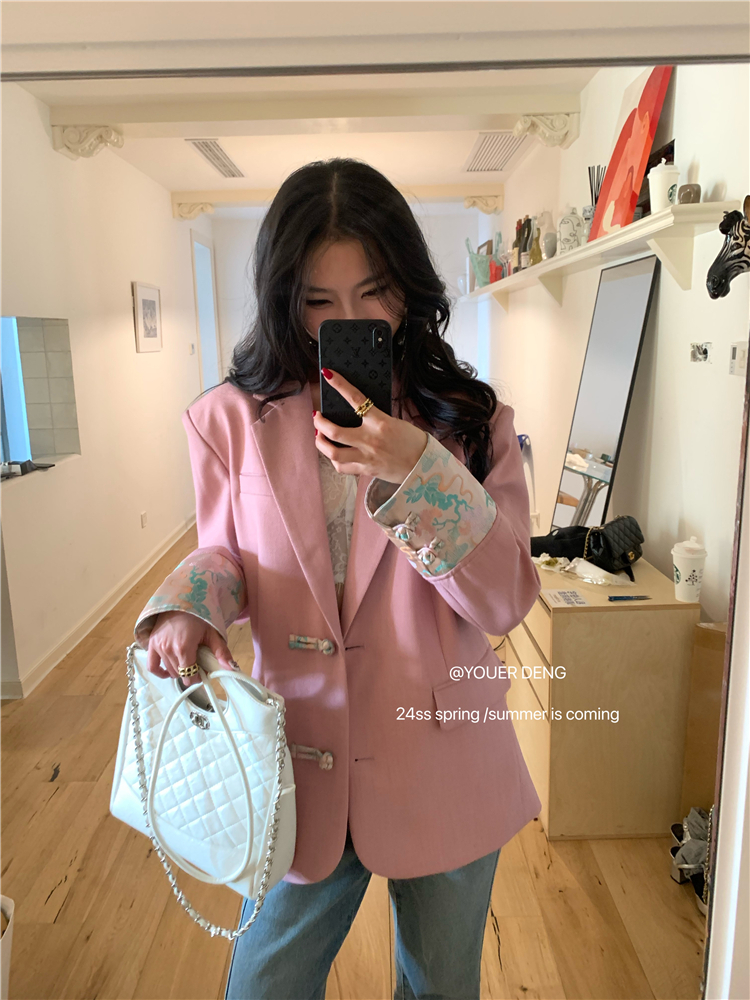 *o-ha-you*【FLKDYA1012】復古中國風拼接繡花盤扣粉紅西裝外套新中式西服上衣春秋