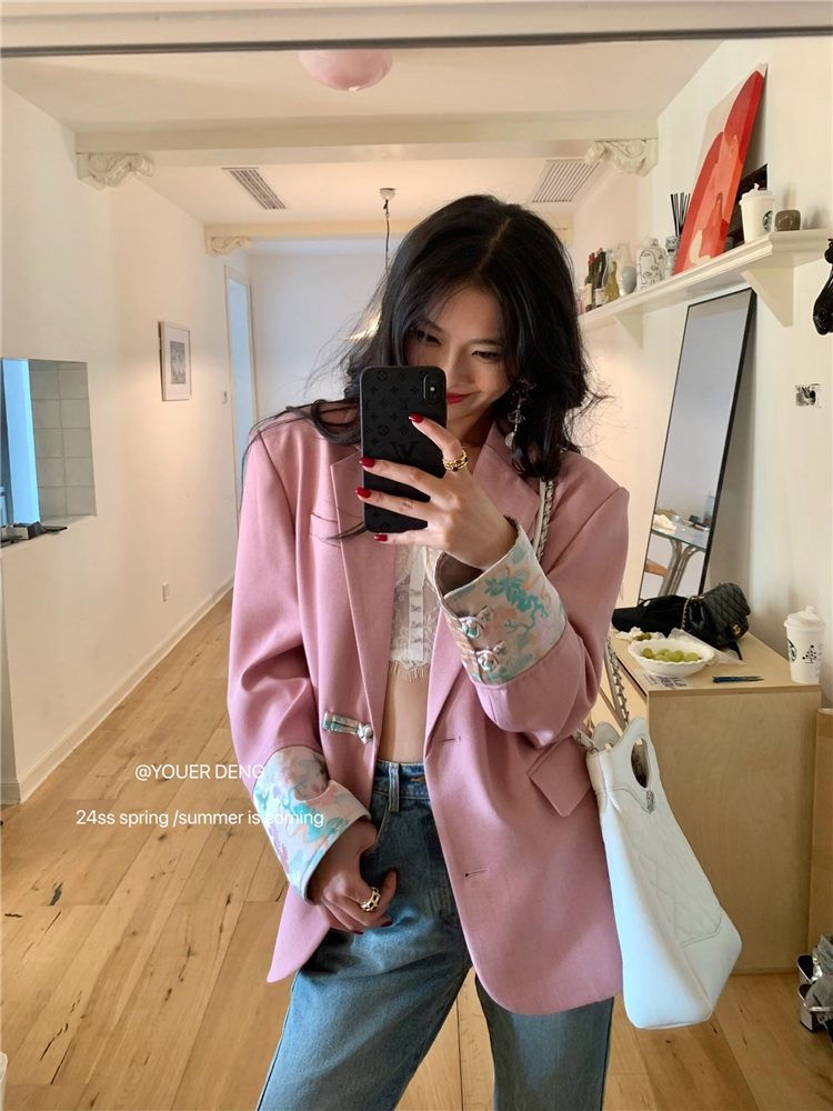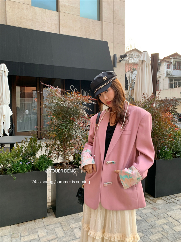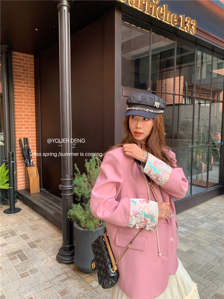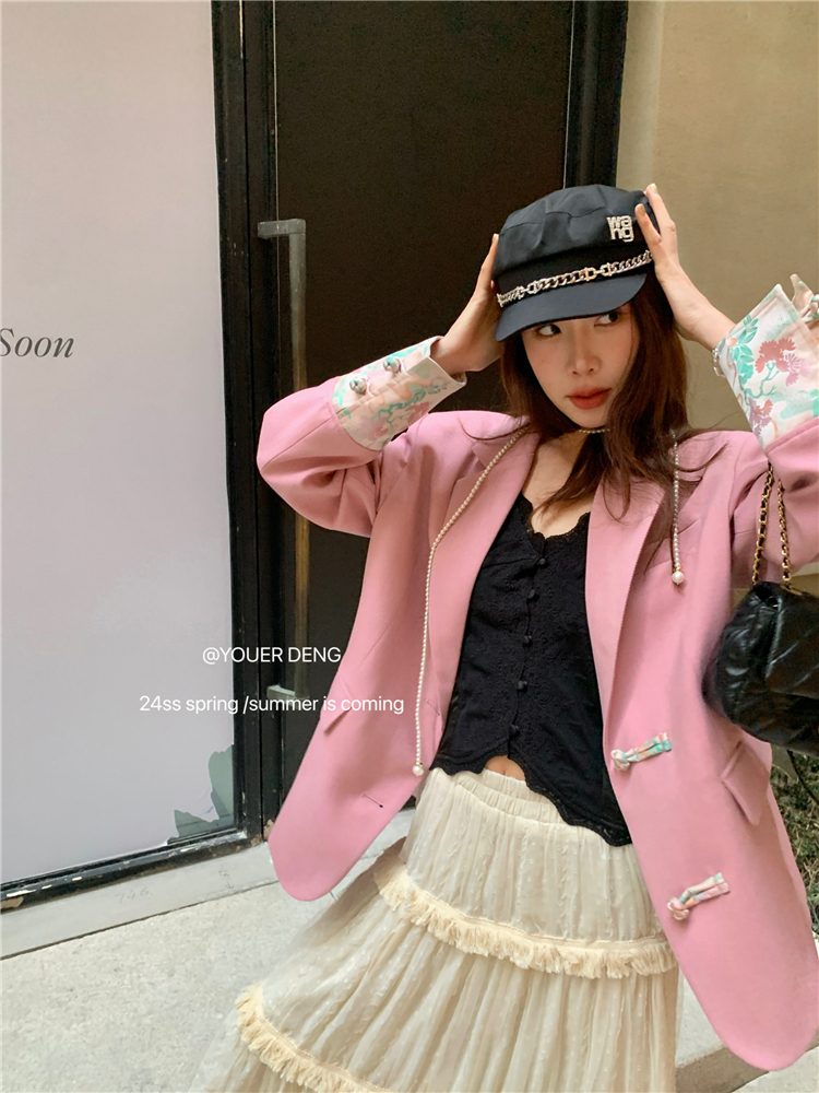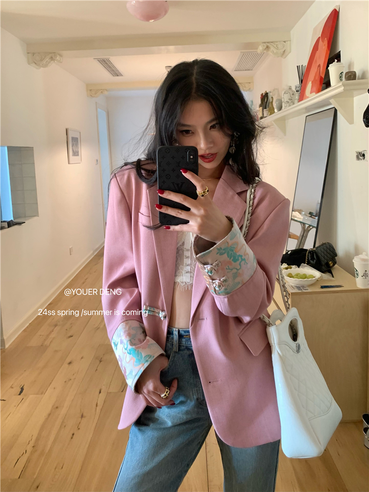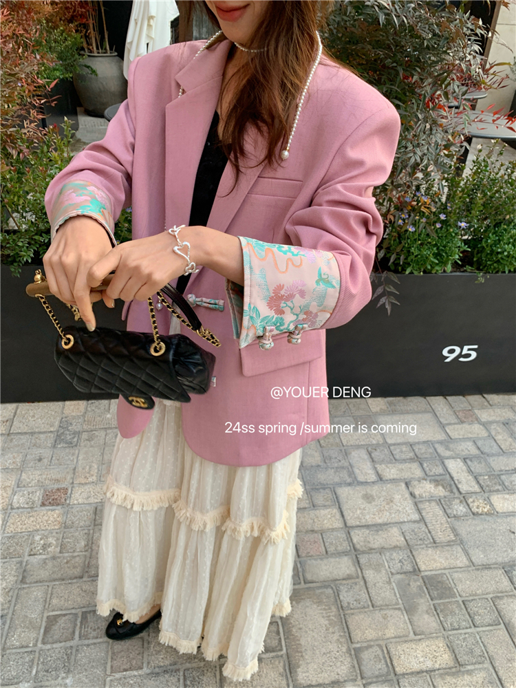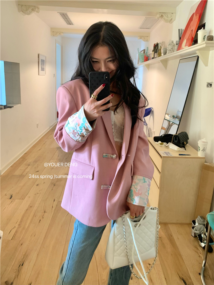 *o-ha-you*【FLKDYA1012】復古中國風拼接繡花盤扣粉紅西裝外套新中式西服上衣春秋