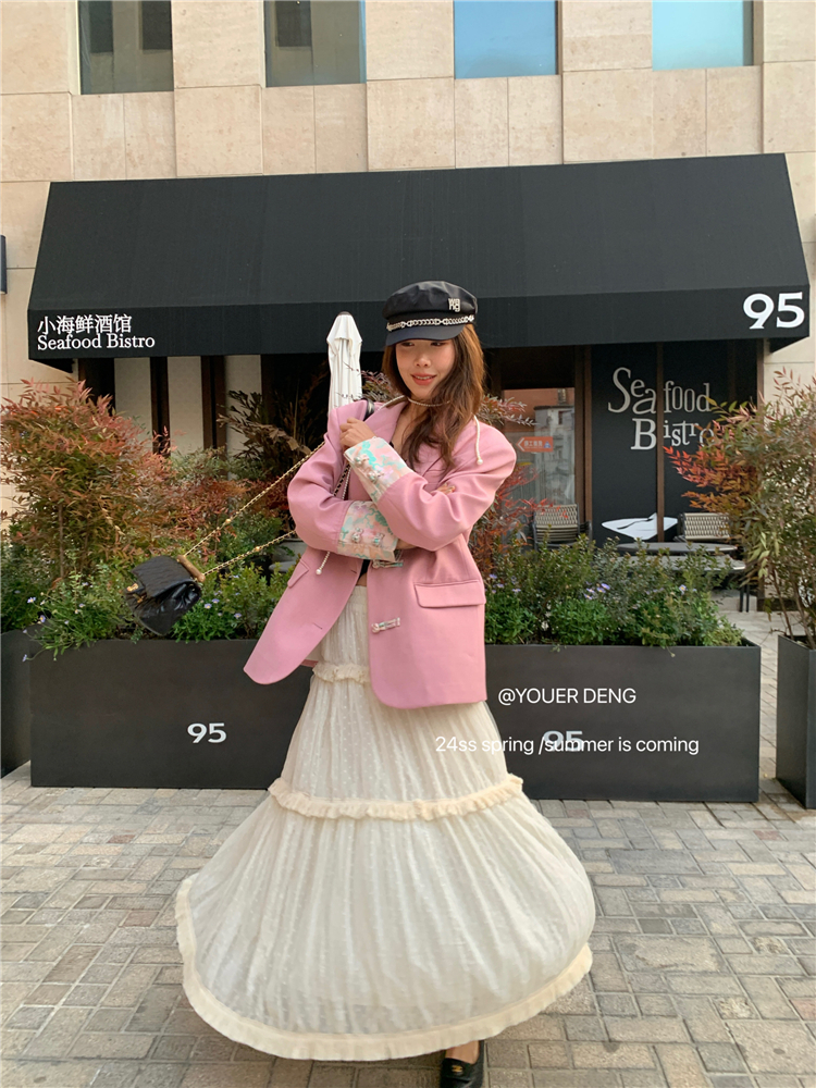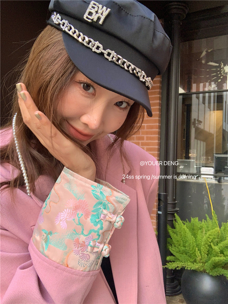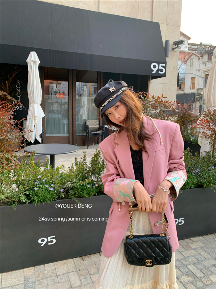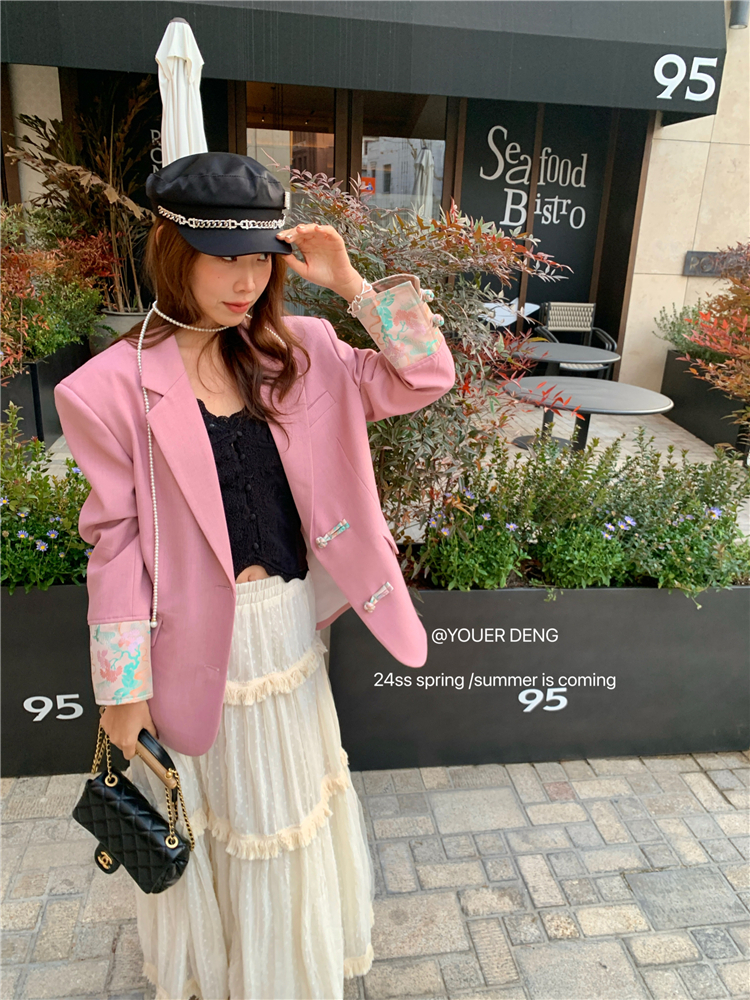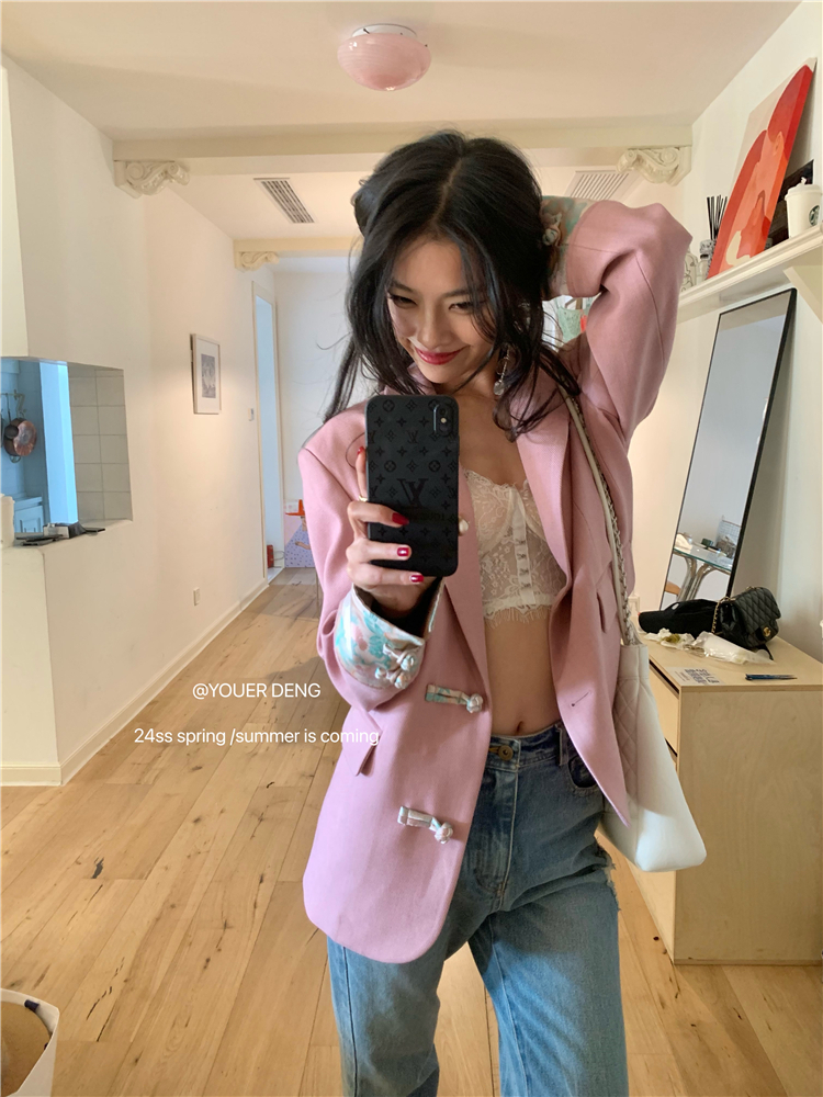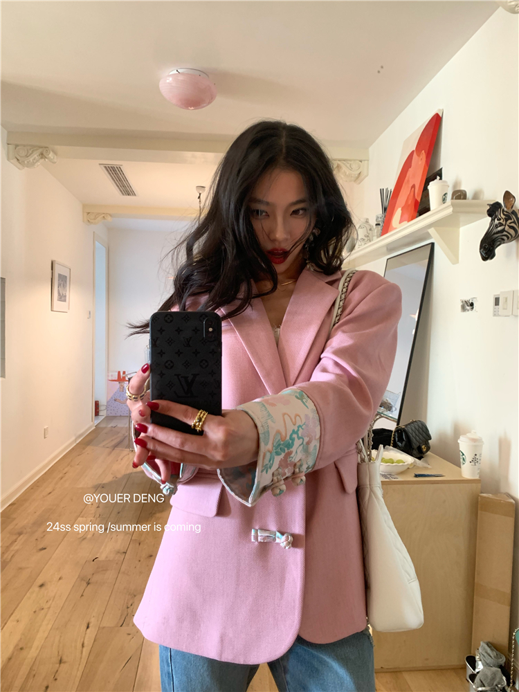 *o-ha-you*【FLKDYA1012】復古中國風拼接繡花盤扣粉紅西裝外套新中式西服上衣春秋