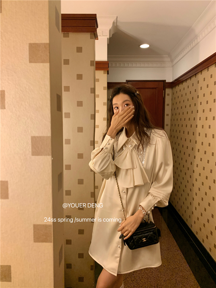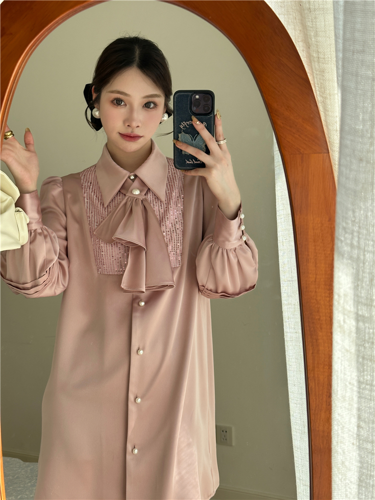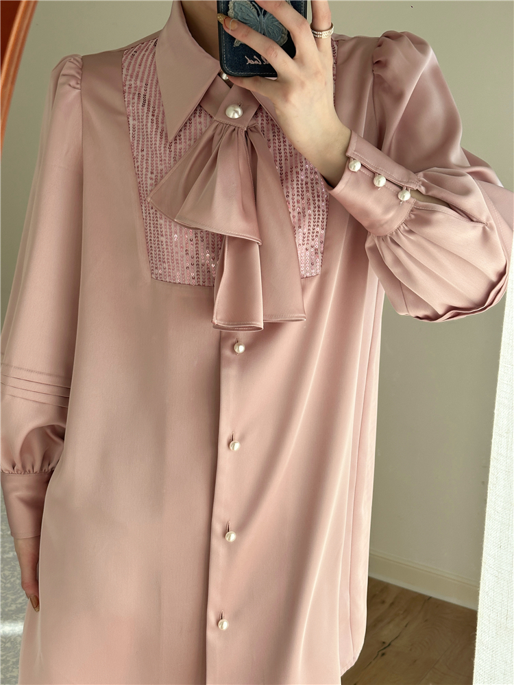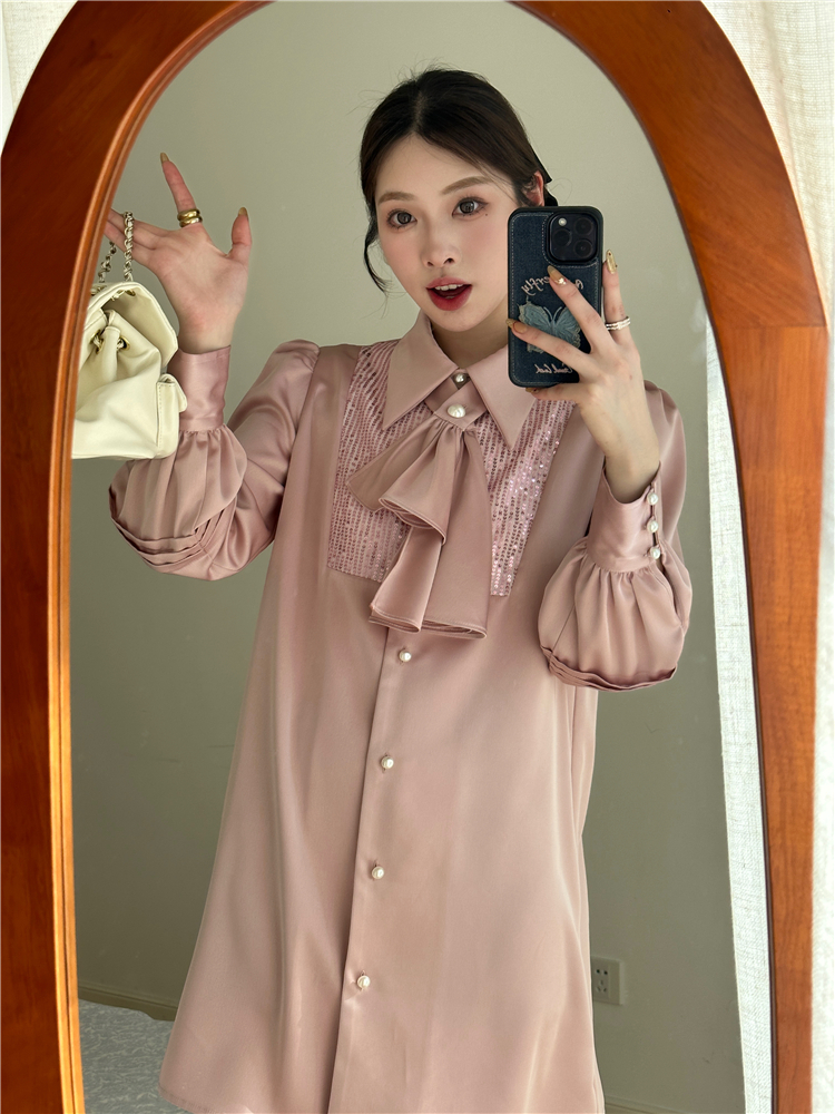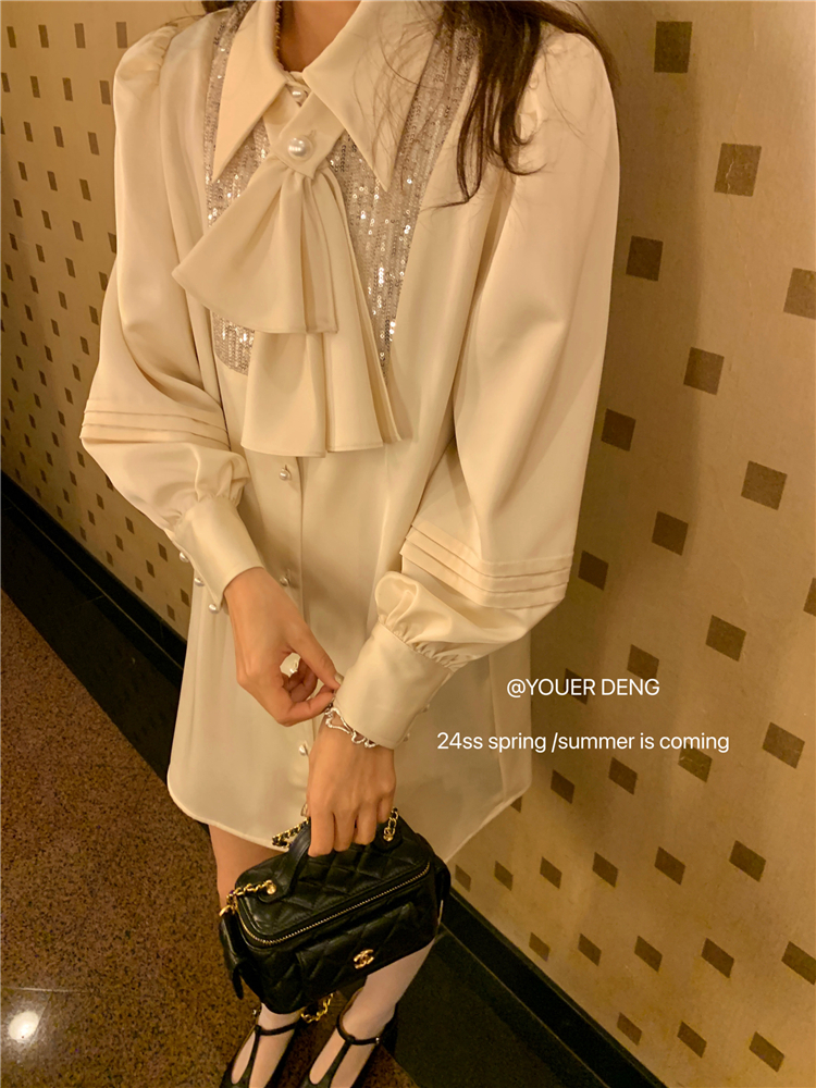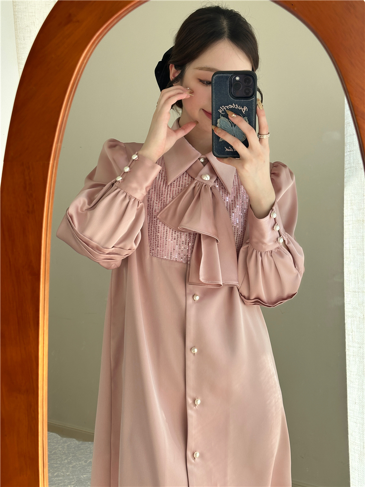 *o-ha-you*【FLKDYA1016】復古法式亮片中長版襯衫裙絲巾領泡泡袖絲滑連衣裙洋裝春秋-2色