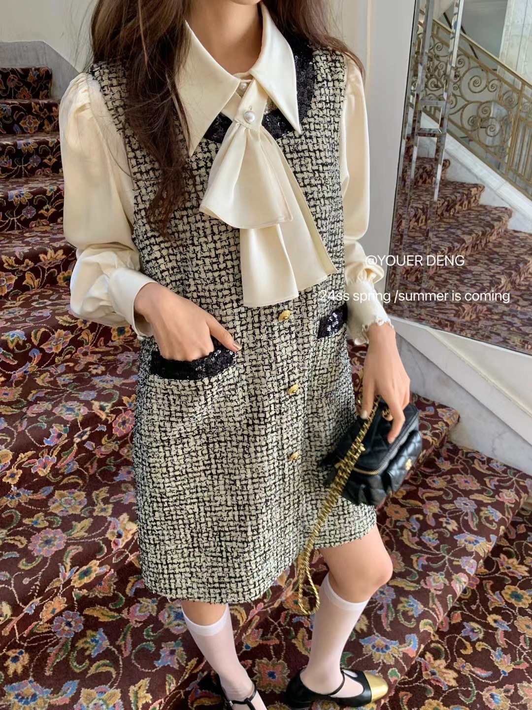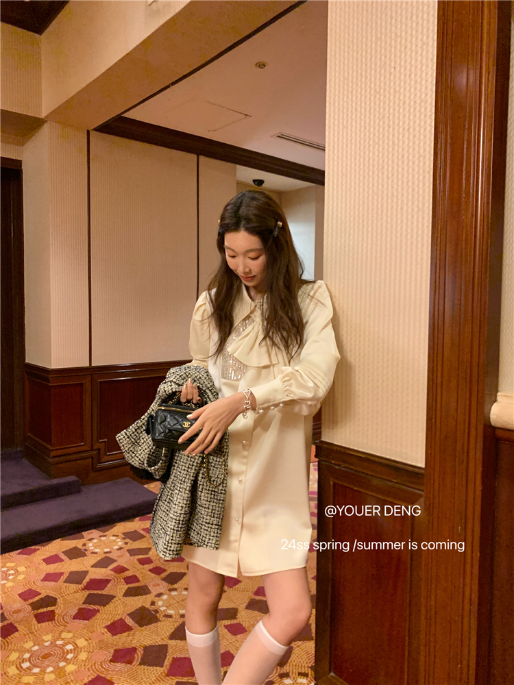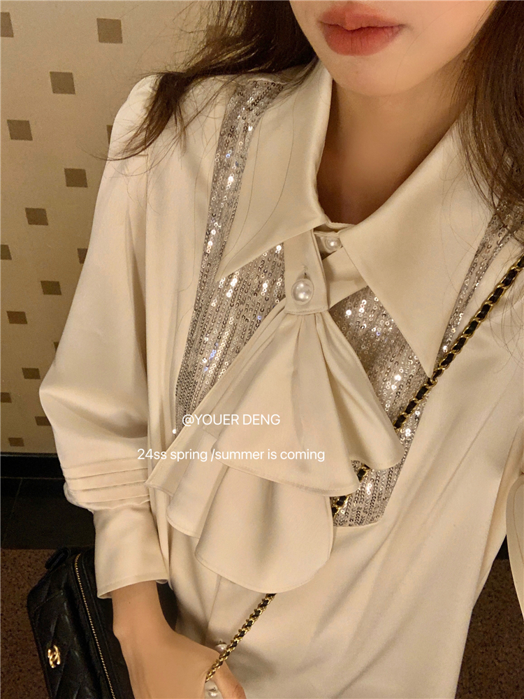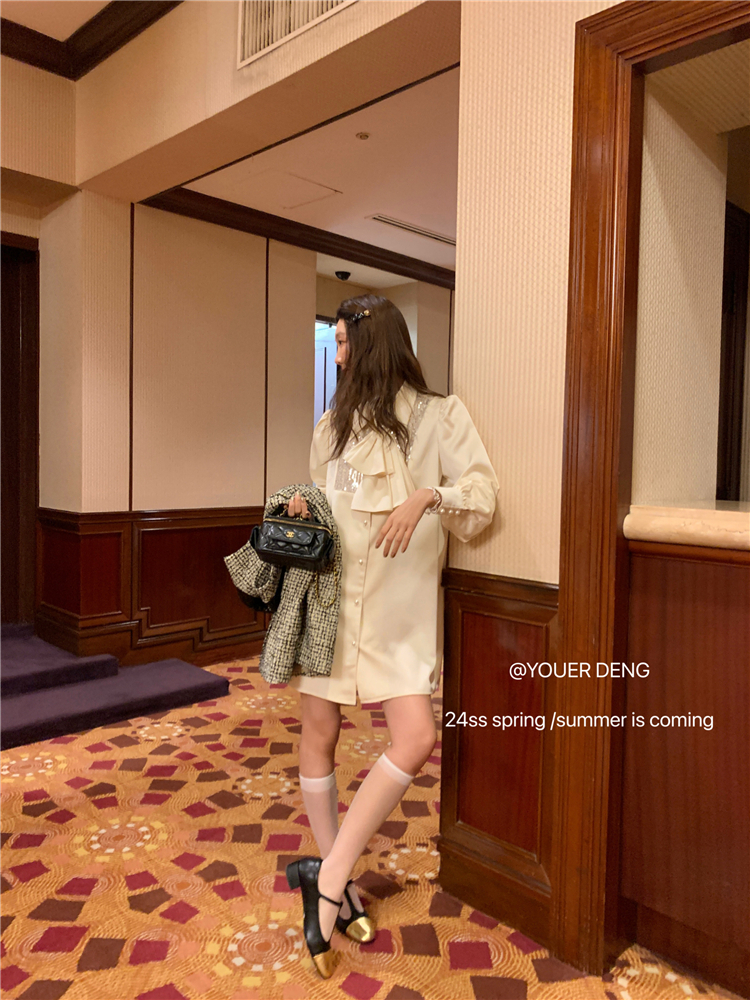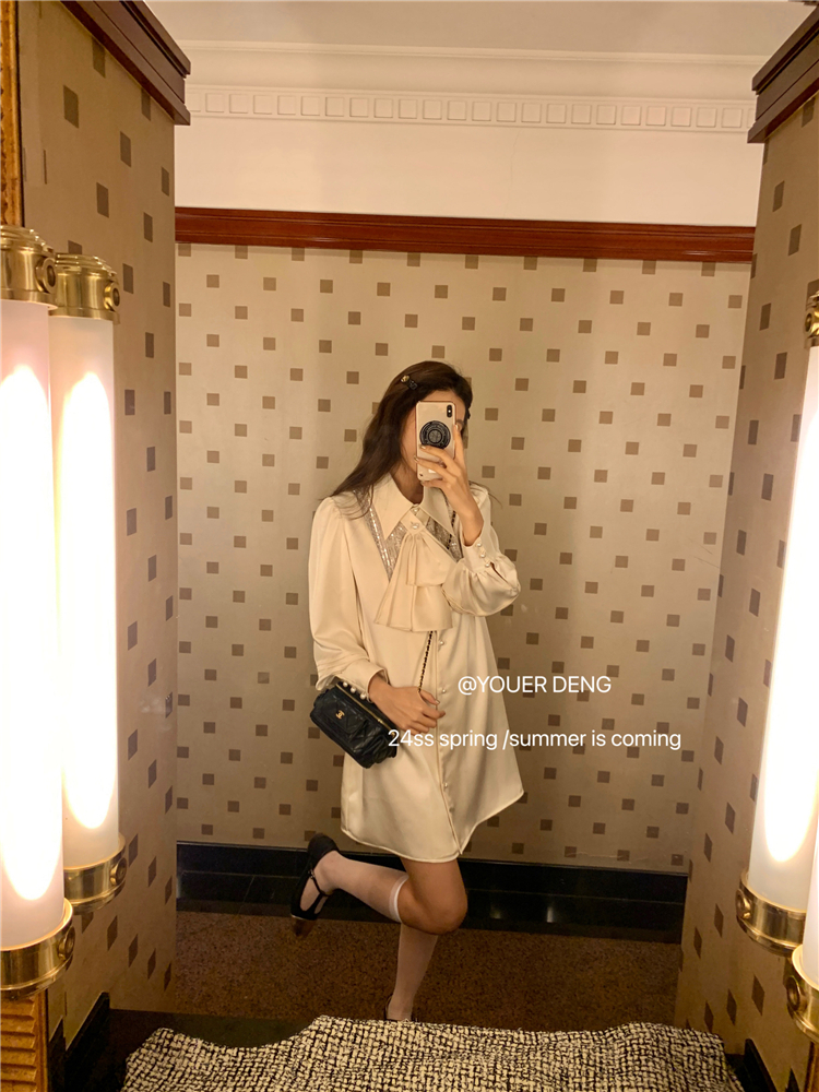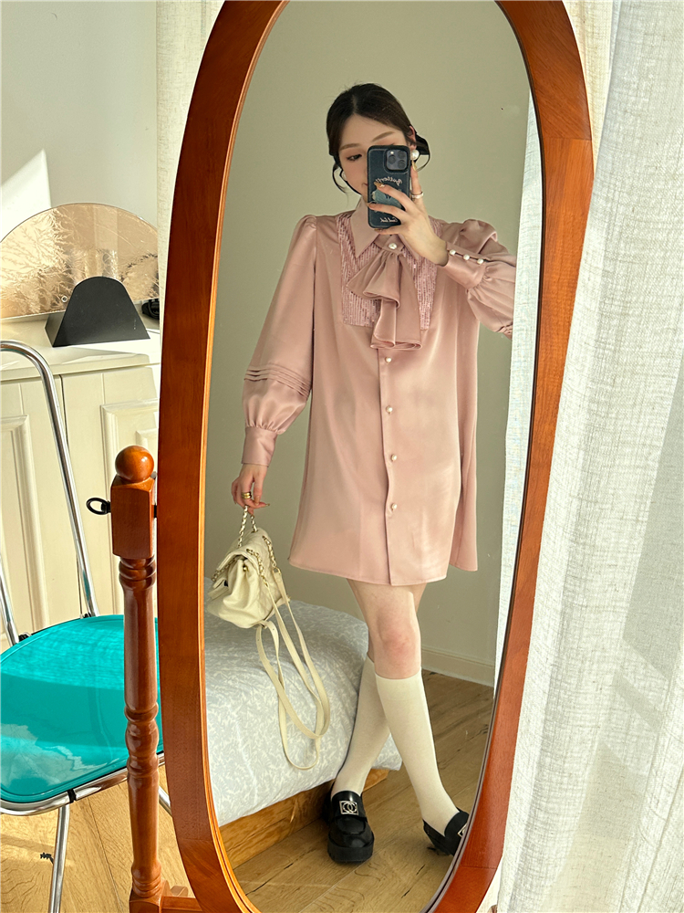 *o-ha-you*【FLKDYA1016】復古法式亮片中長版襯衫裙絲巾領泡泡袖絲滑連衣裙洋裝春秋-2色
