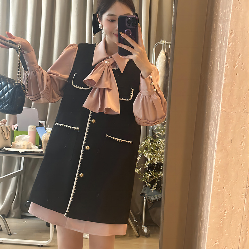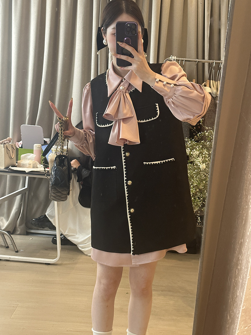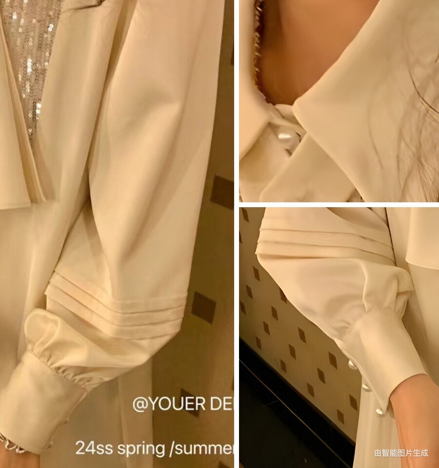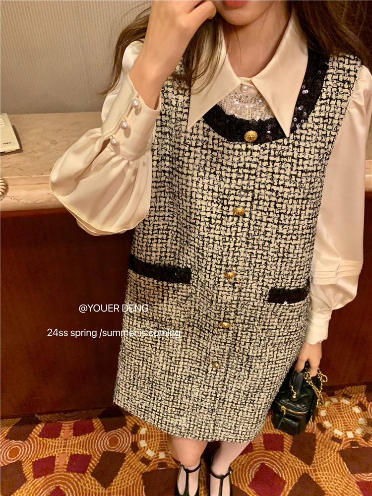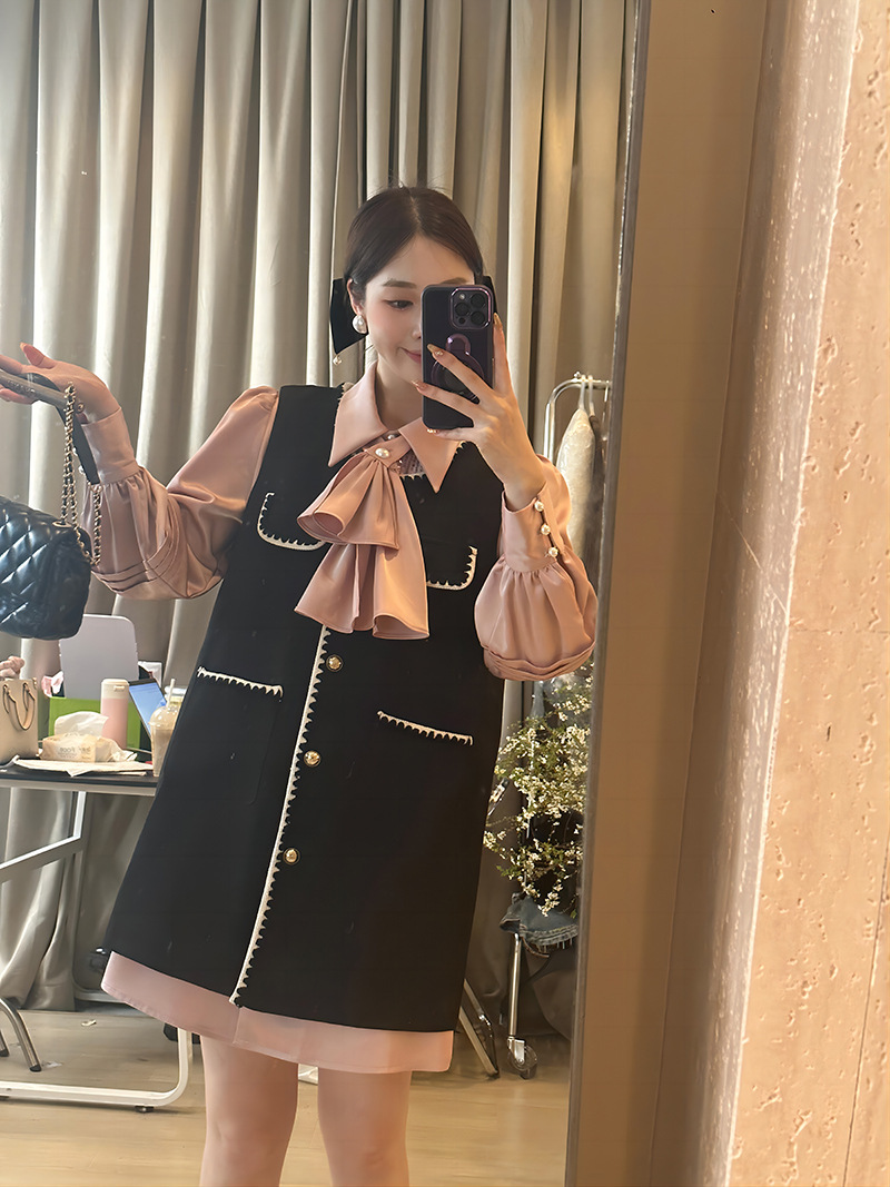 *o-ha-you*【FLKDYA1016】復古法式亮片中長版襯衫裙絲巾領泡泡袖絲滑連衣裙洋裝春秋-2色