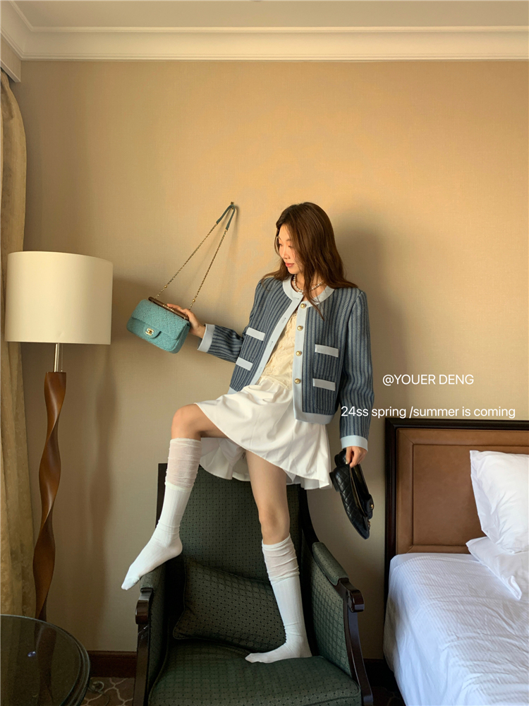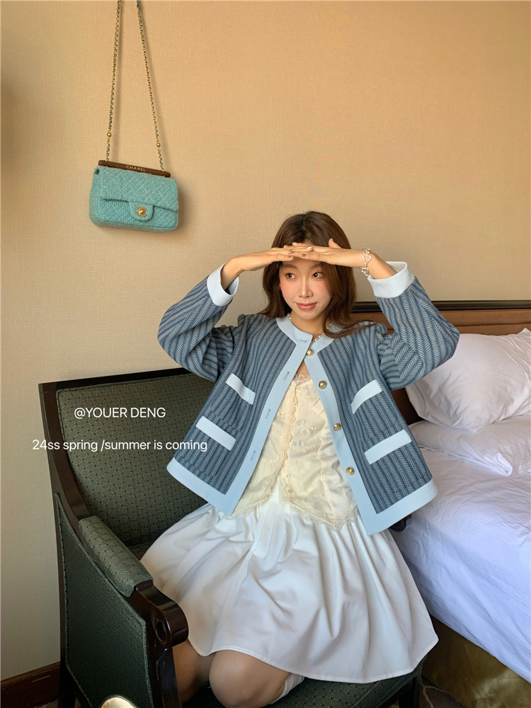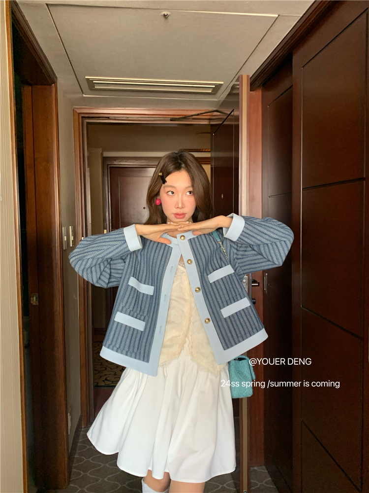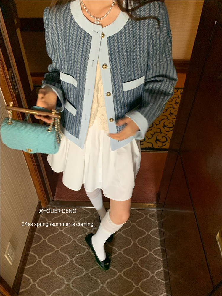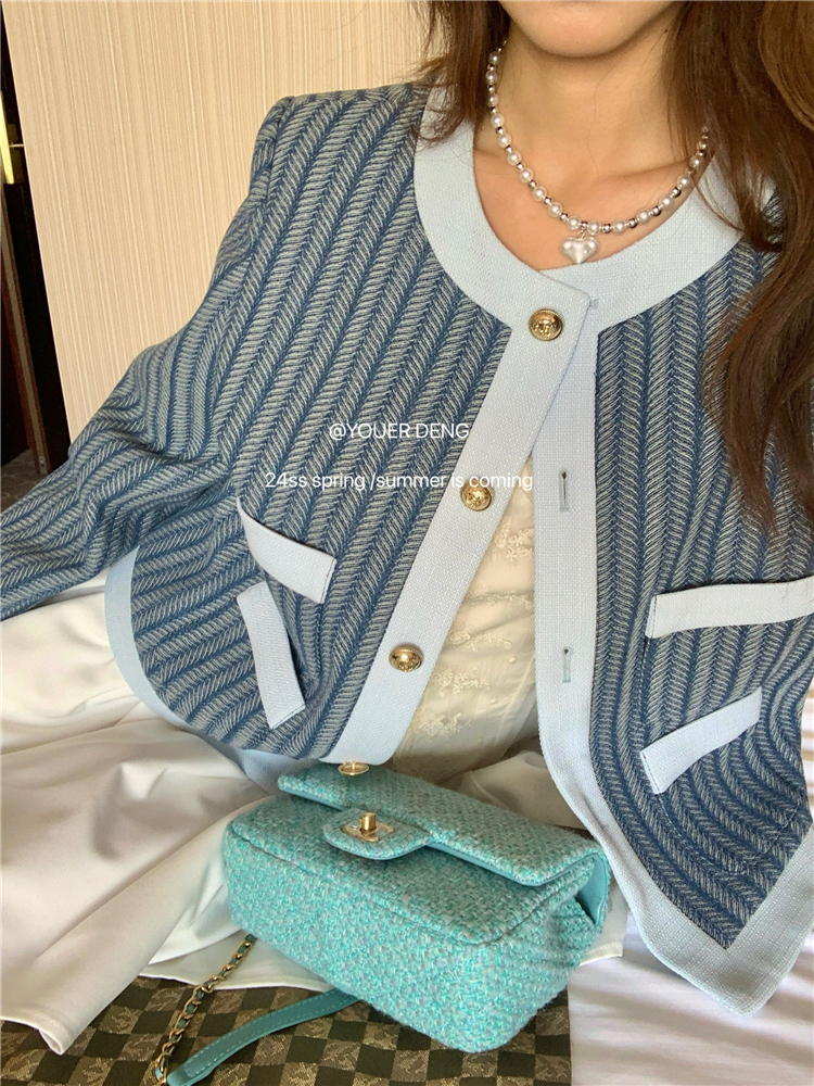 *o-ha-you*【FLKDYA605】復古法式拼接撞色人字紋外套藍色麥穗紋小香風氣質上衣