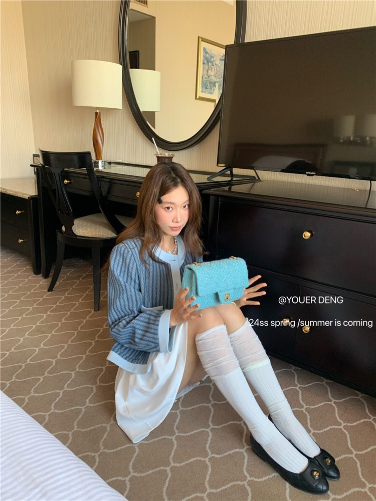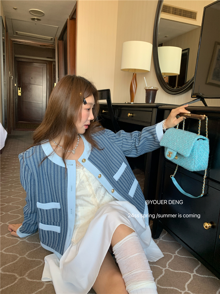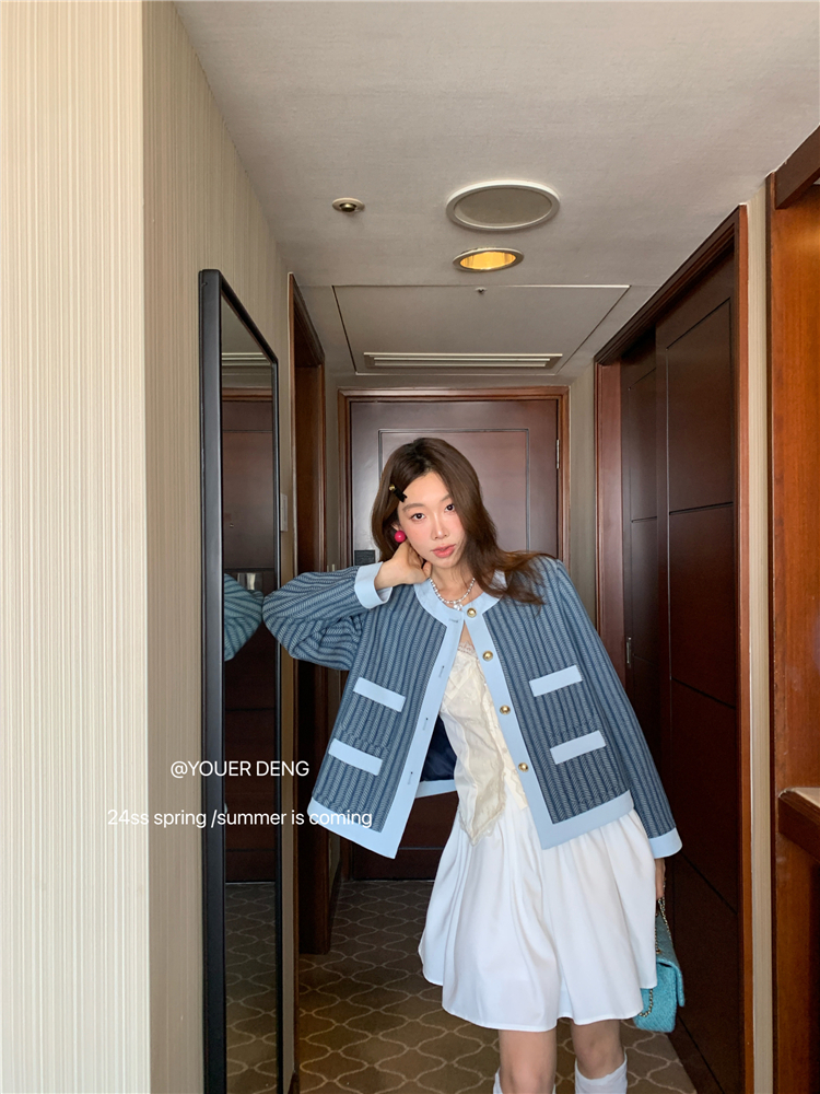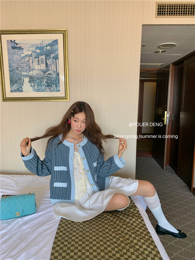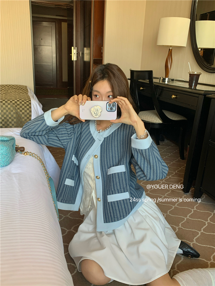 *o-ha-you*【FLKDYA605】復古法式拼接撞色人字紋外套藍色麥穗紋小香風氣質上衣